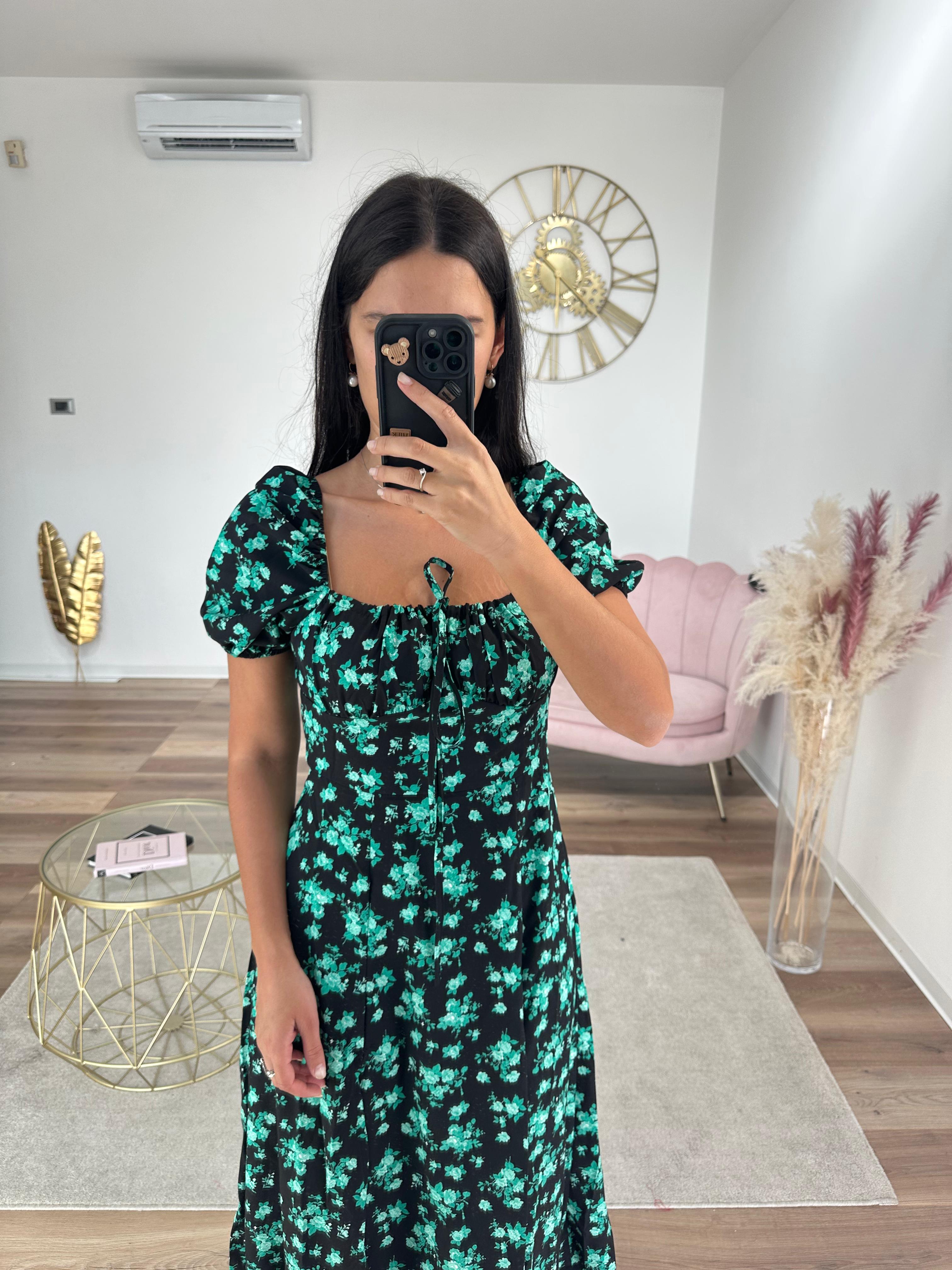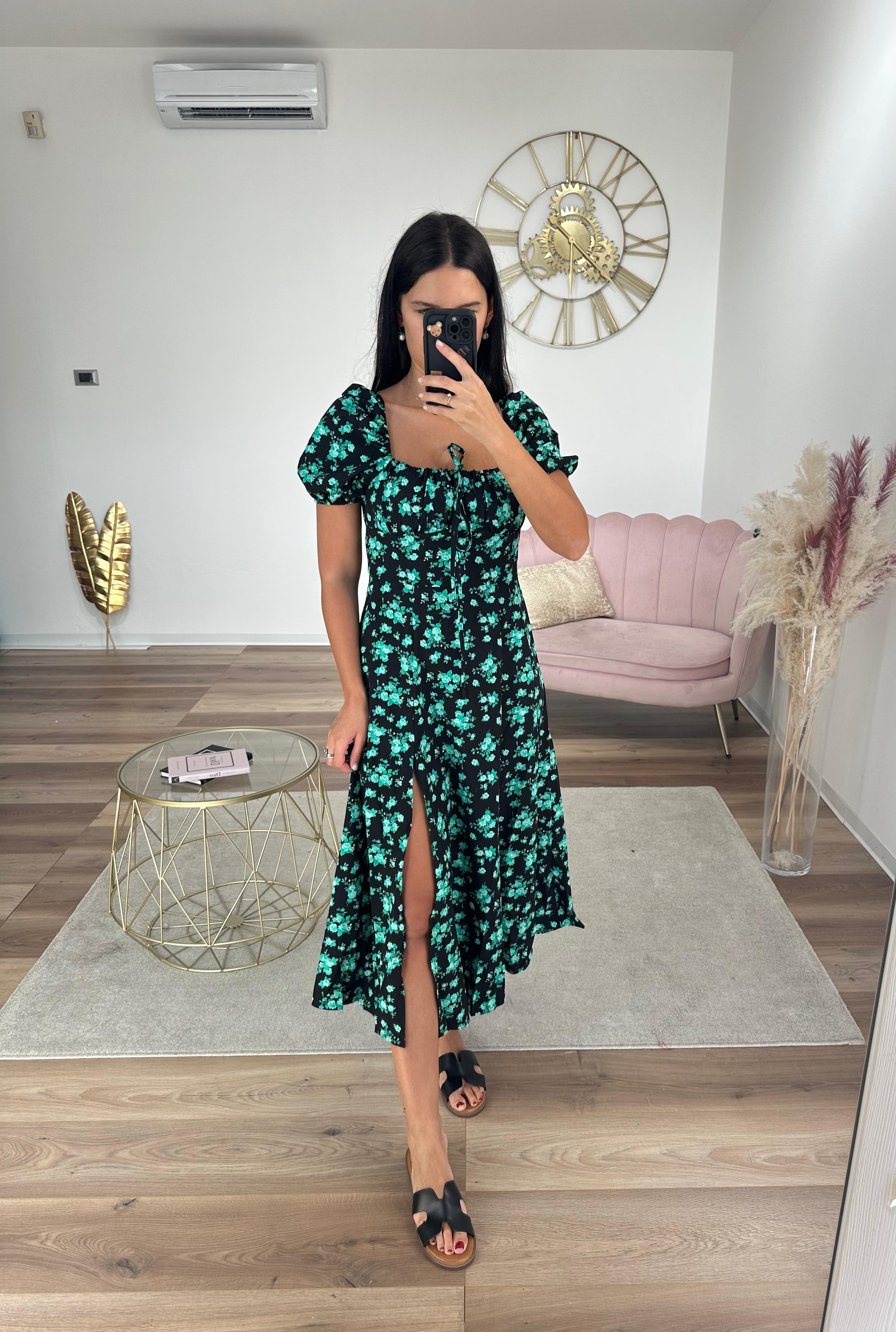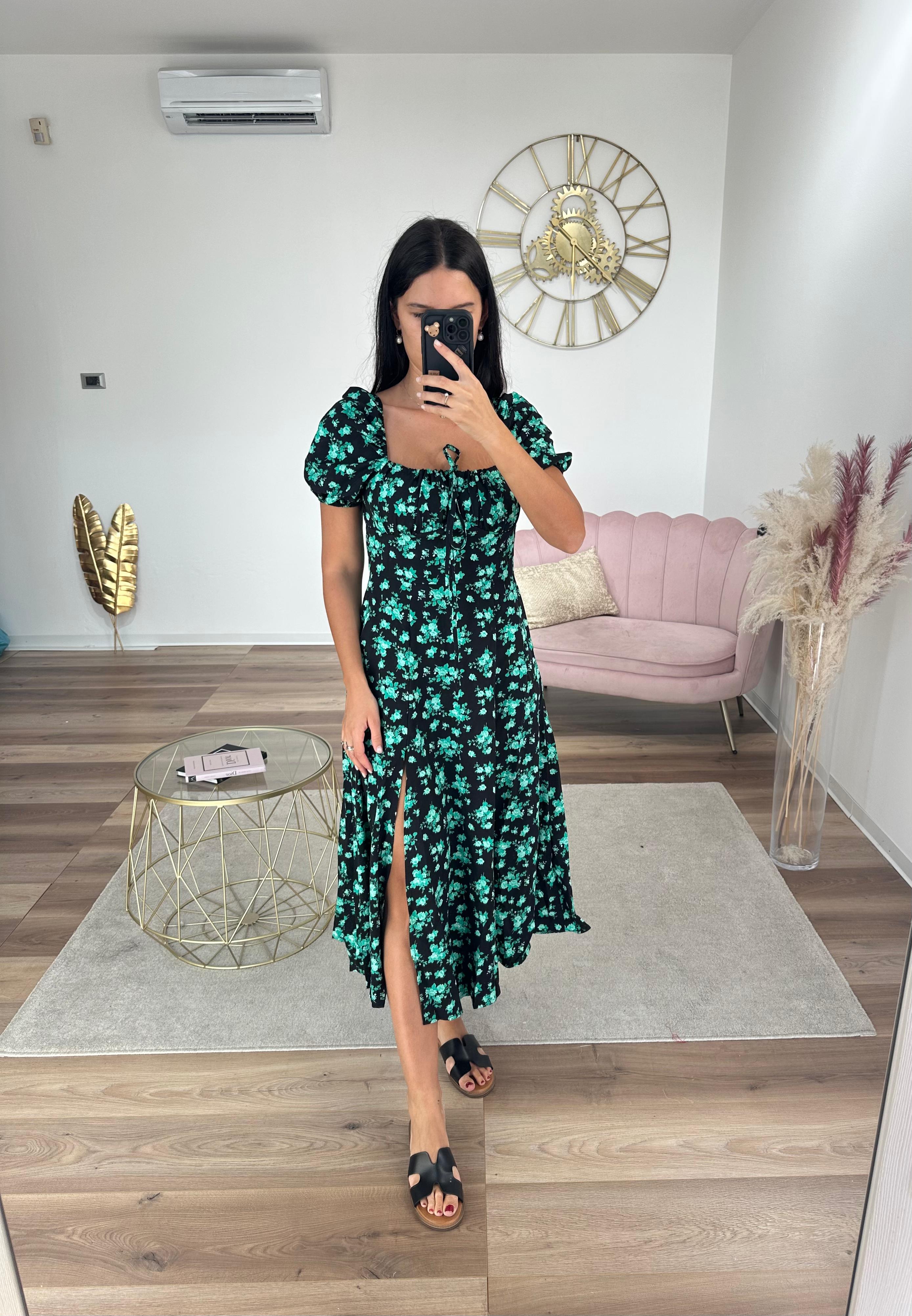 Abito midi semplice, tessuto fresco e leggero, vita elastica, spacco laterale.