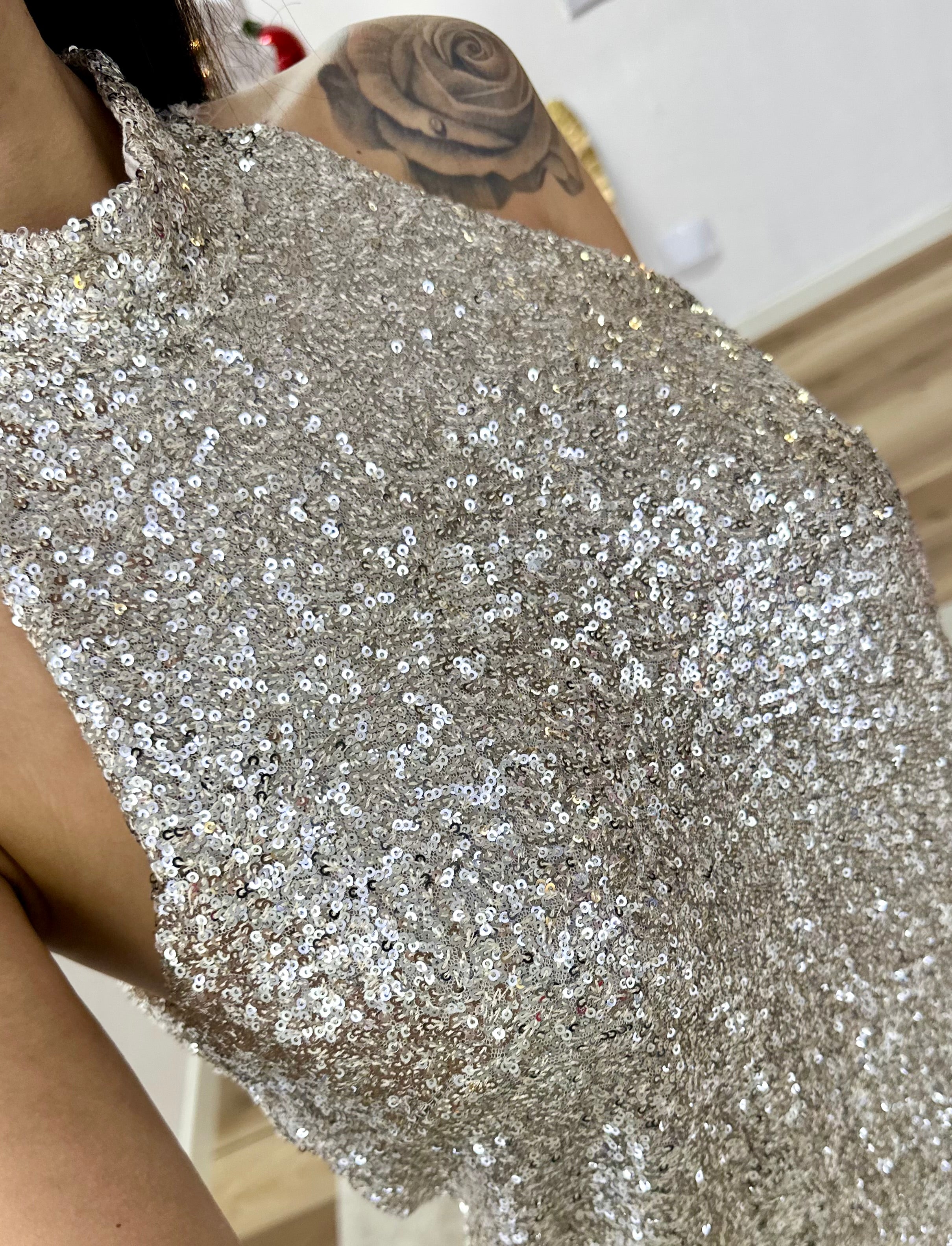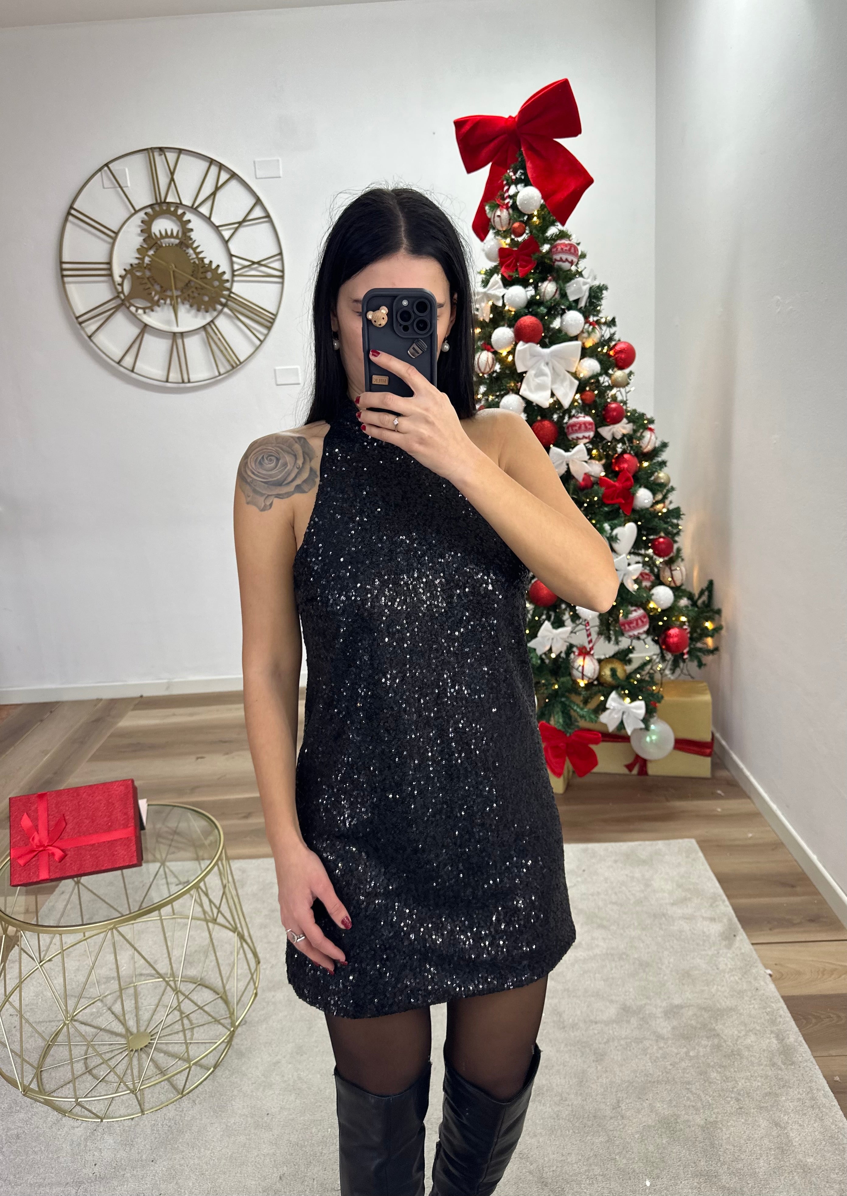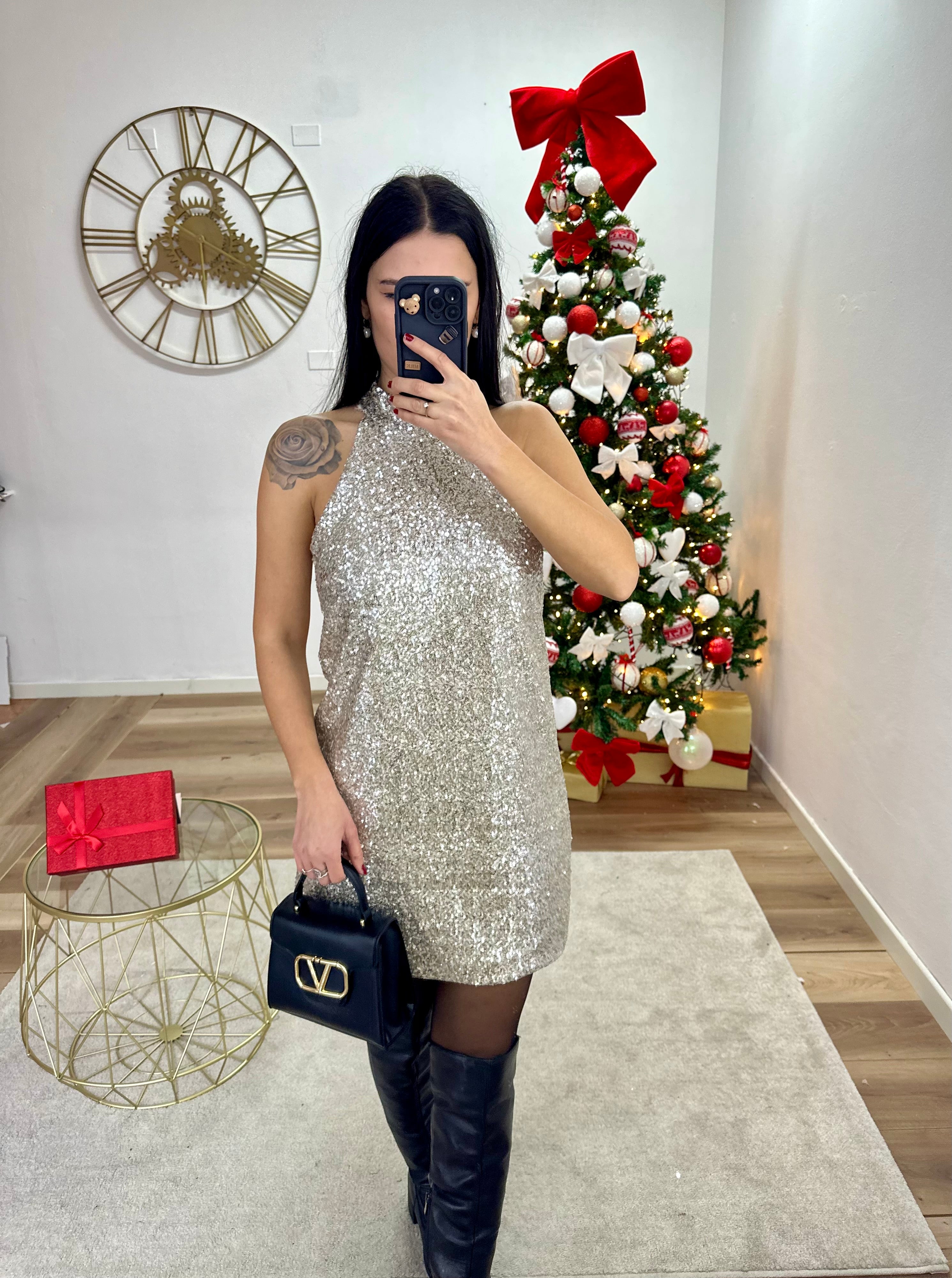 Abito con paillettes, con fodera interna, si chiude al collo con bottone