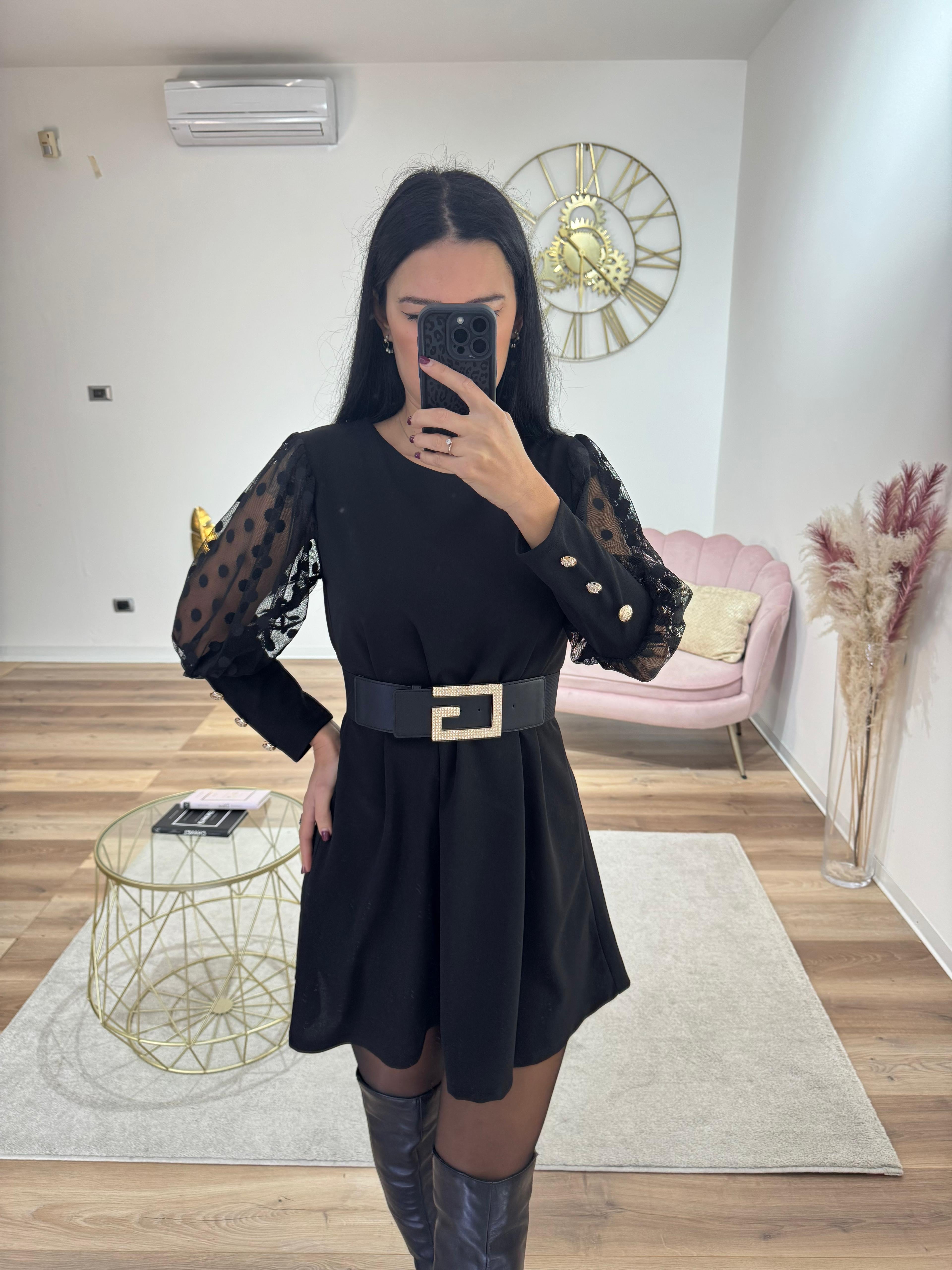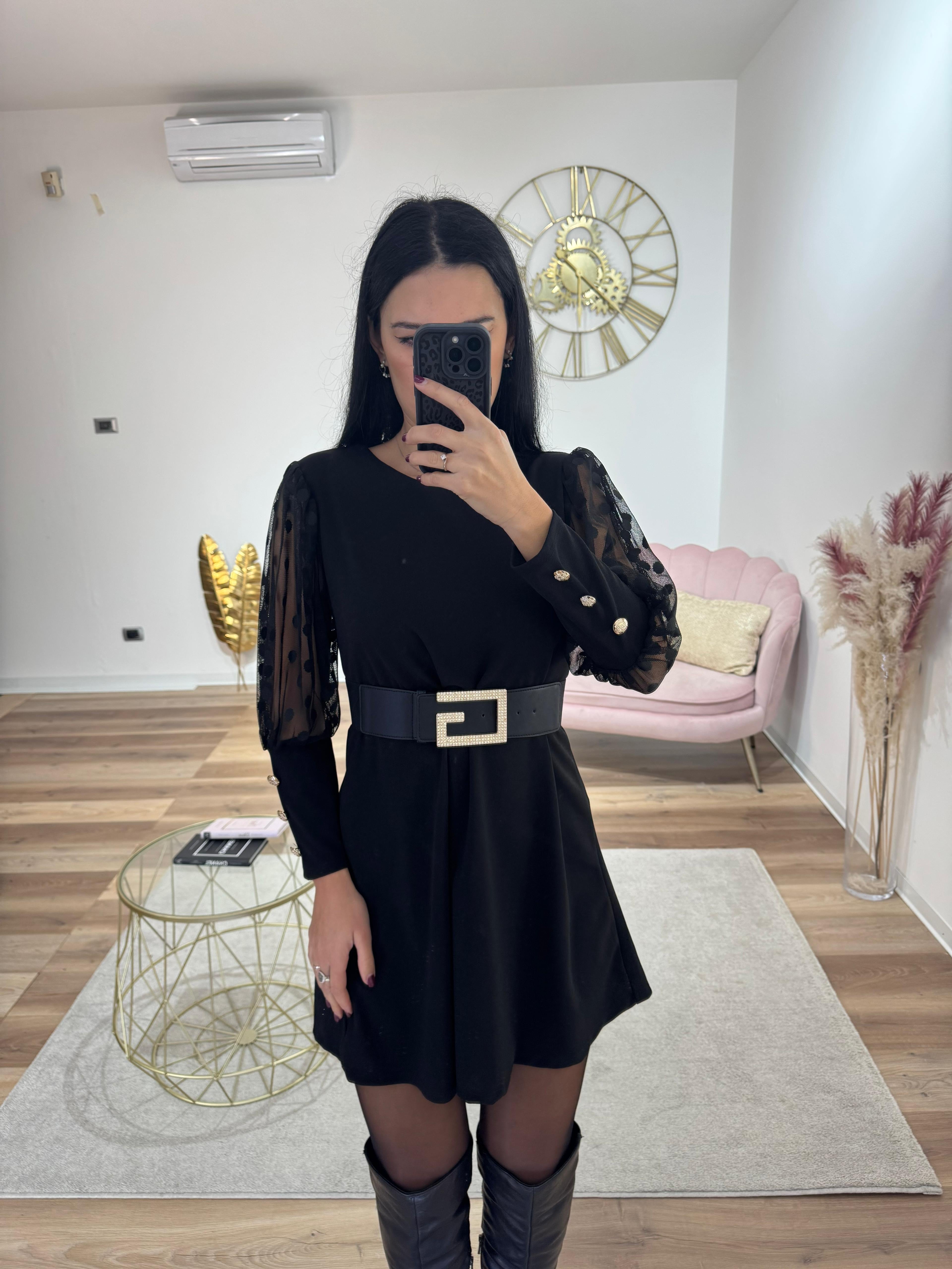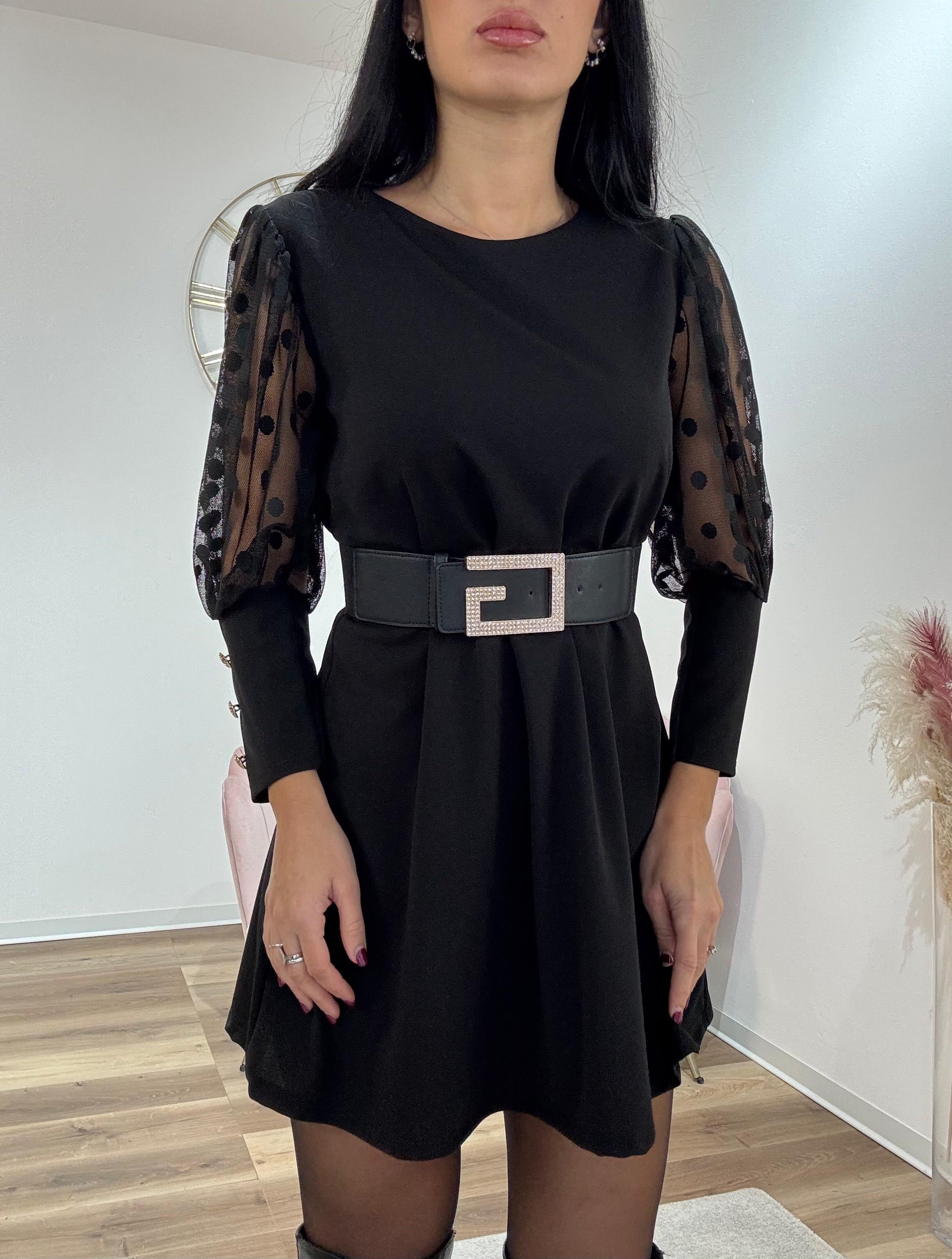 Abito con maniche velate a palloncino con pois, morbido lungo i fianchi.