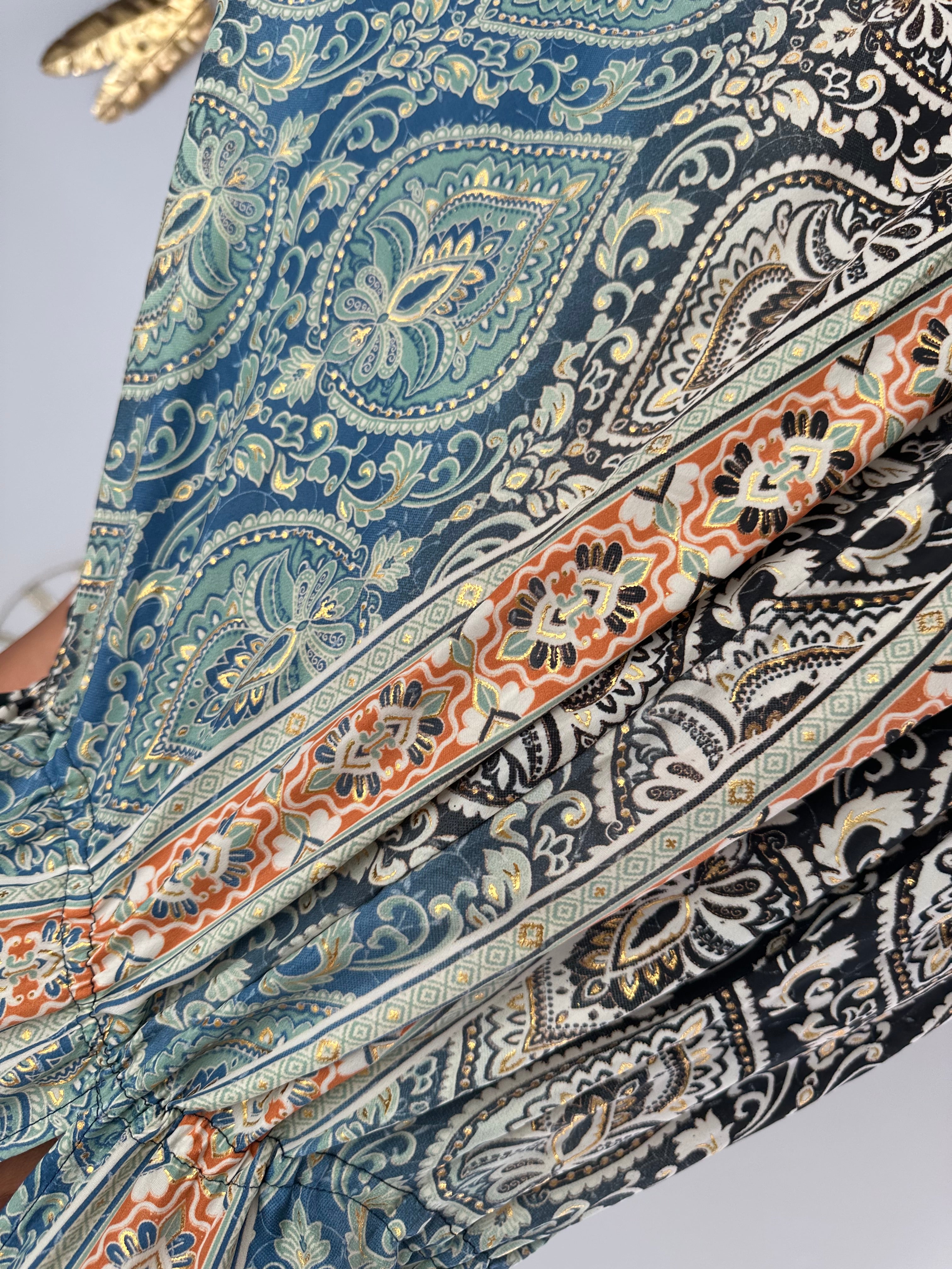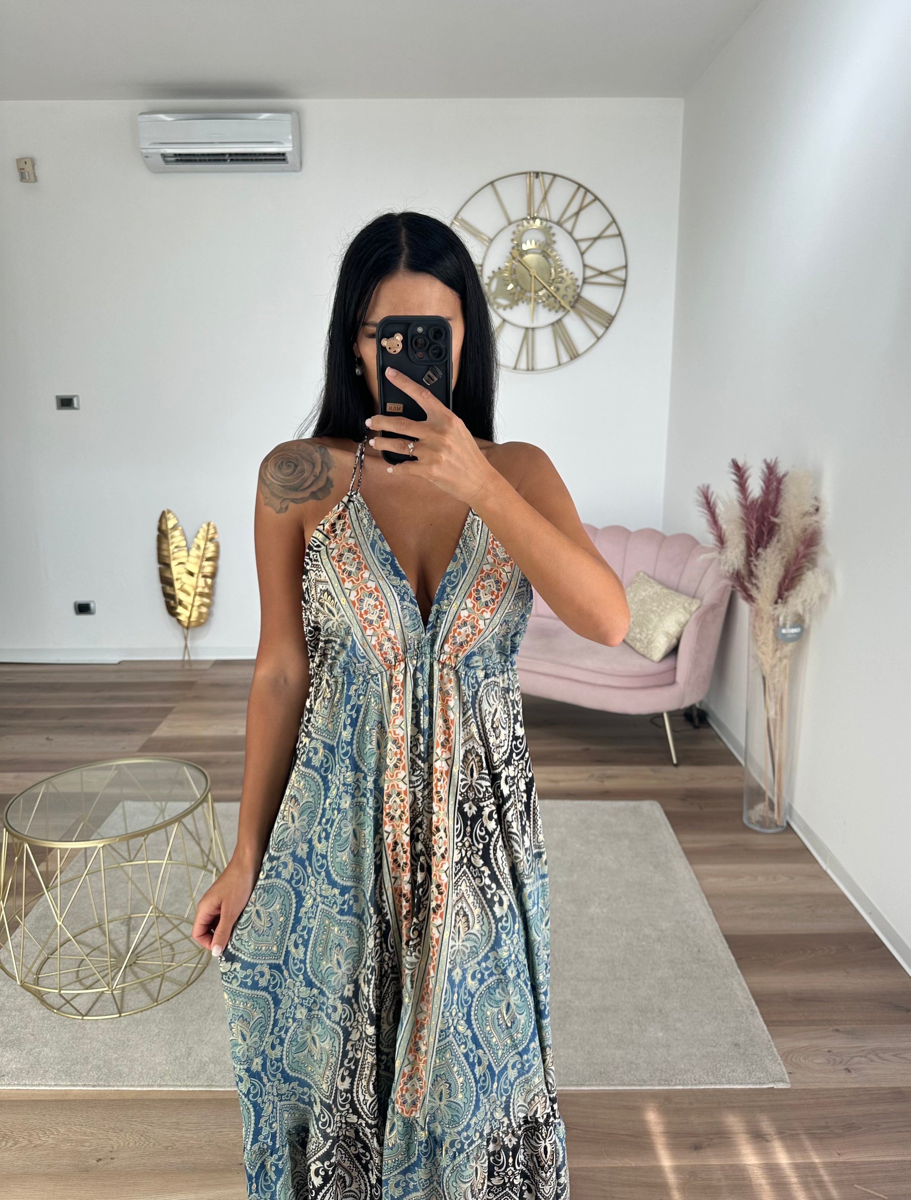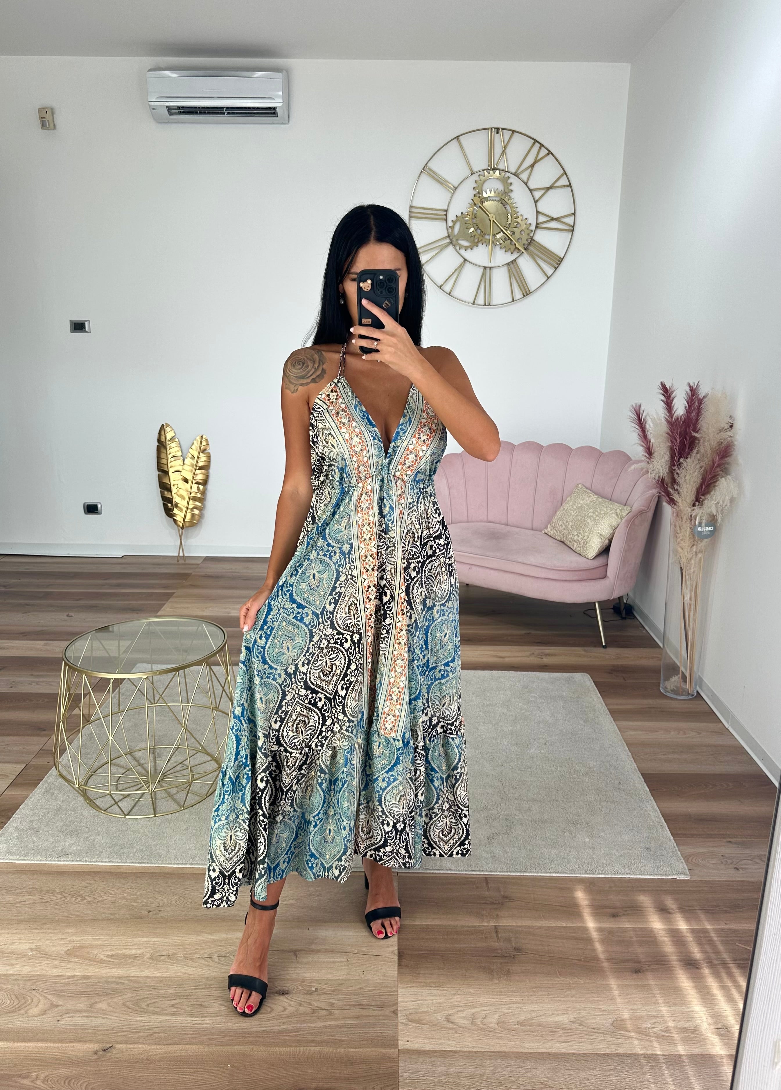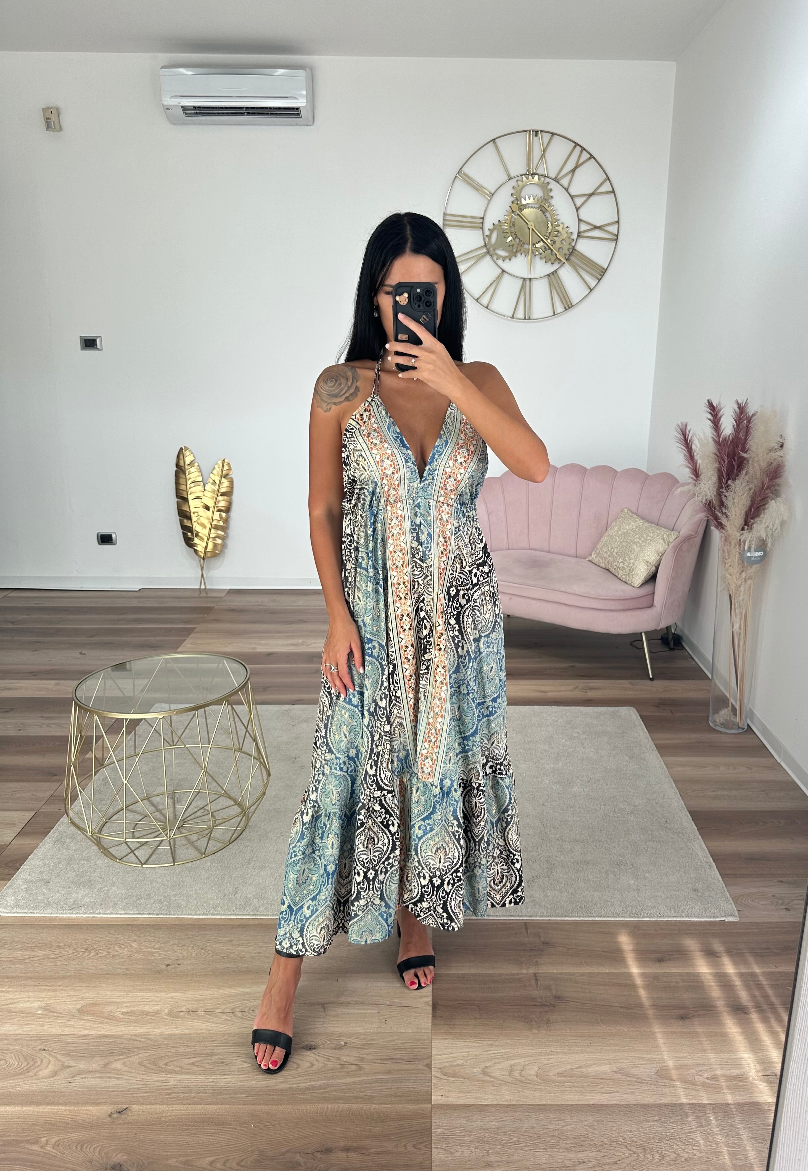 Abito con scollo profondo, si chiude Al collo, coulisse regolabile in base alla taglia, schiena scoperta
