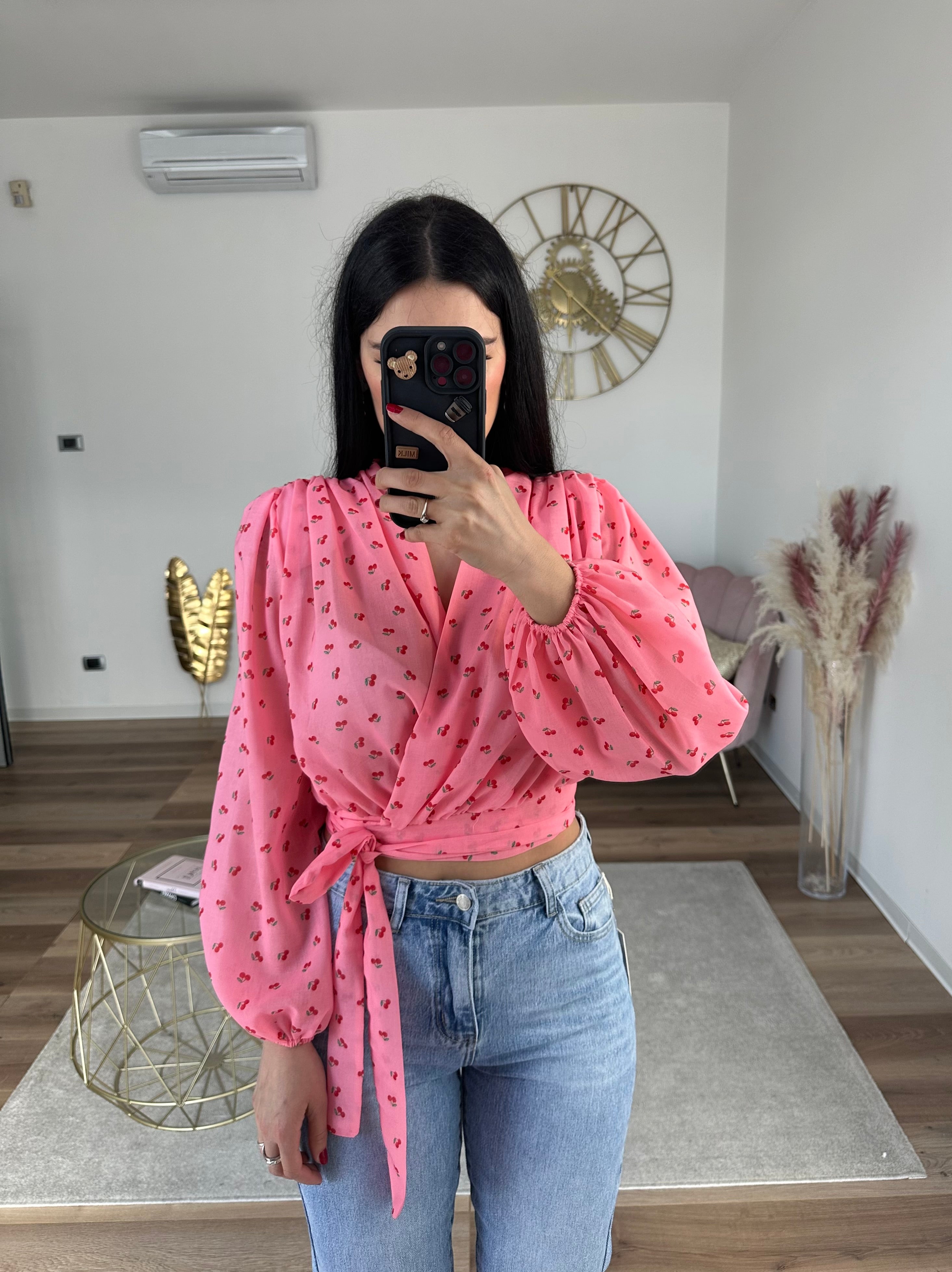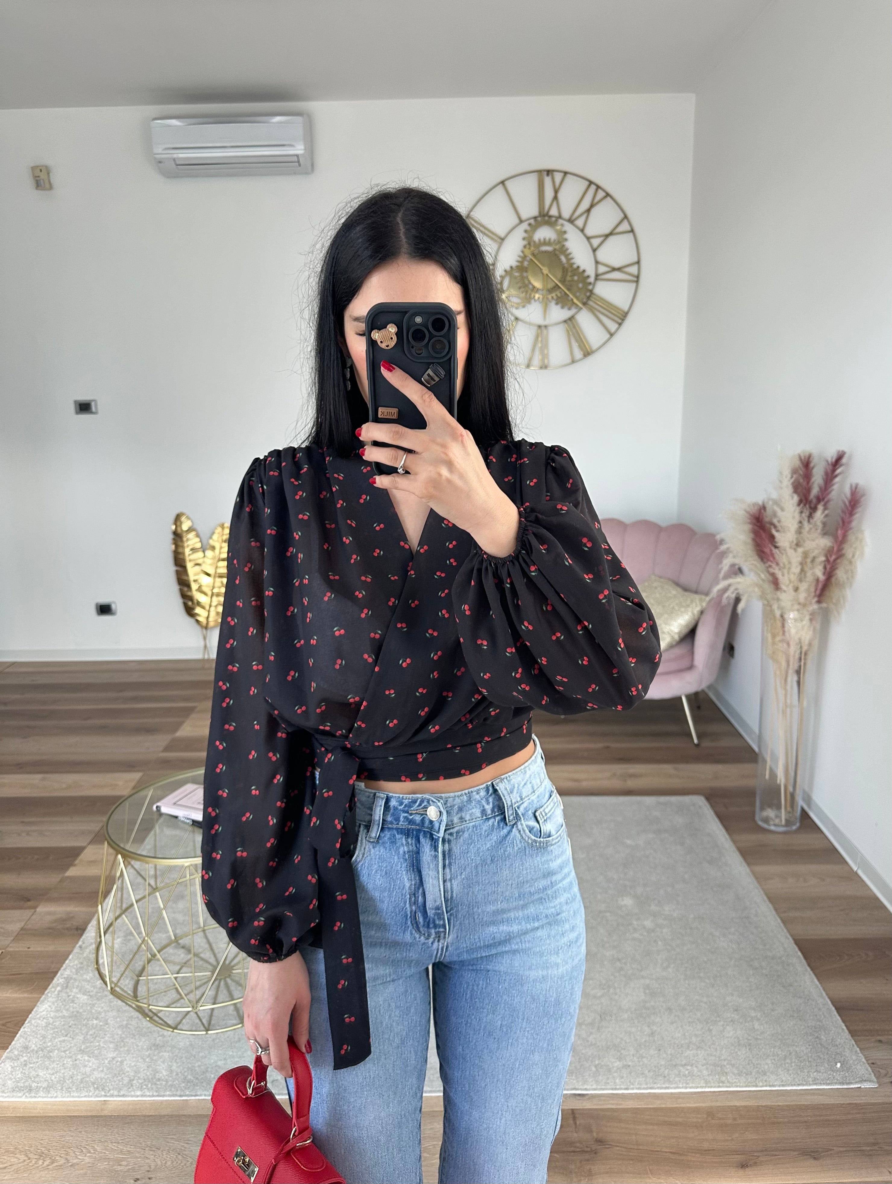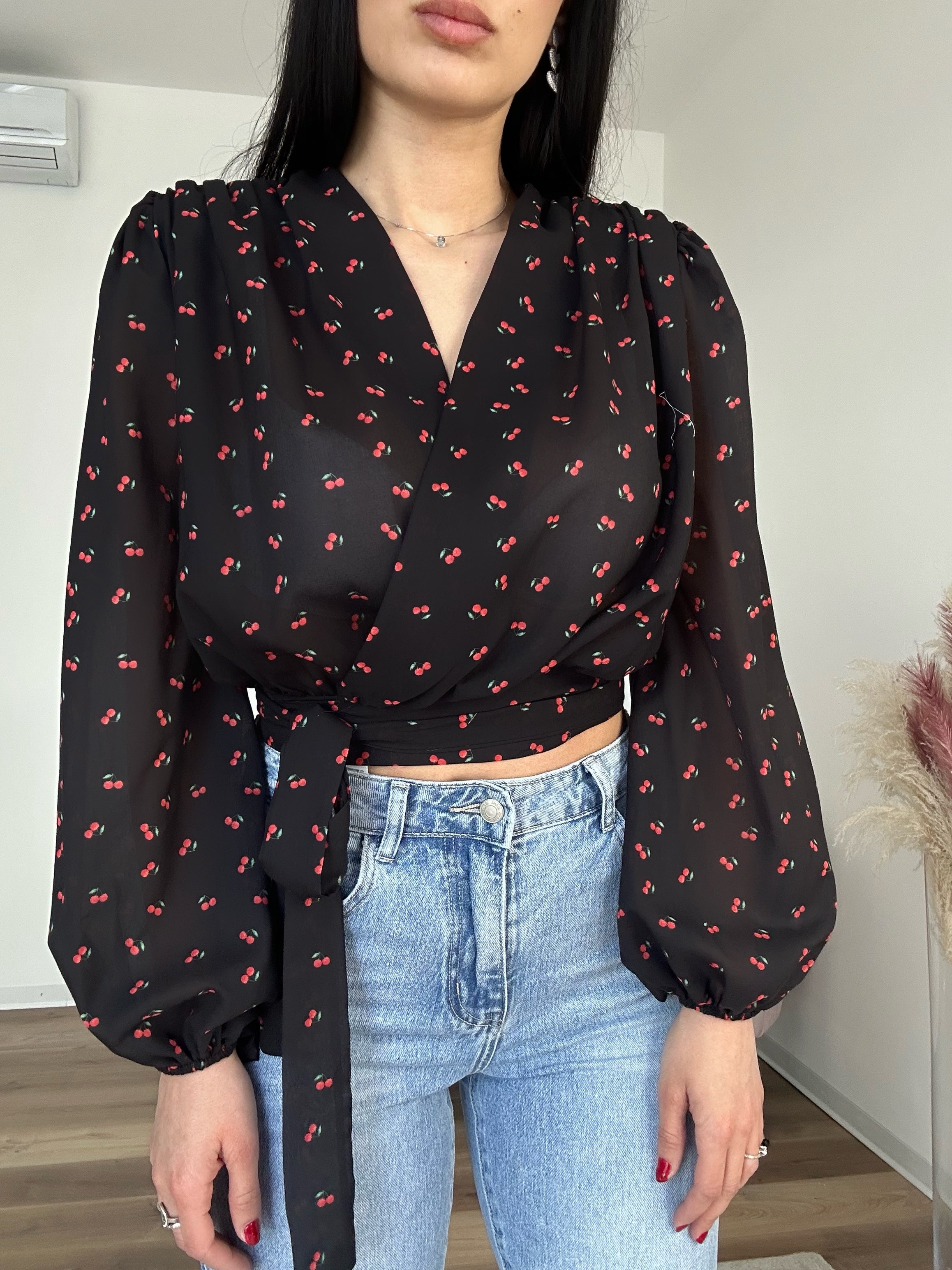 Blusa con fantasia ciliegie, si chiude in base alla taglia, maniche a sbuffo.