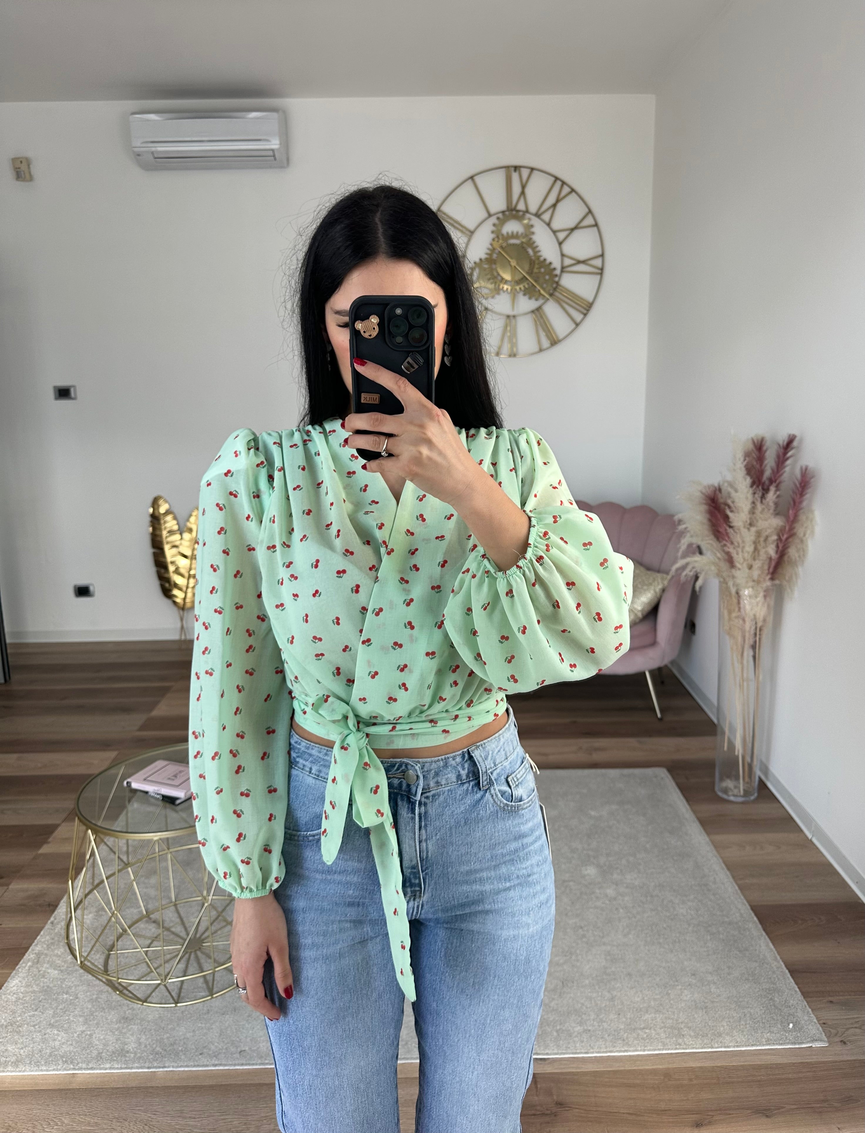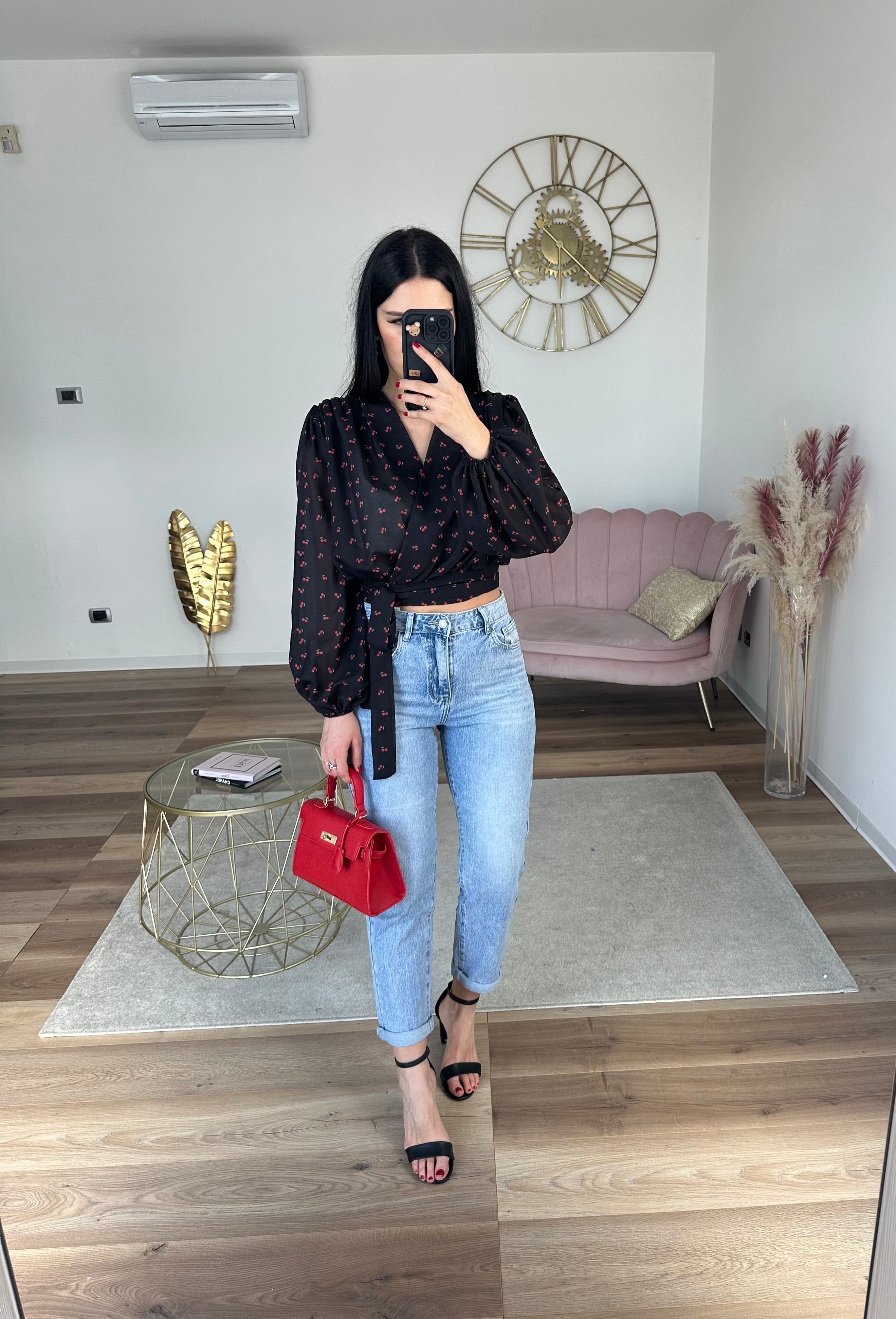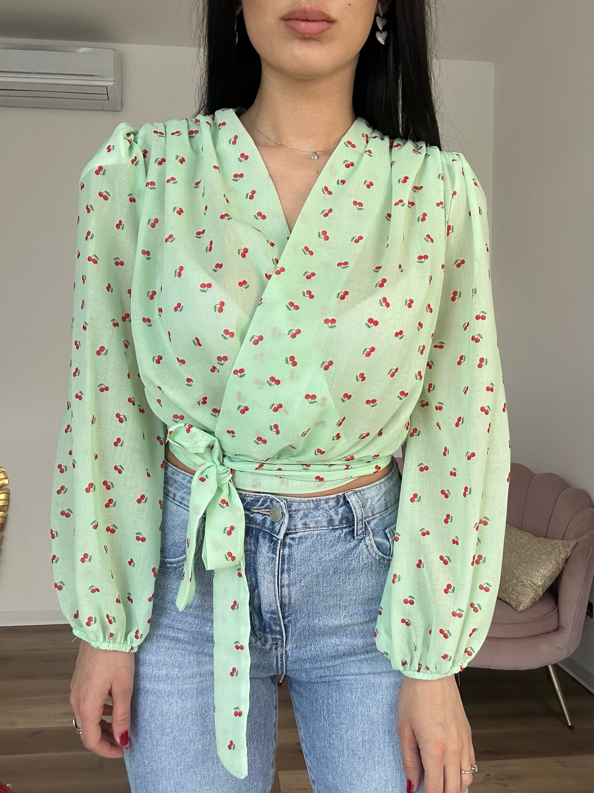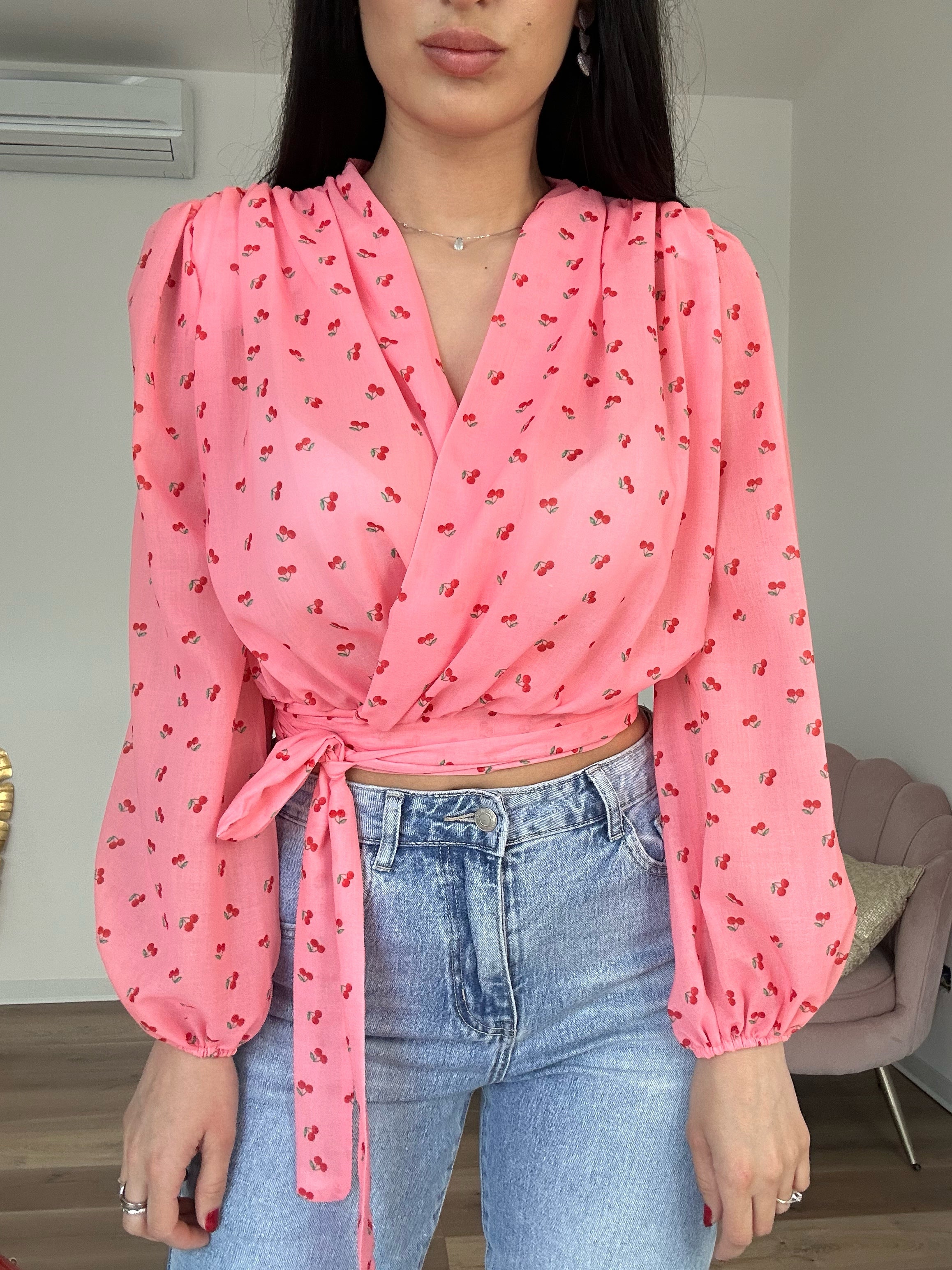 Blusa con fantasia ciliegie, si chiude in base alla taglia, maniche a sbuffo.