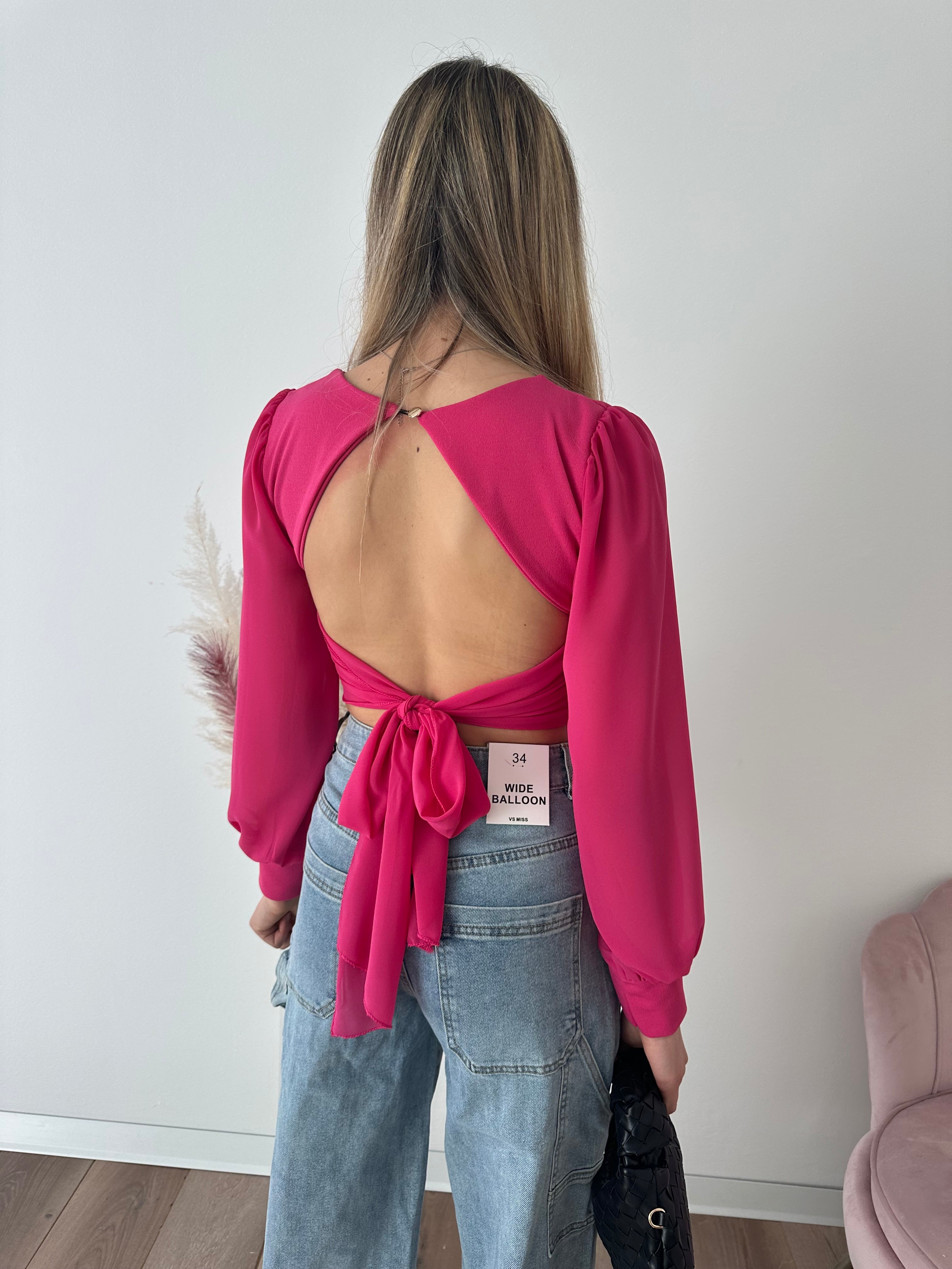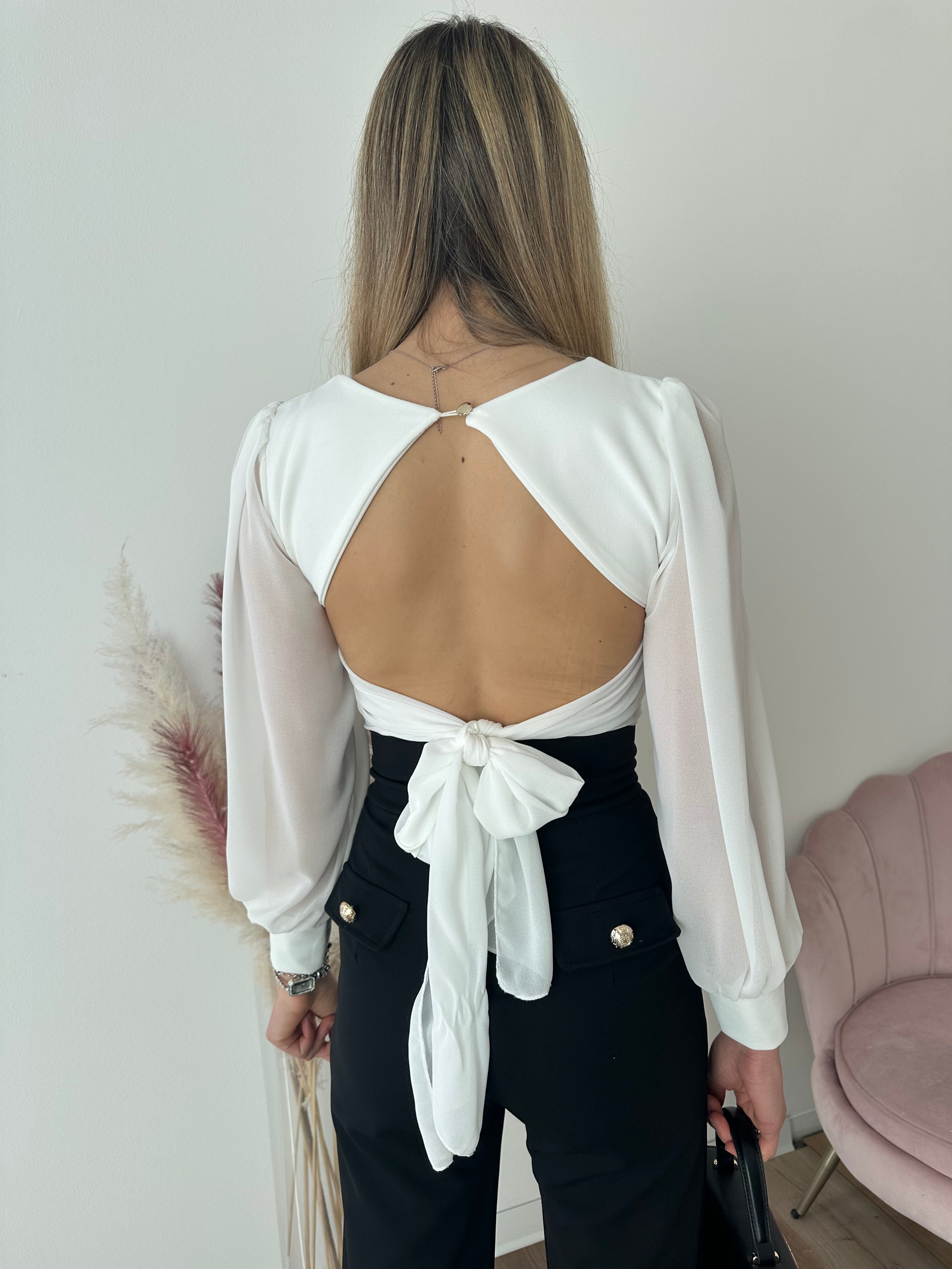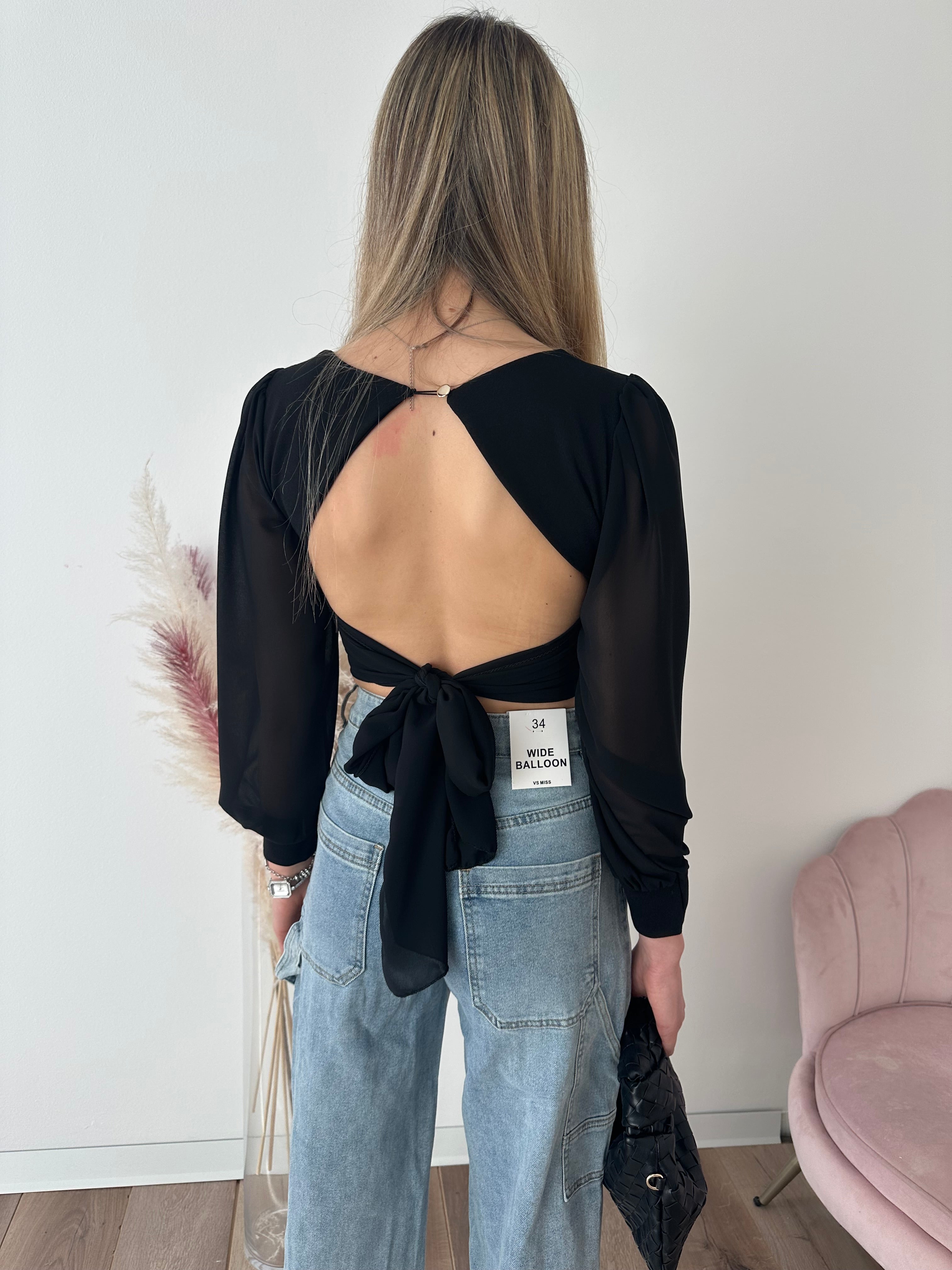 Blusa con maniche a sbuffo leggermente velate, lunghezza crop, coppe preformate, chiusura sul retro con fiocco
