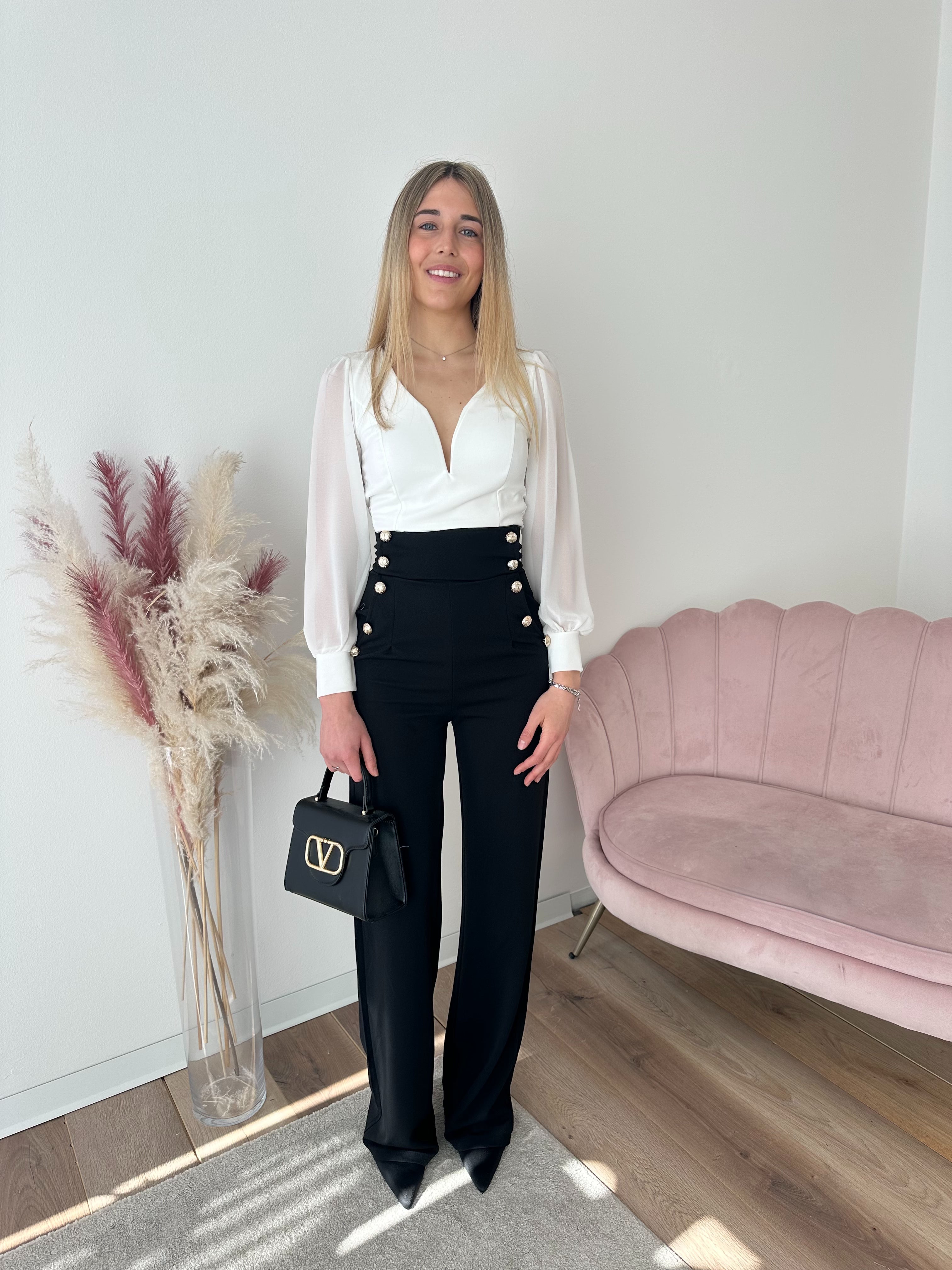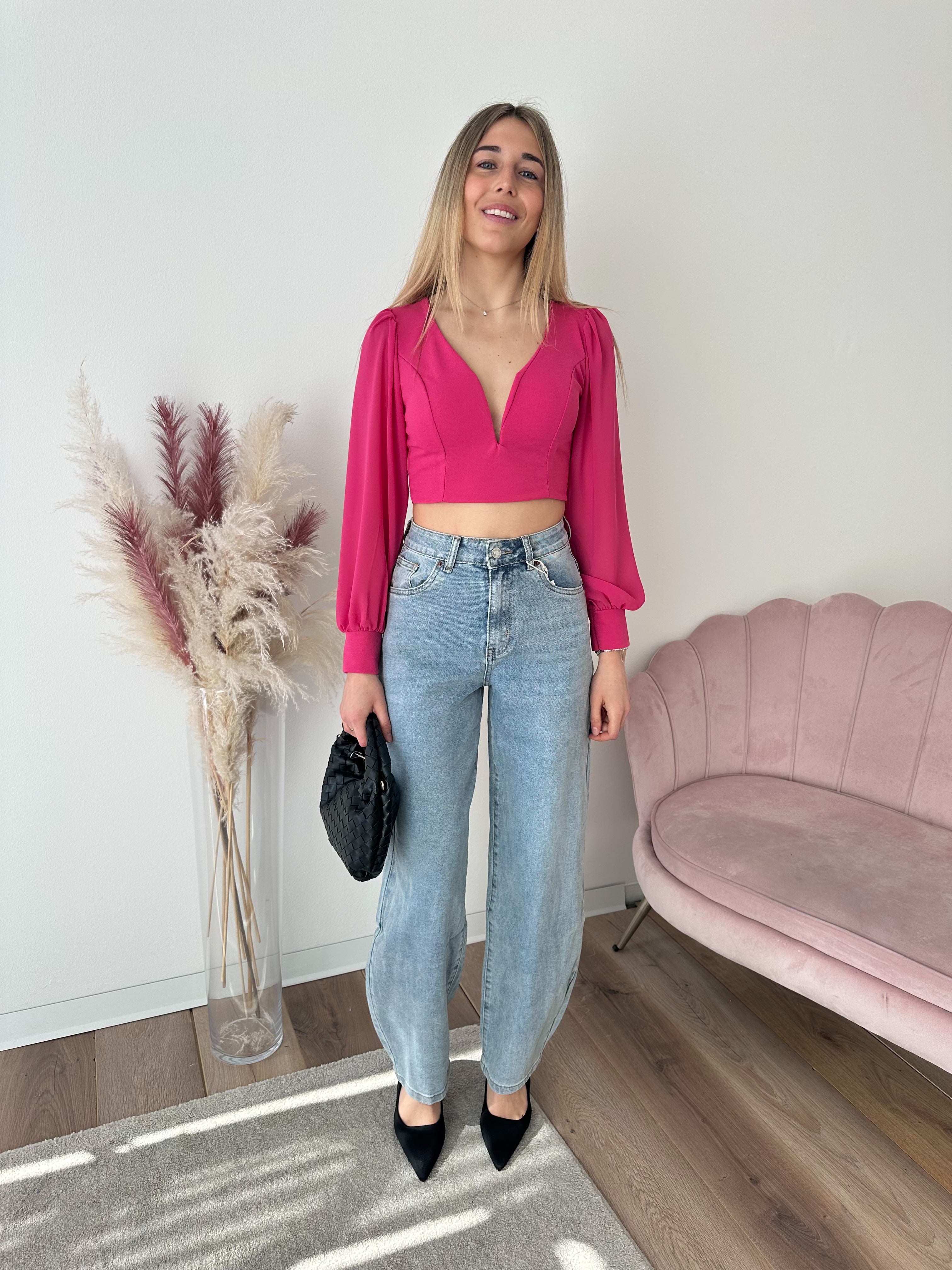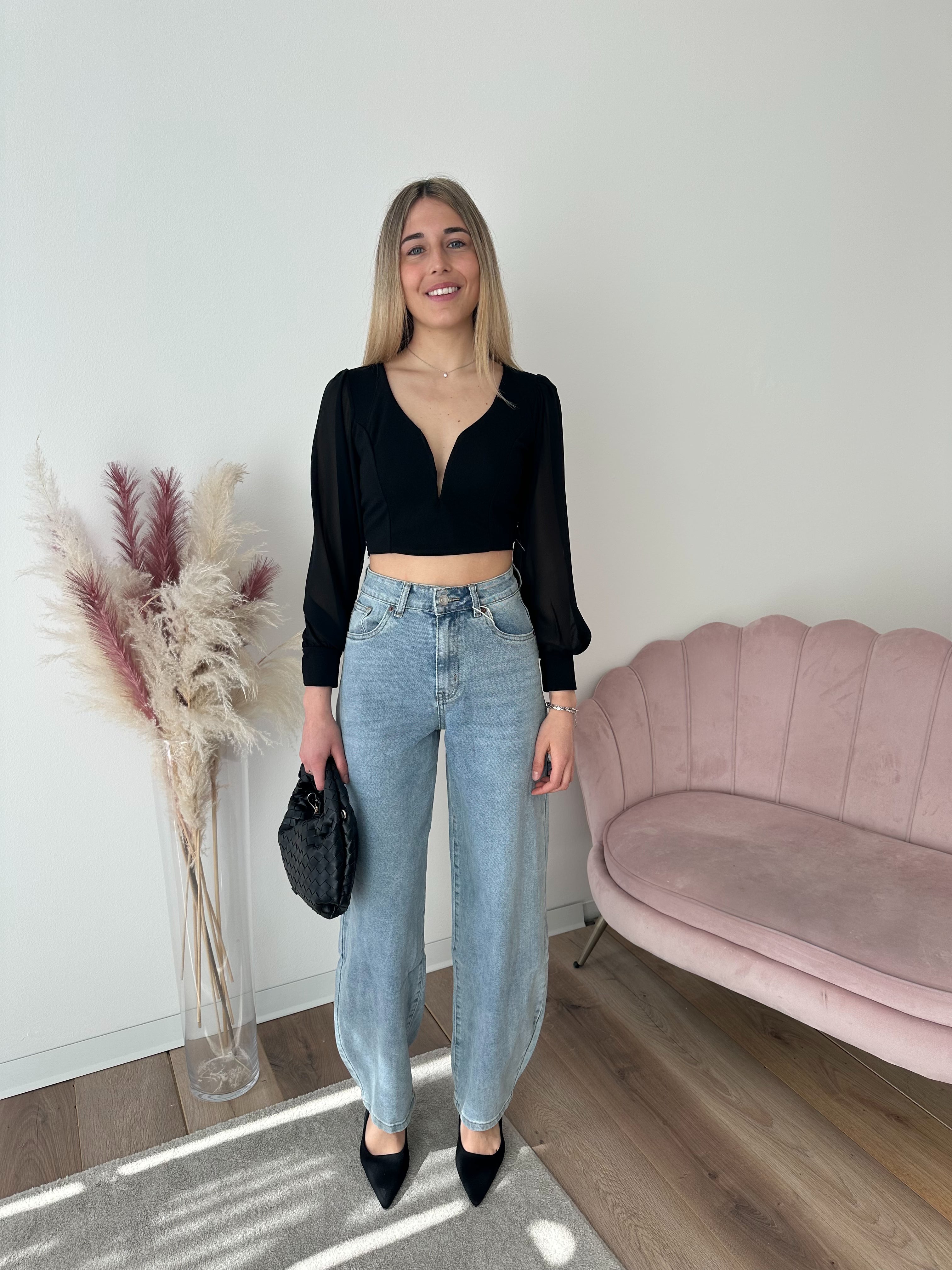 Blusa con maniche a sbuffo leggermente velate, lunghezza crop, coppe preformate, chiusura sul retro con fiocco