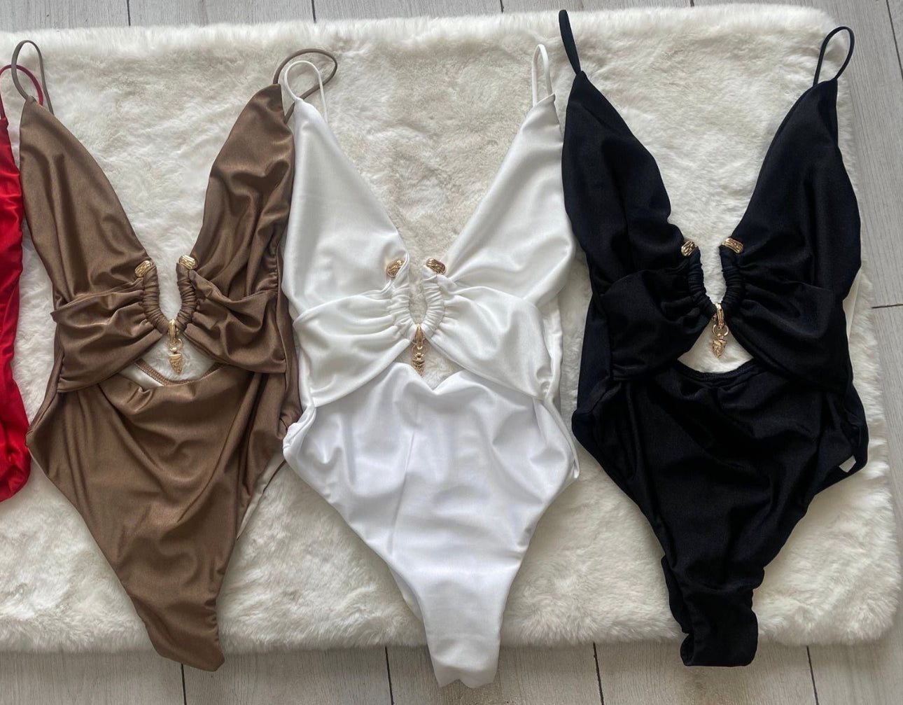 Body/costume, non ha le coppe preformate, è elasticizzato, gioiello dorato sul davanti.