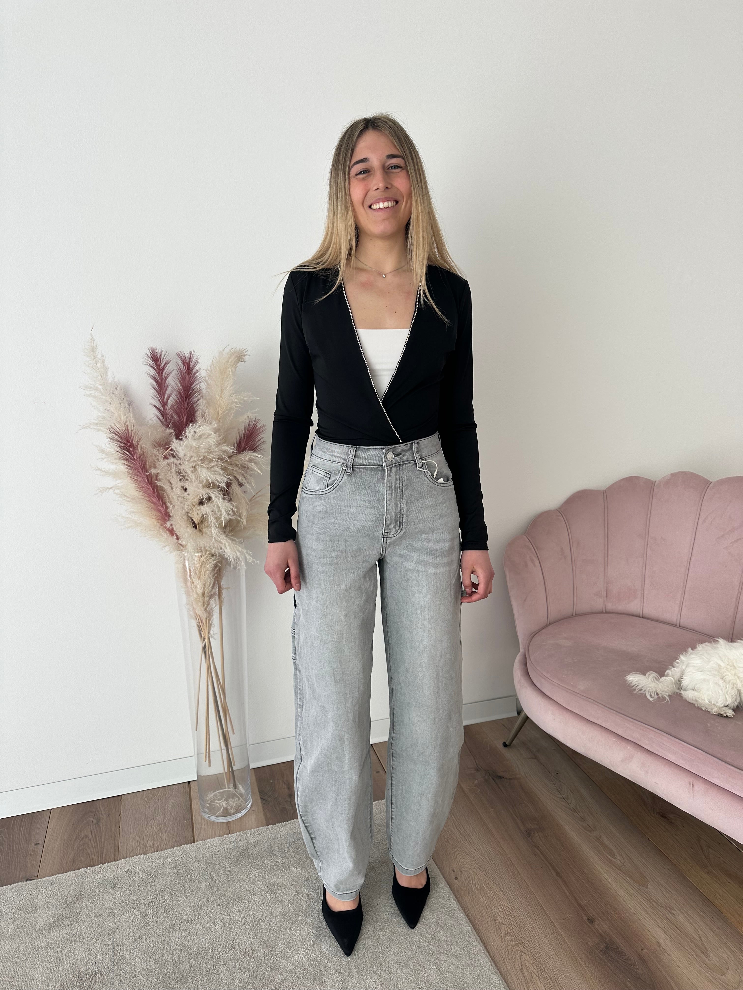 Body elasticizzato con scollo profondo impreziosito da strass (la fascia non è inclusa)