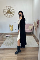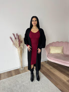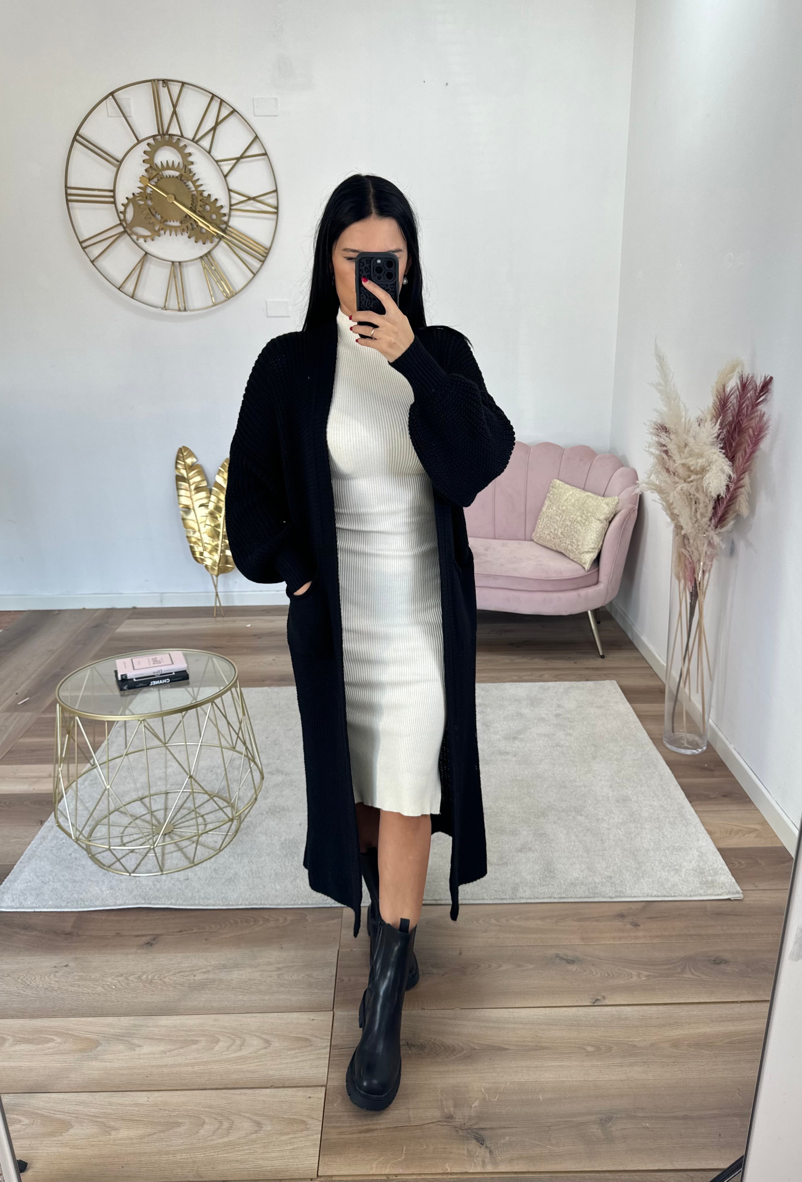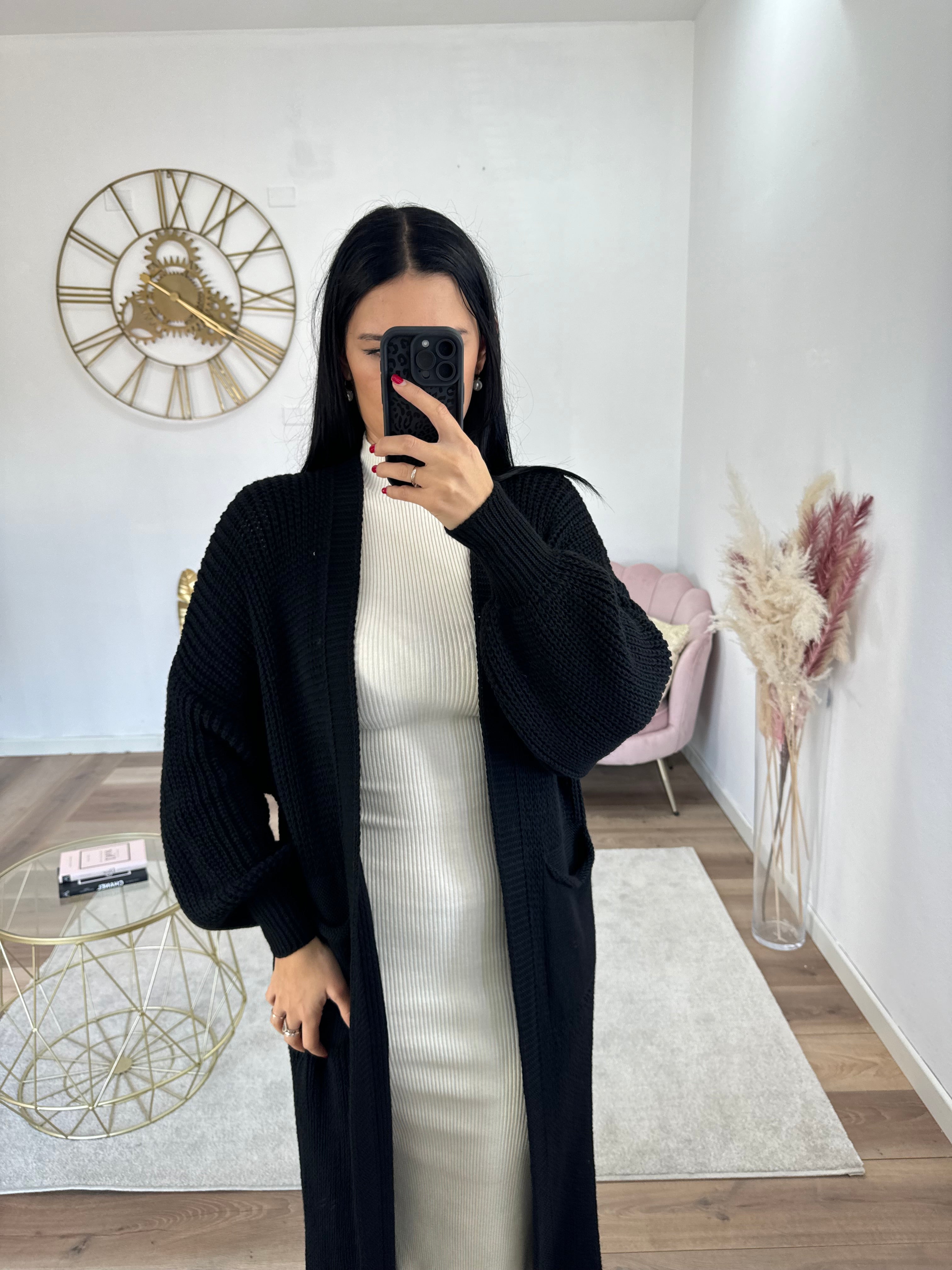 Cardigan nero, morbido e caldo con tasche e maniche a sbuffo.