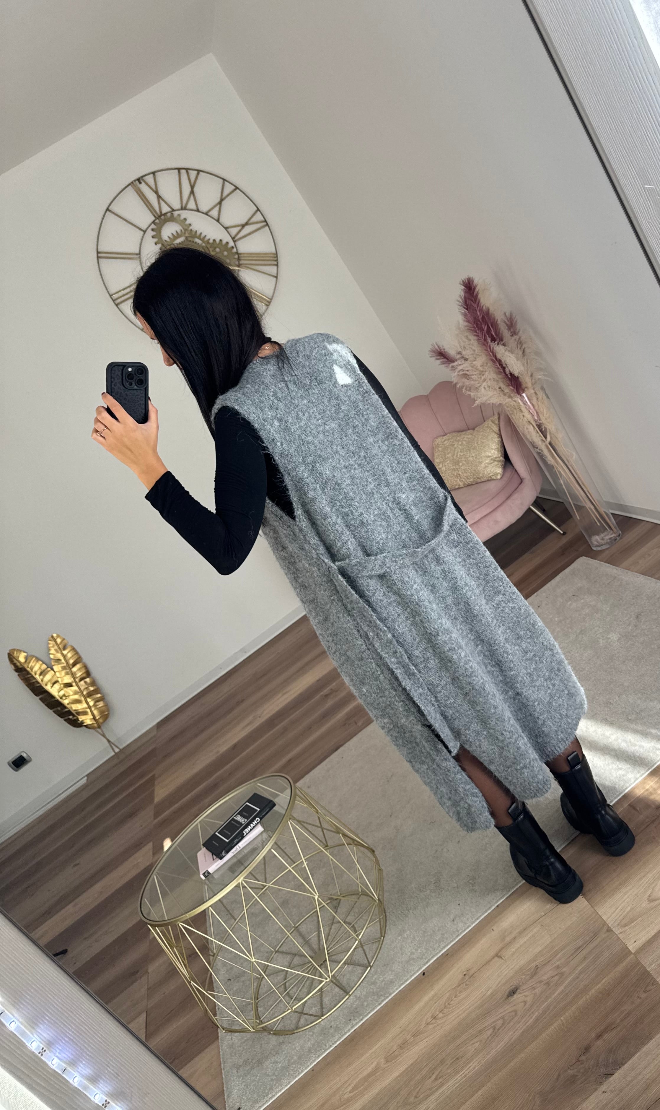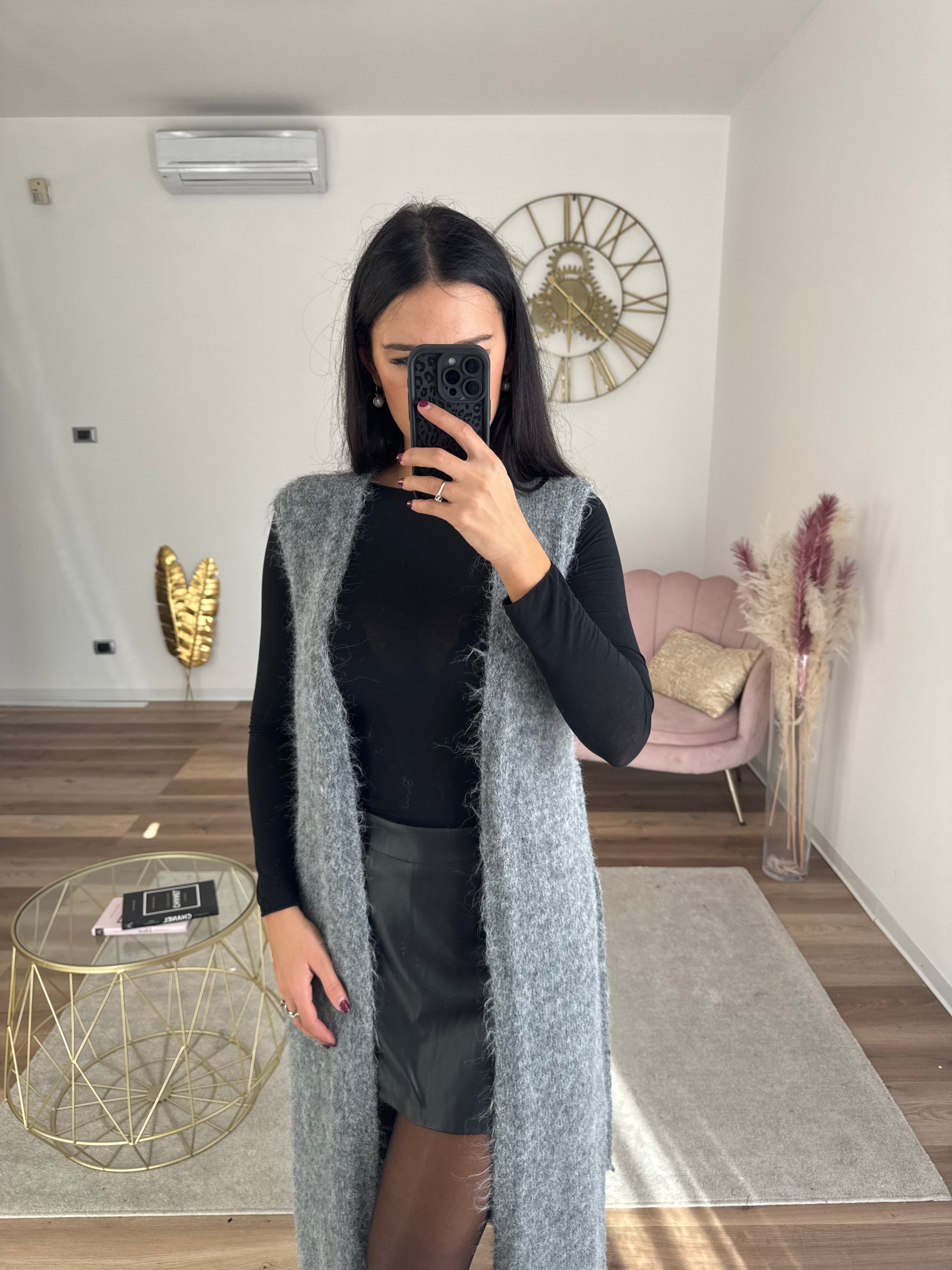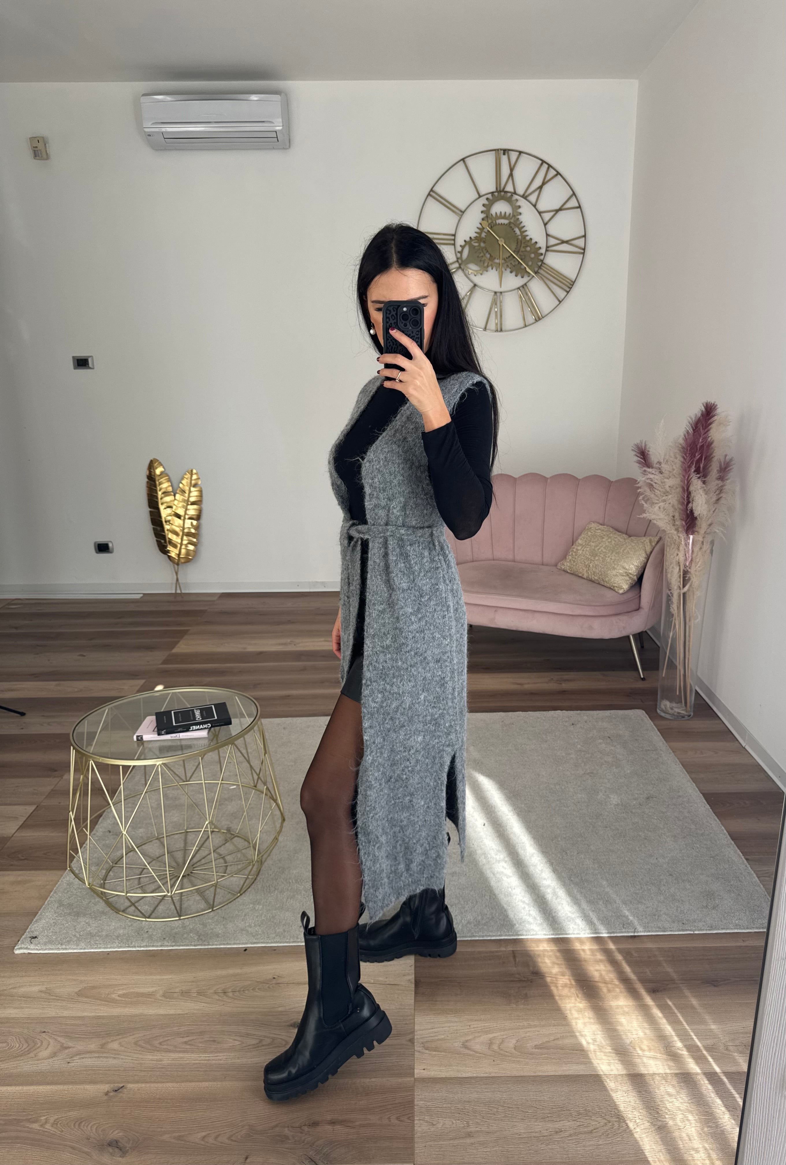 Cardigan lungo caldo e morbido , smanicato, completo di cintura, spacco, elasticizzato