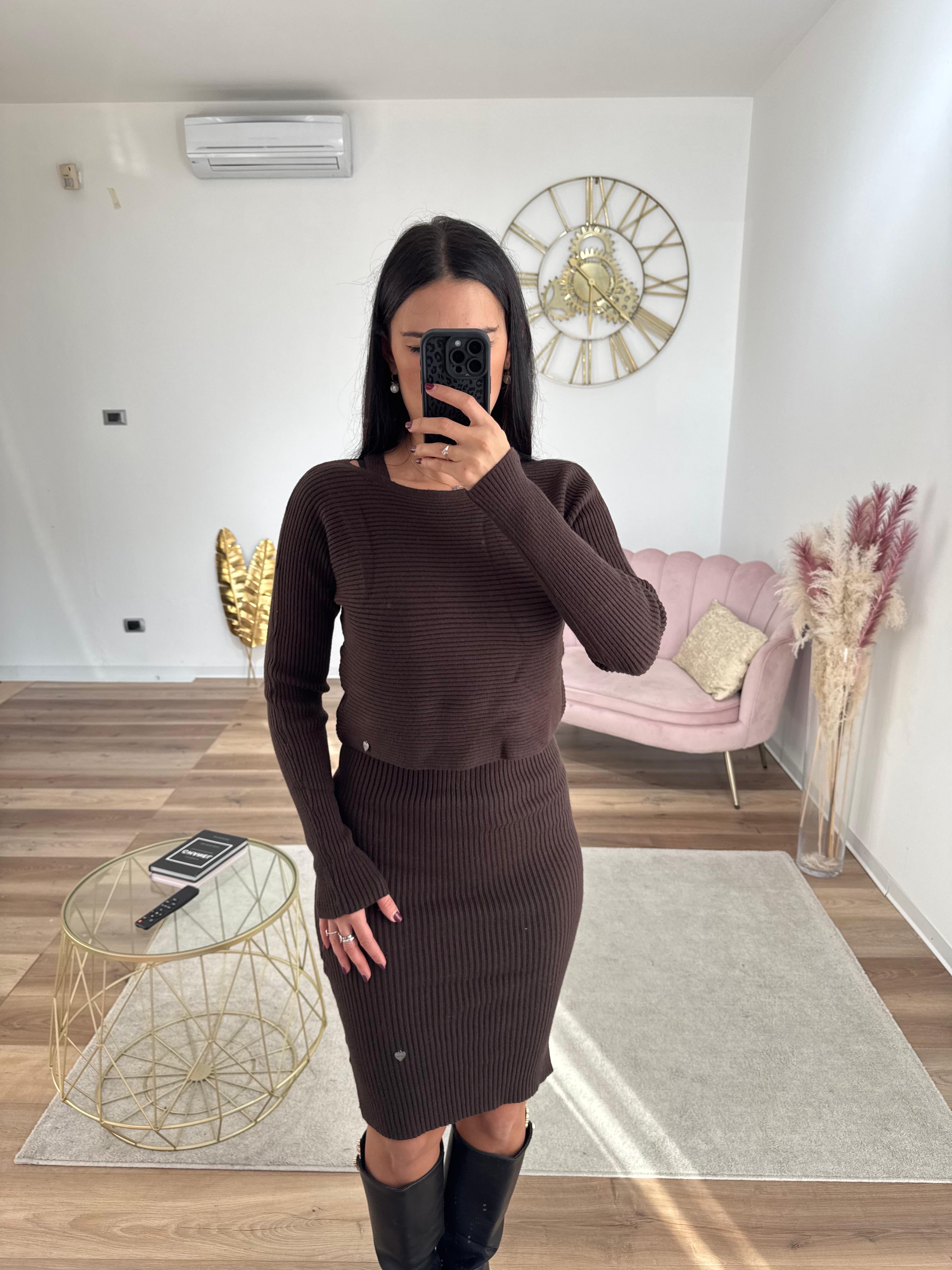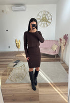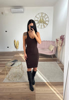 Abito modello midi aderente ma molto elasticizzato con Pull lunghezza crop, tessuto a costine, scollo a v davanti e dietro.
