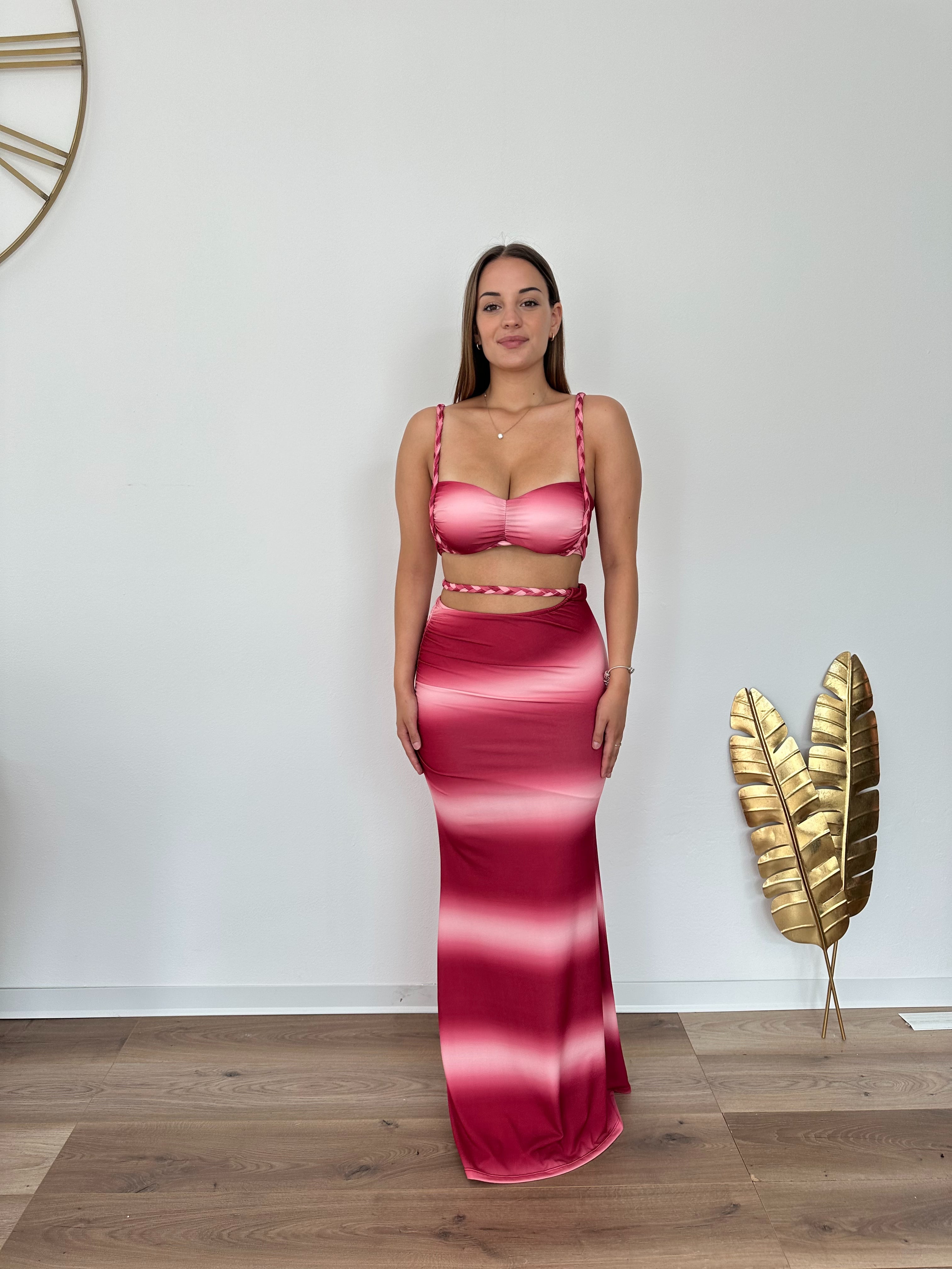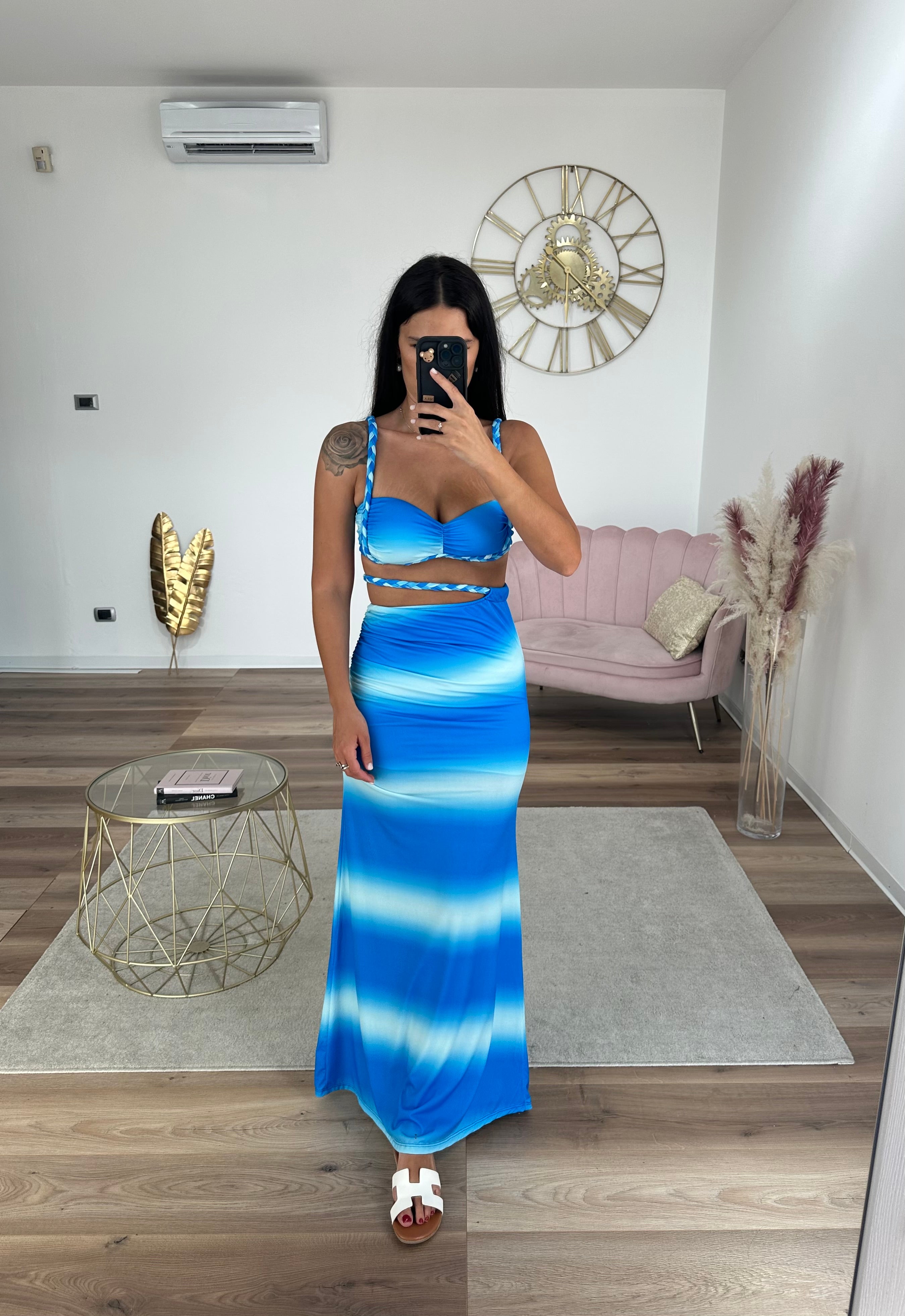 Coordinato completo di gonna elasticizzata, con sottoveste, vita elastica - top con coppe preformate, elasticizzato, bretelle non regolabili