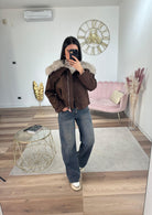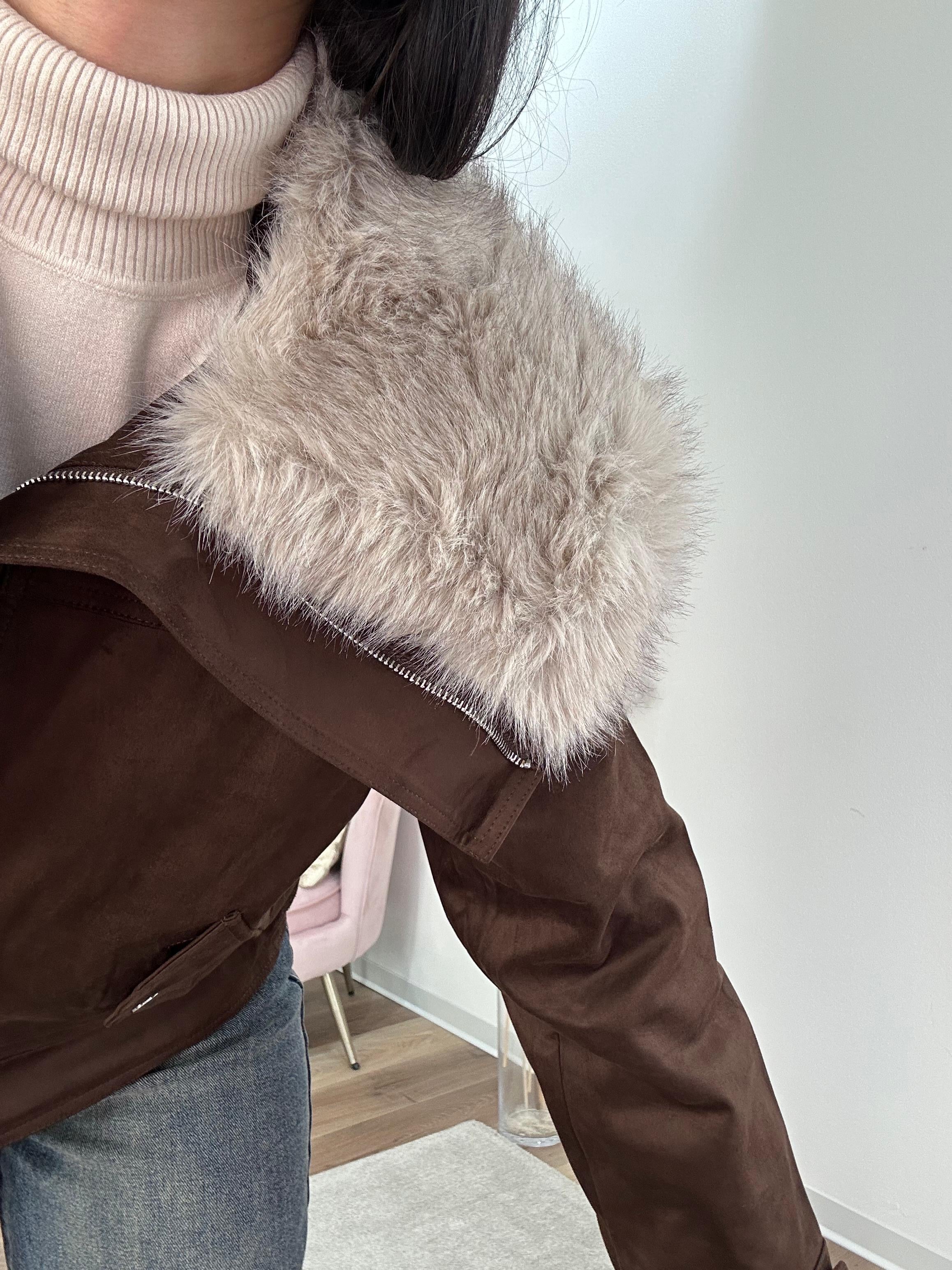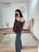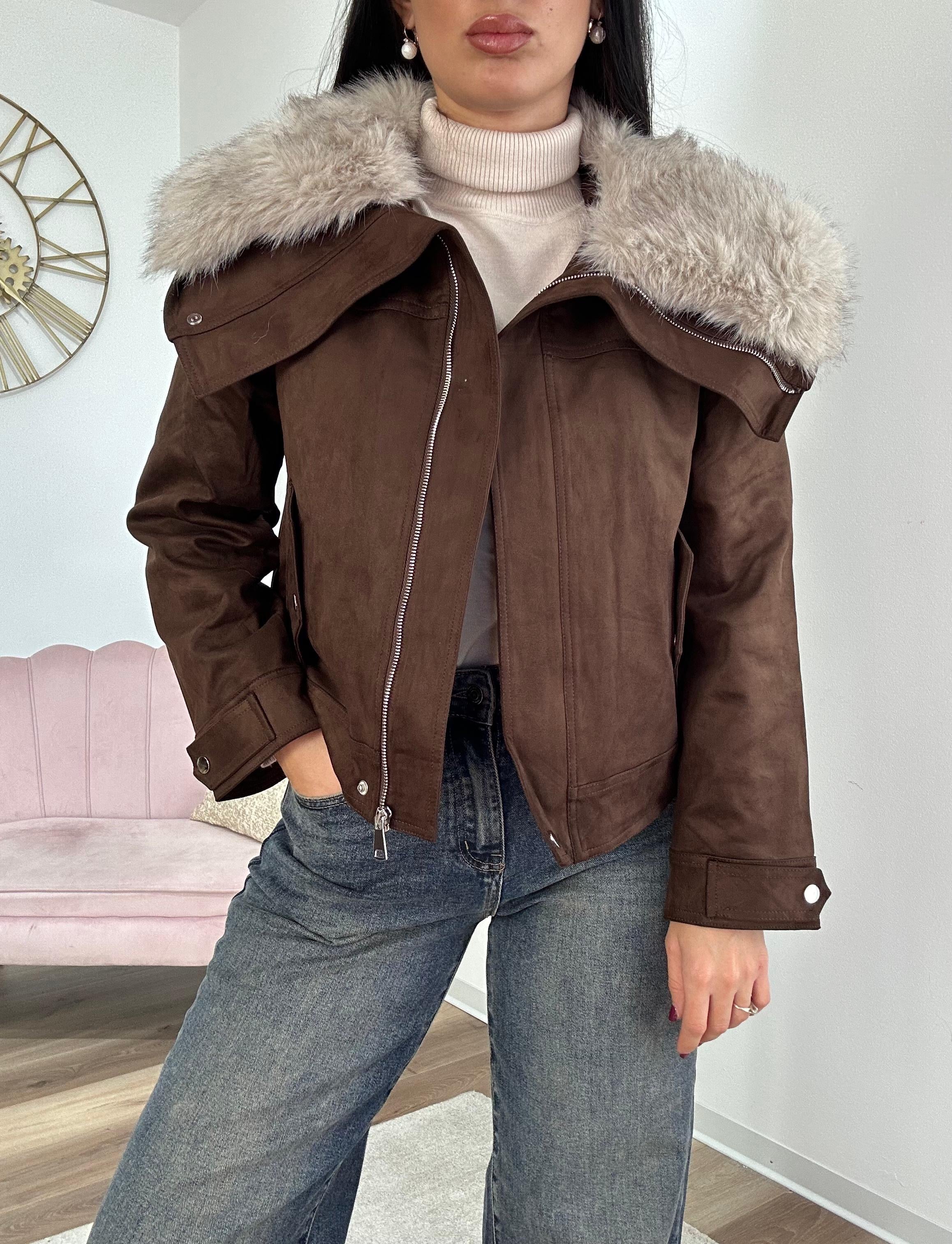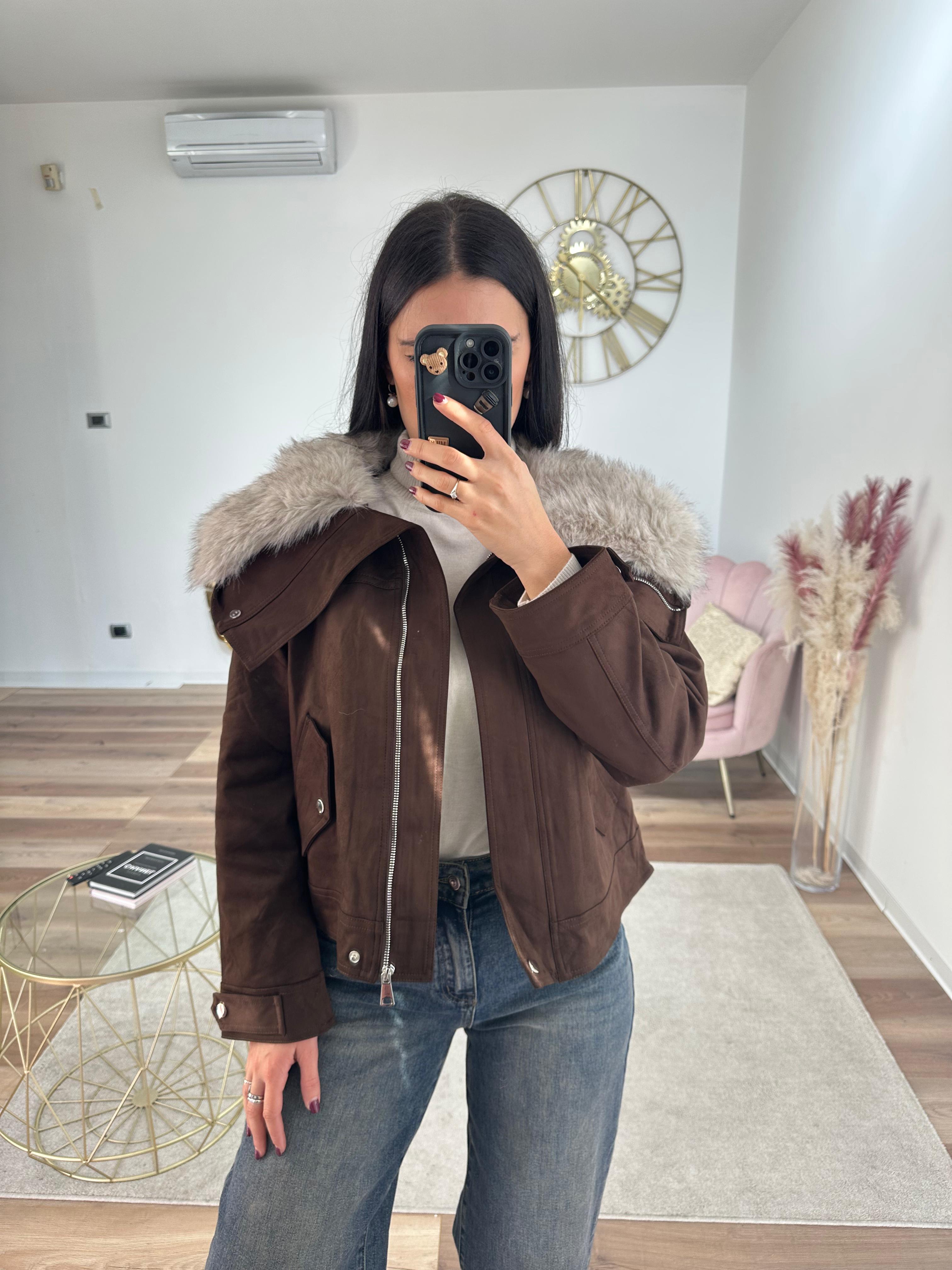 Giacca imbottita, esternamente effetto scamosciato, ecopelliccia  morbidissima removibile, chiusura con zip