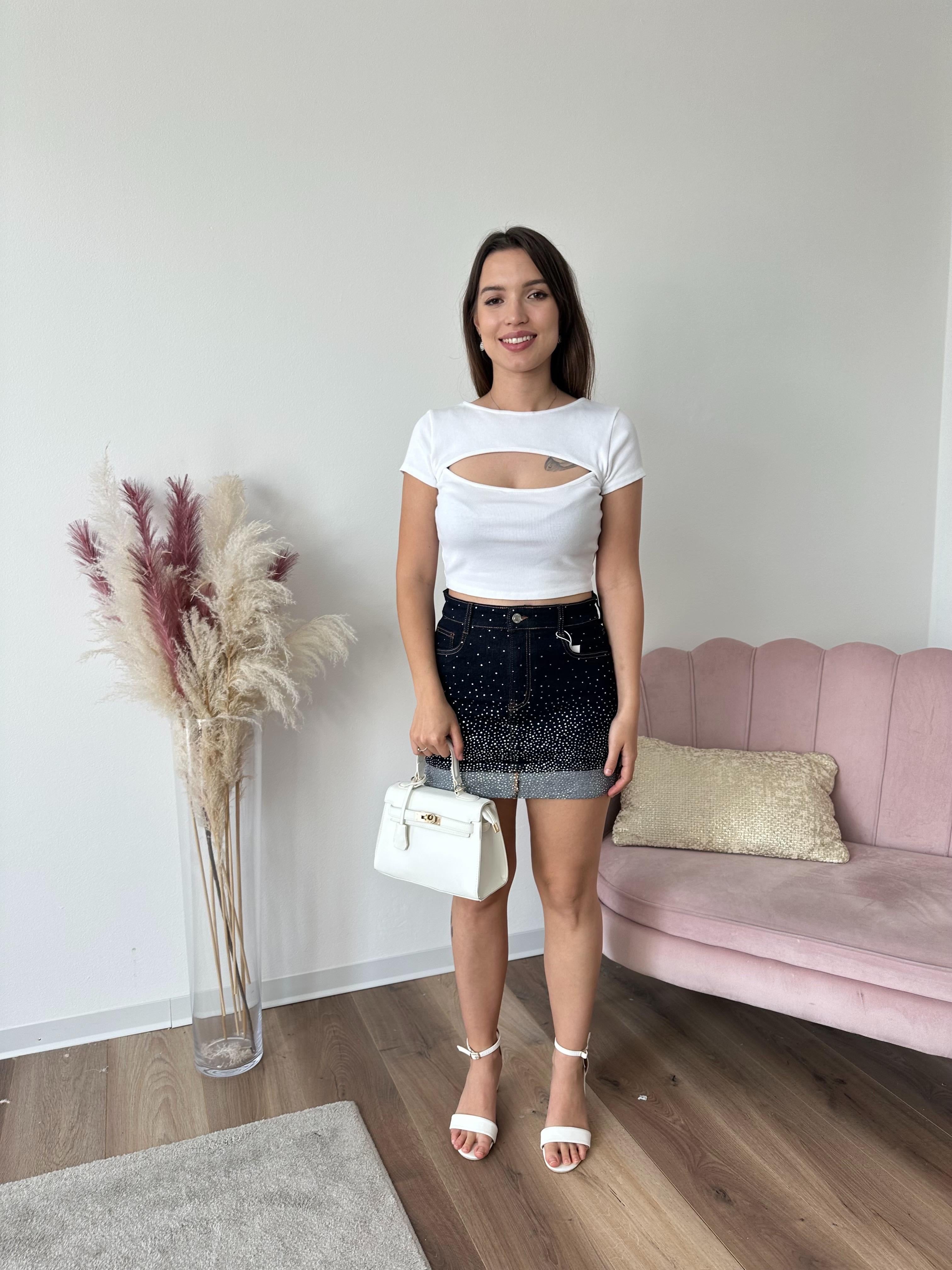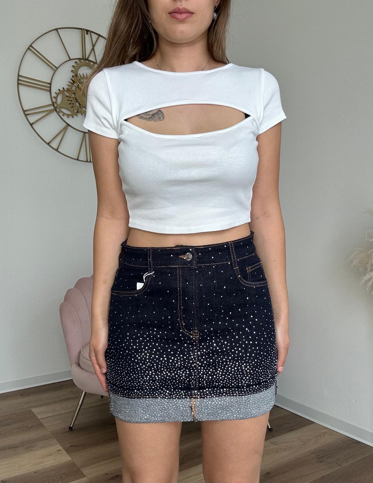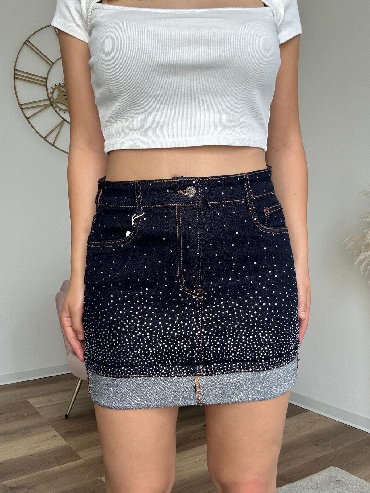 Gonna ricoperta completamente da strass con risvolto, cuciture sul marrone, elasticizzata