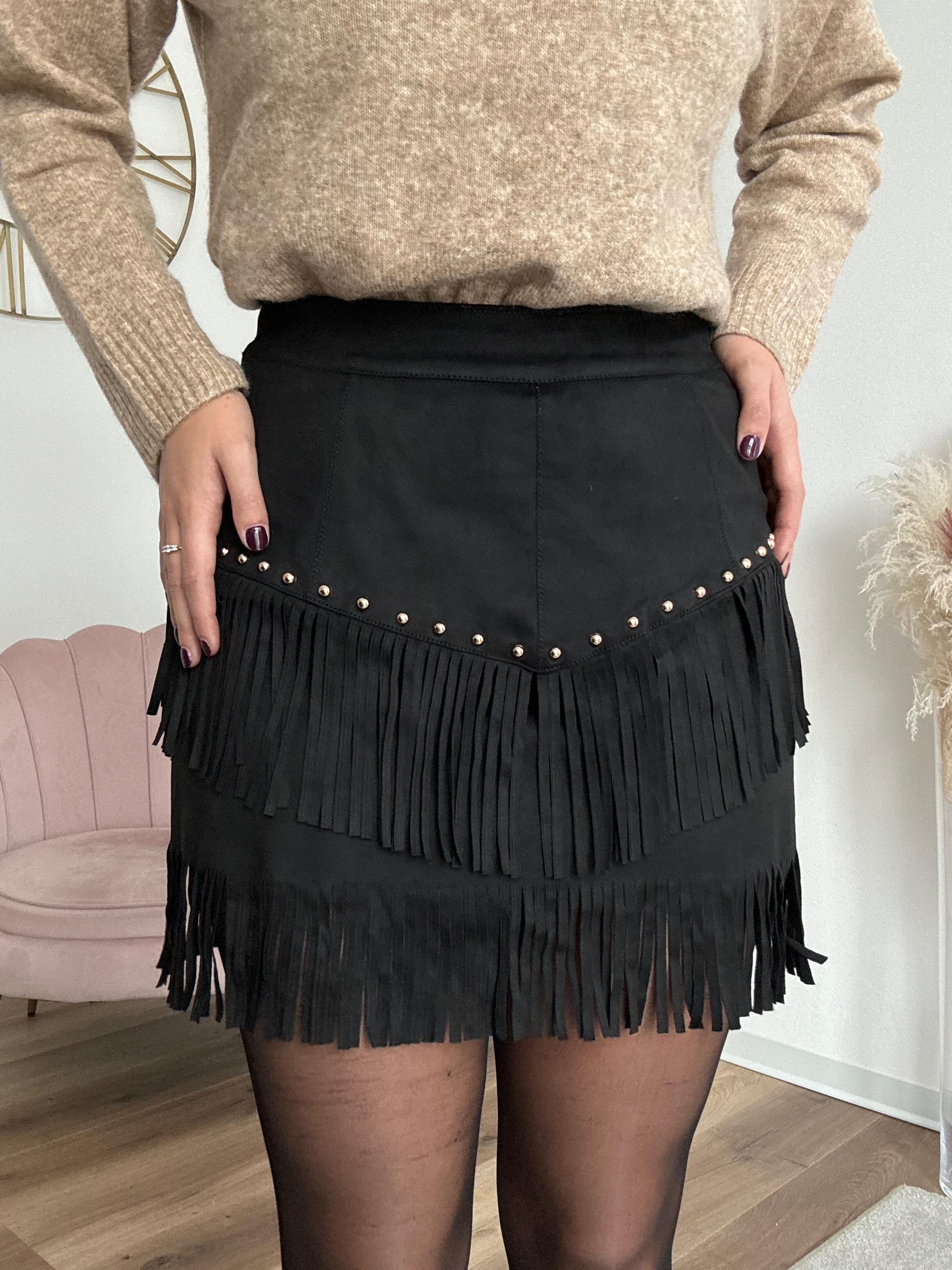 Gonna Suede con frange con sotto un pantaloncini, chiusura con zip sul retro, non è elasticizzato, veste piccolo quindi consigliamo una taglia in più rispetto all’abituale.