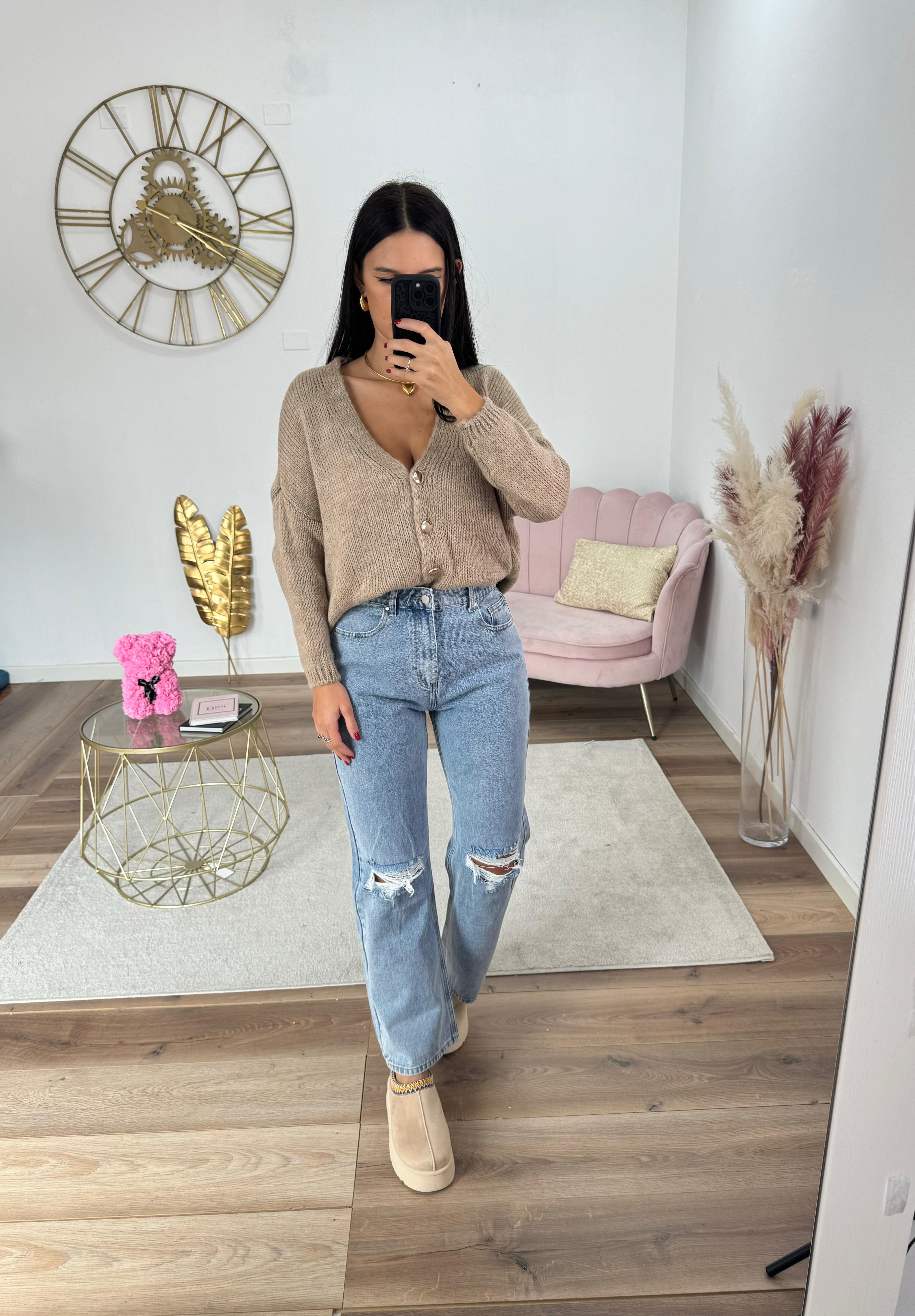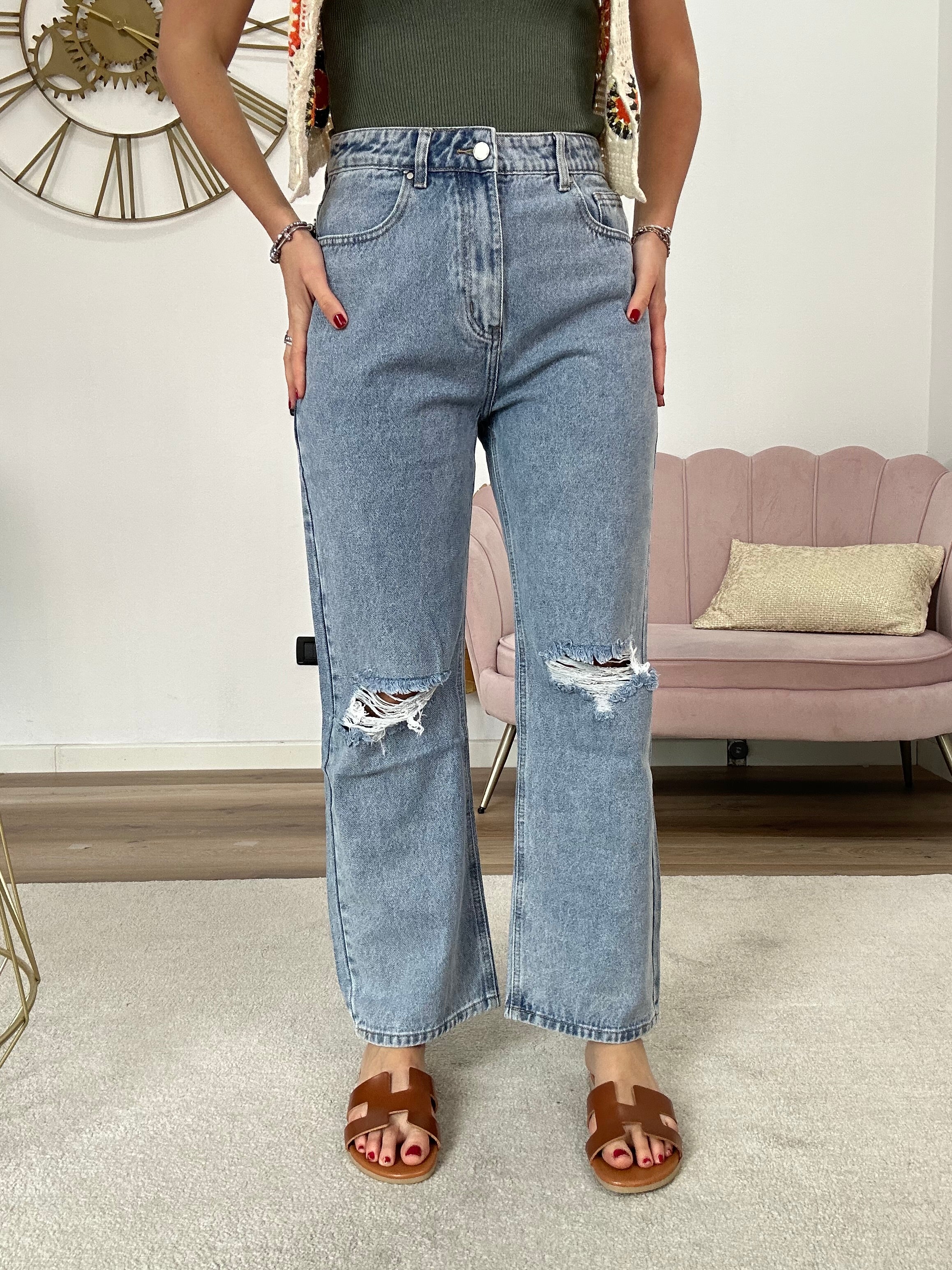 Jeans a gamba dritta con strappi, non è elasticizzato, a vita alta. Se oscilli tra due taglie consigliamo la taglia più piccola.