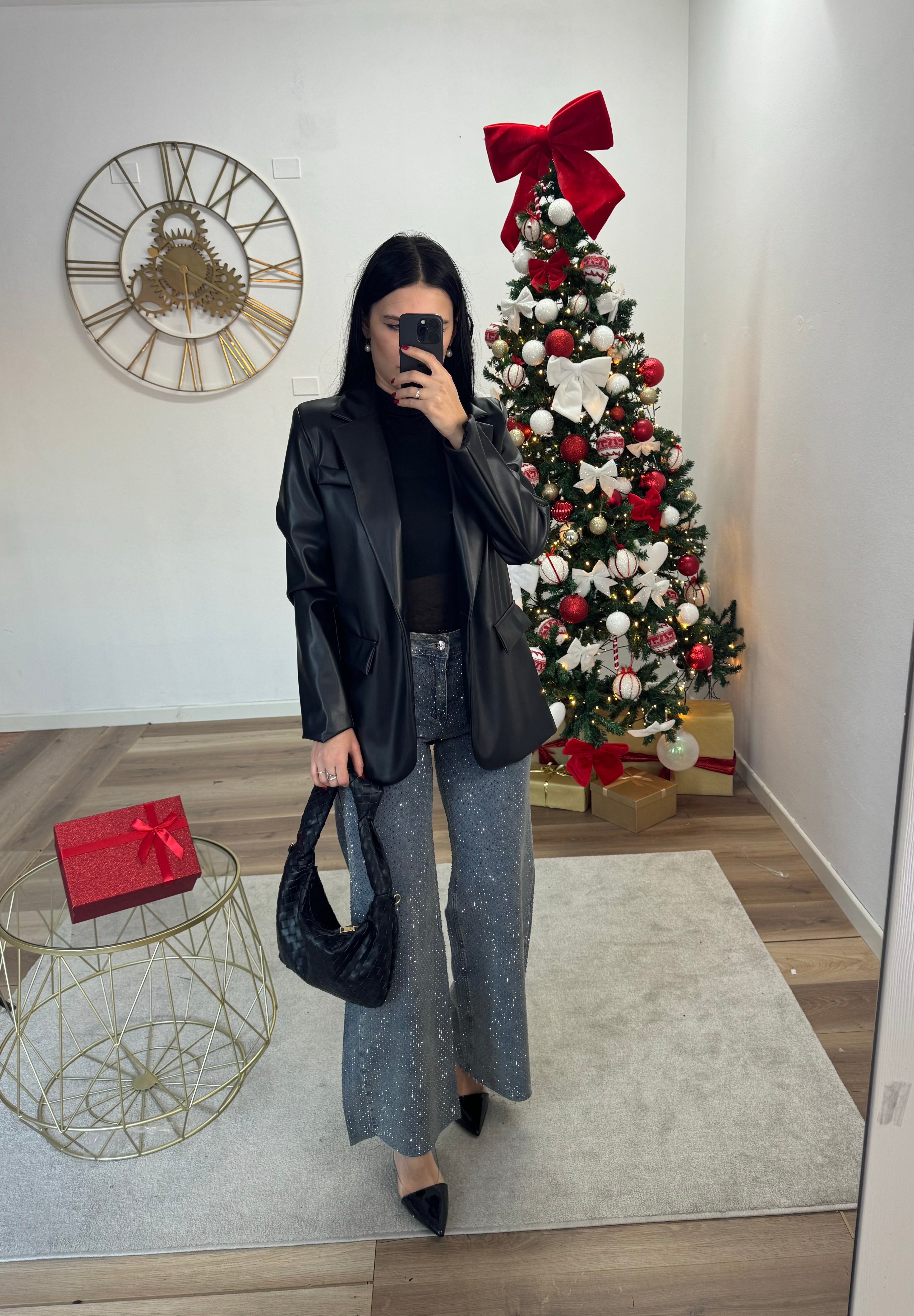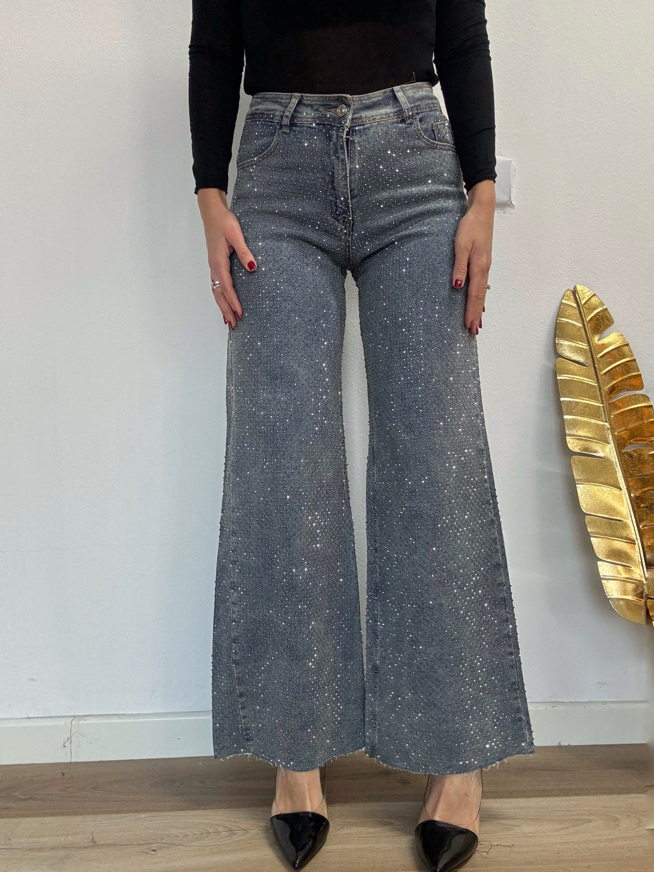 Jeans gamba dritta ricoperti di strass, vita alta, morbidi alla coscia, leggermente elasticizzati.