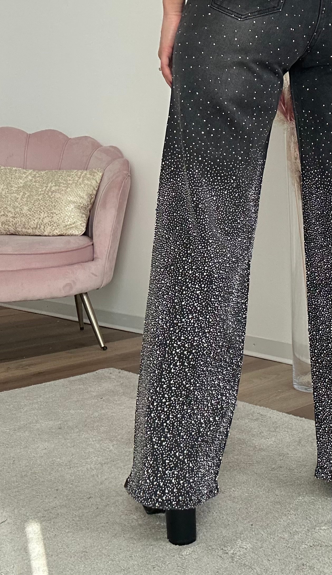Jeans modello palazzo, impreziosito da strass, vita alta, leggermente elasticizzato.
