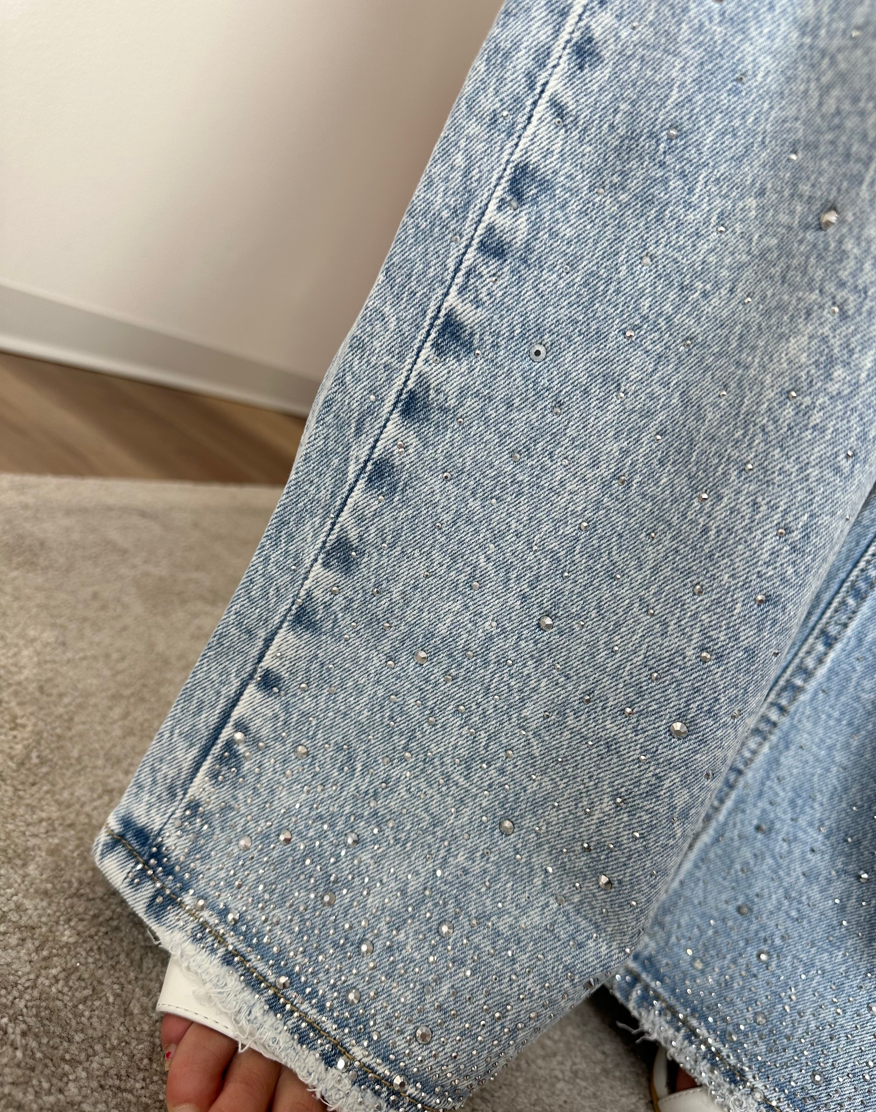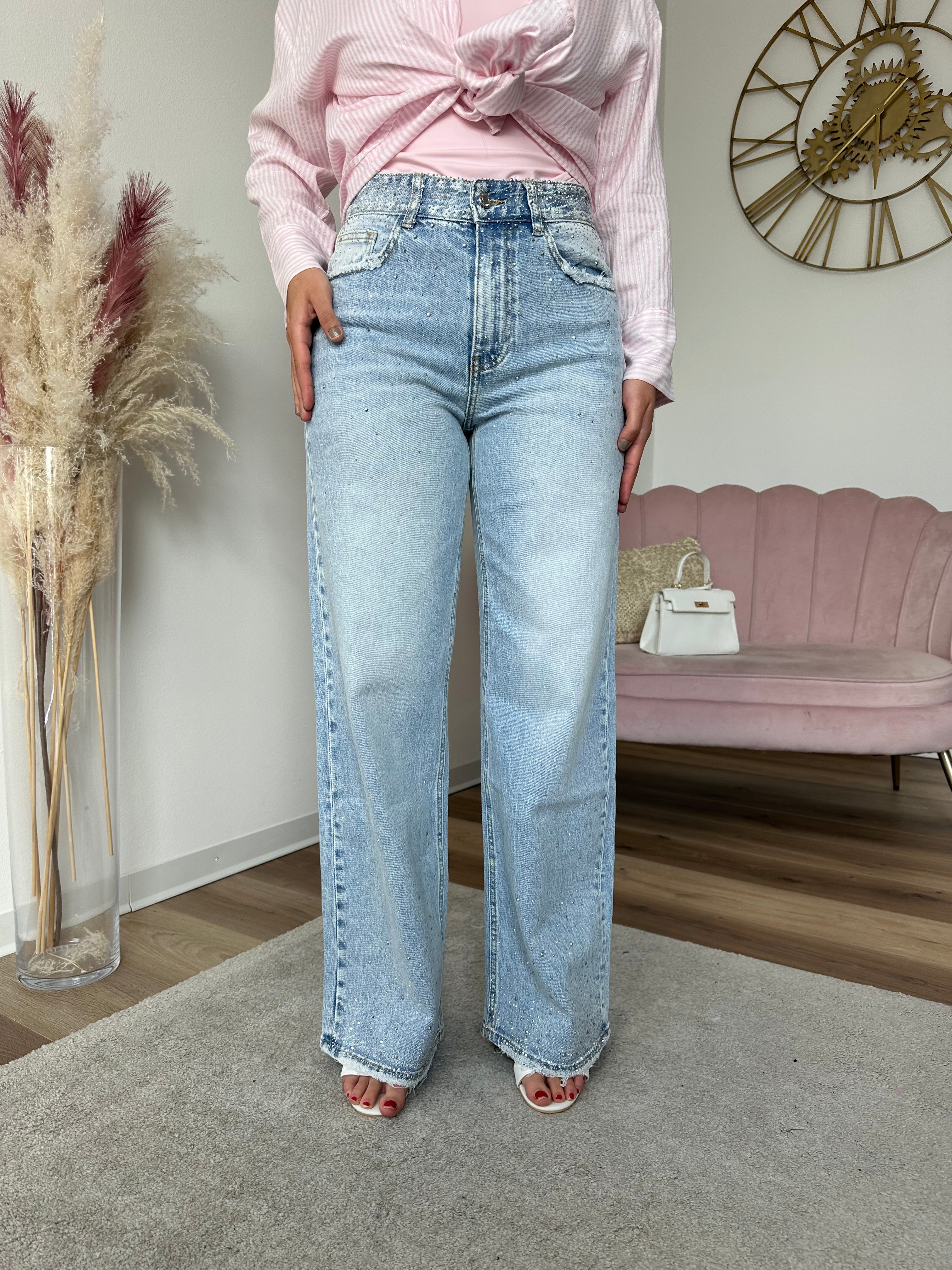 Jeans modello palazzo con strass sulla vita e sul fondo, non elasticizzati