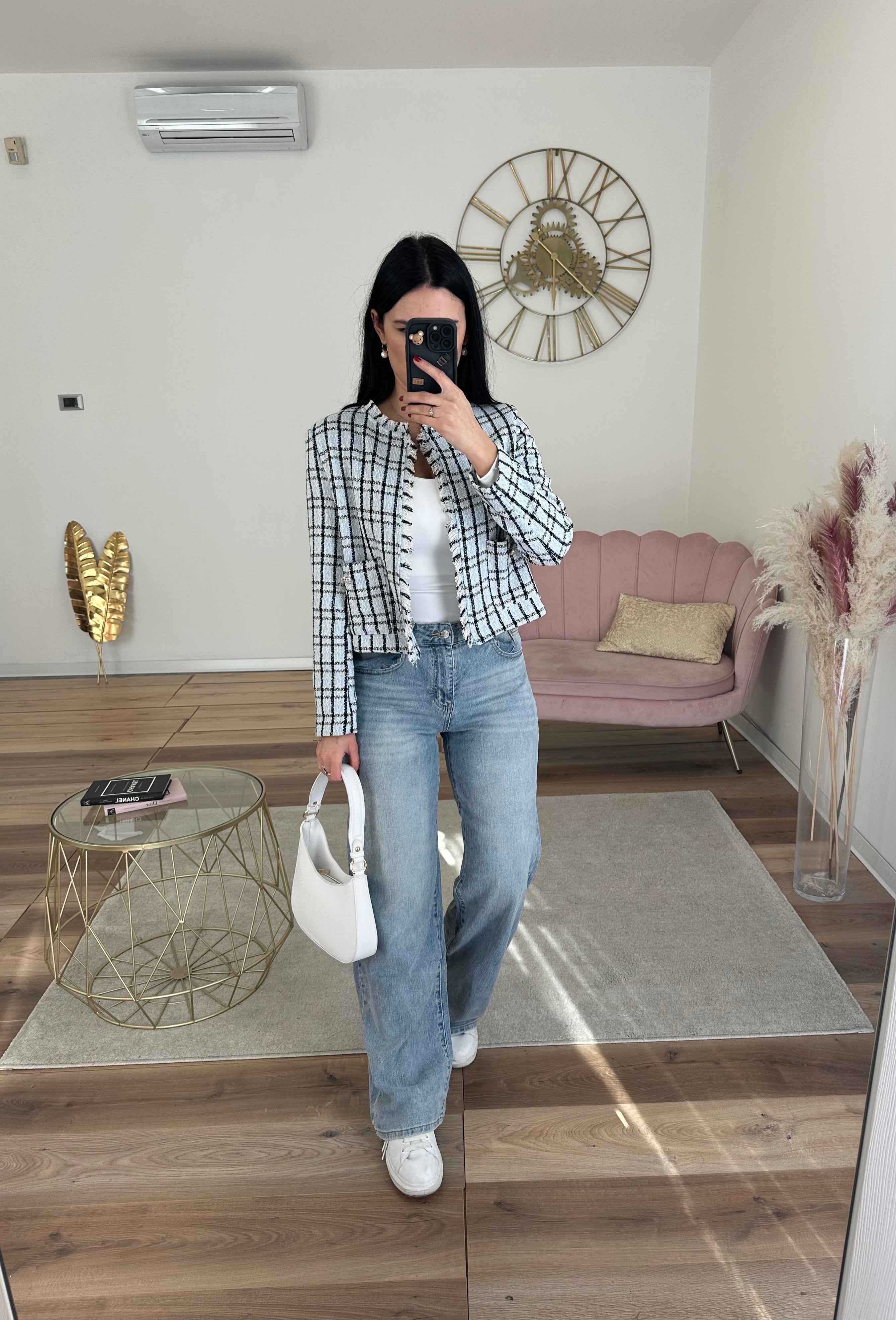 Jeans modello palazzo, vita alta, lavaggio vintage, veste regolare.