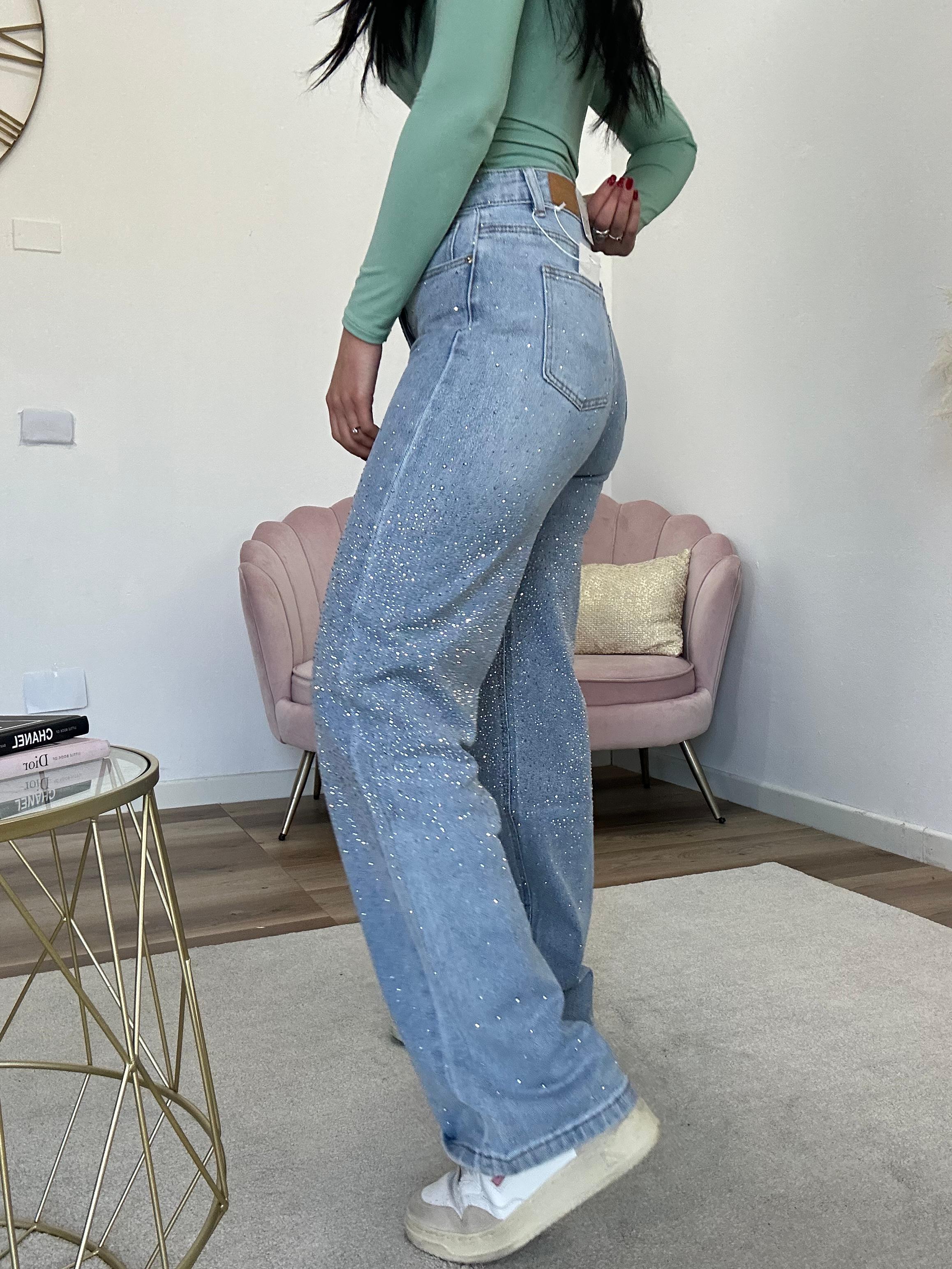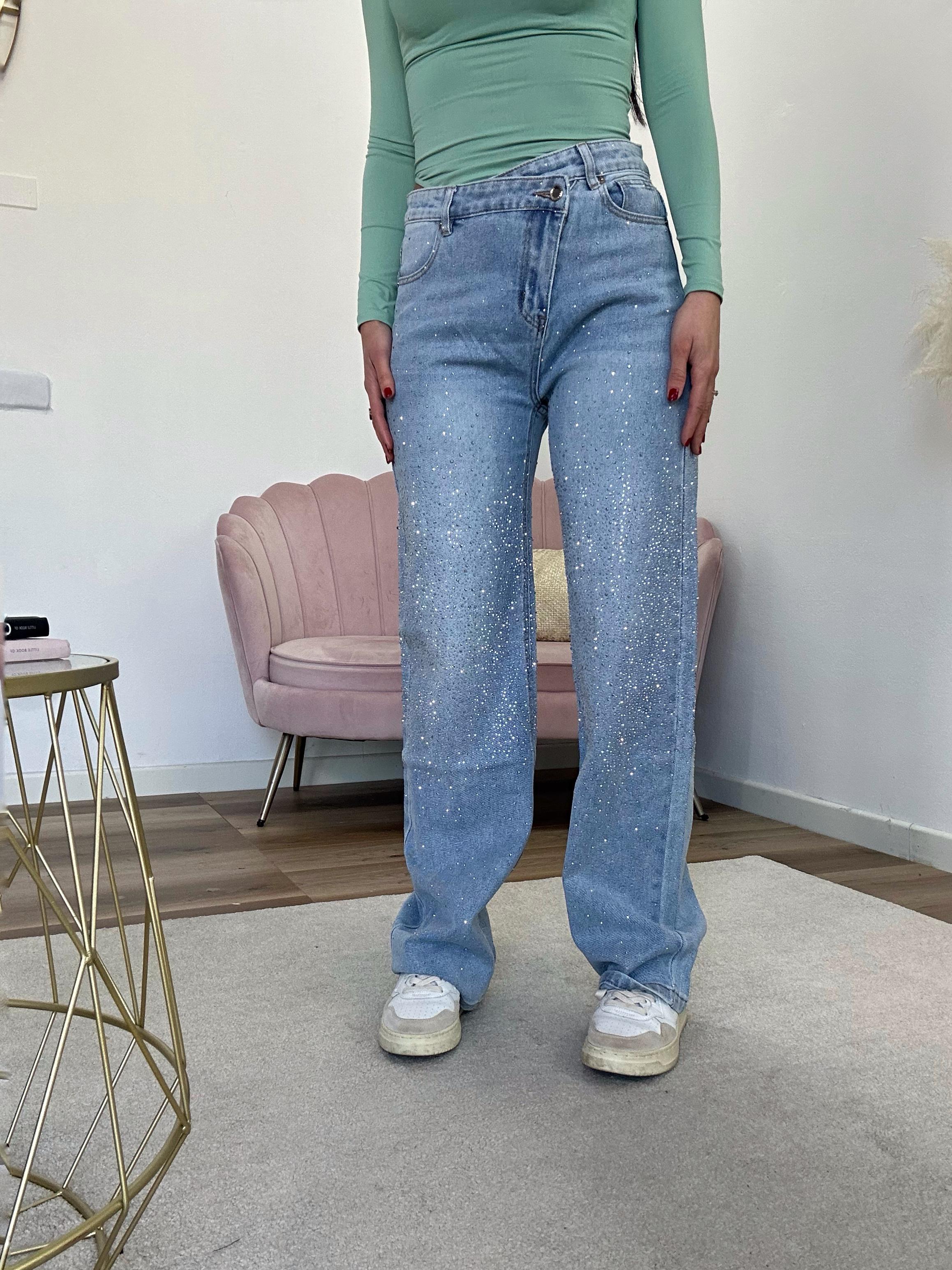 Jeans ricoperti di strass, modello a gamba dritta, bustino assimetrico, non è elasticizzato ed ha una vestibilità regolare.