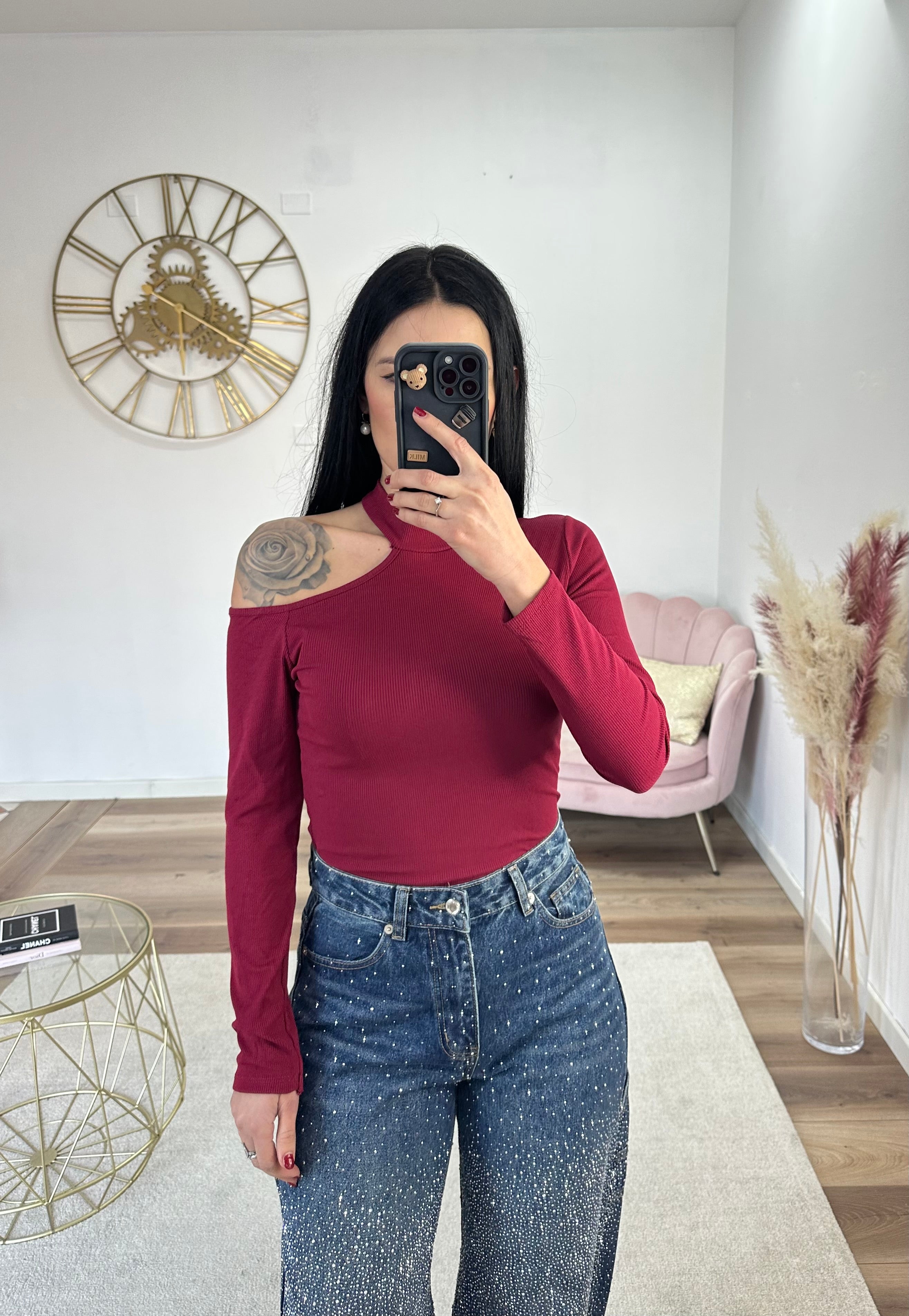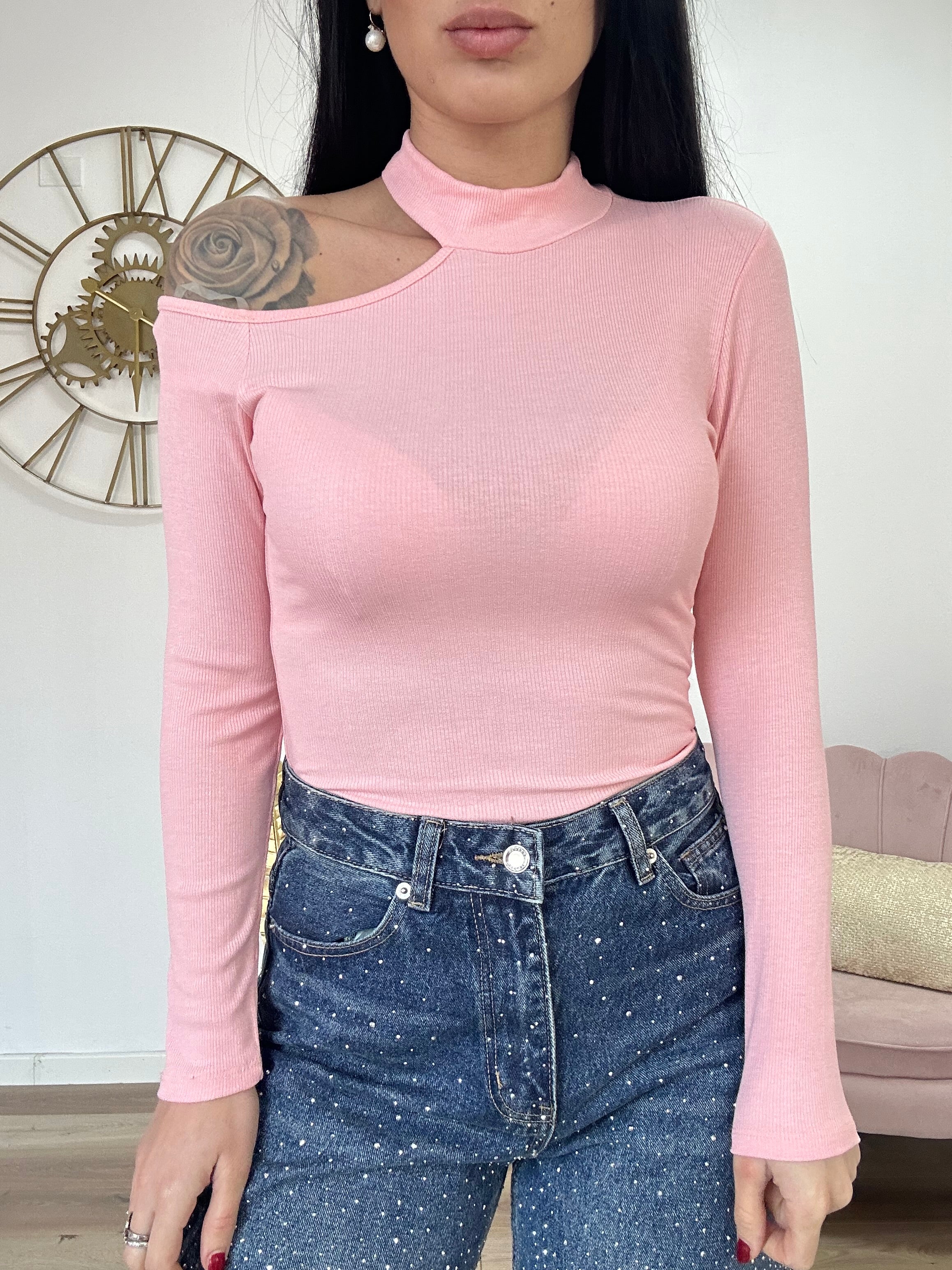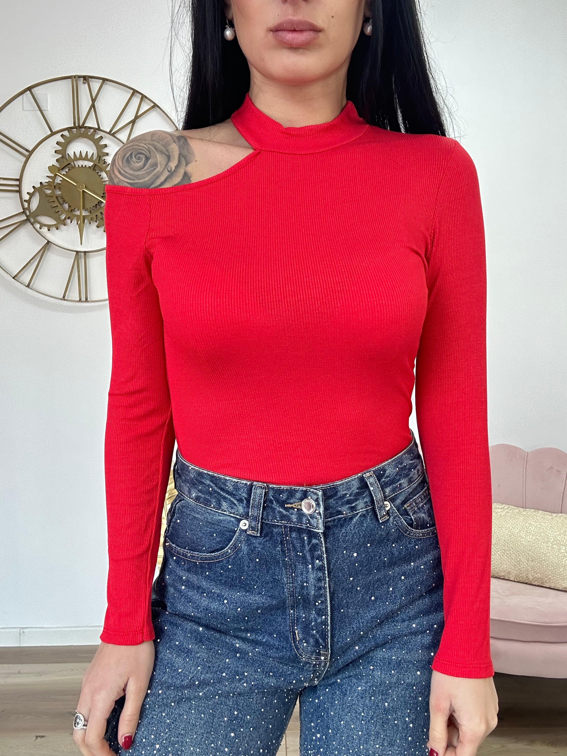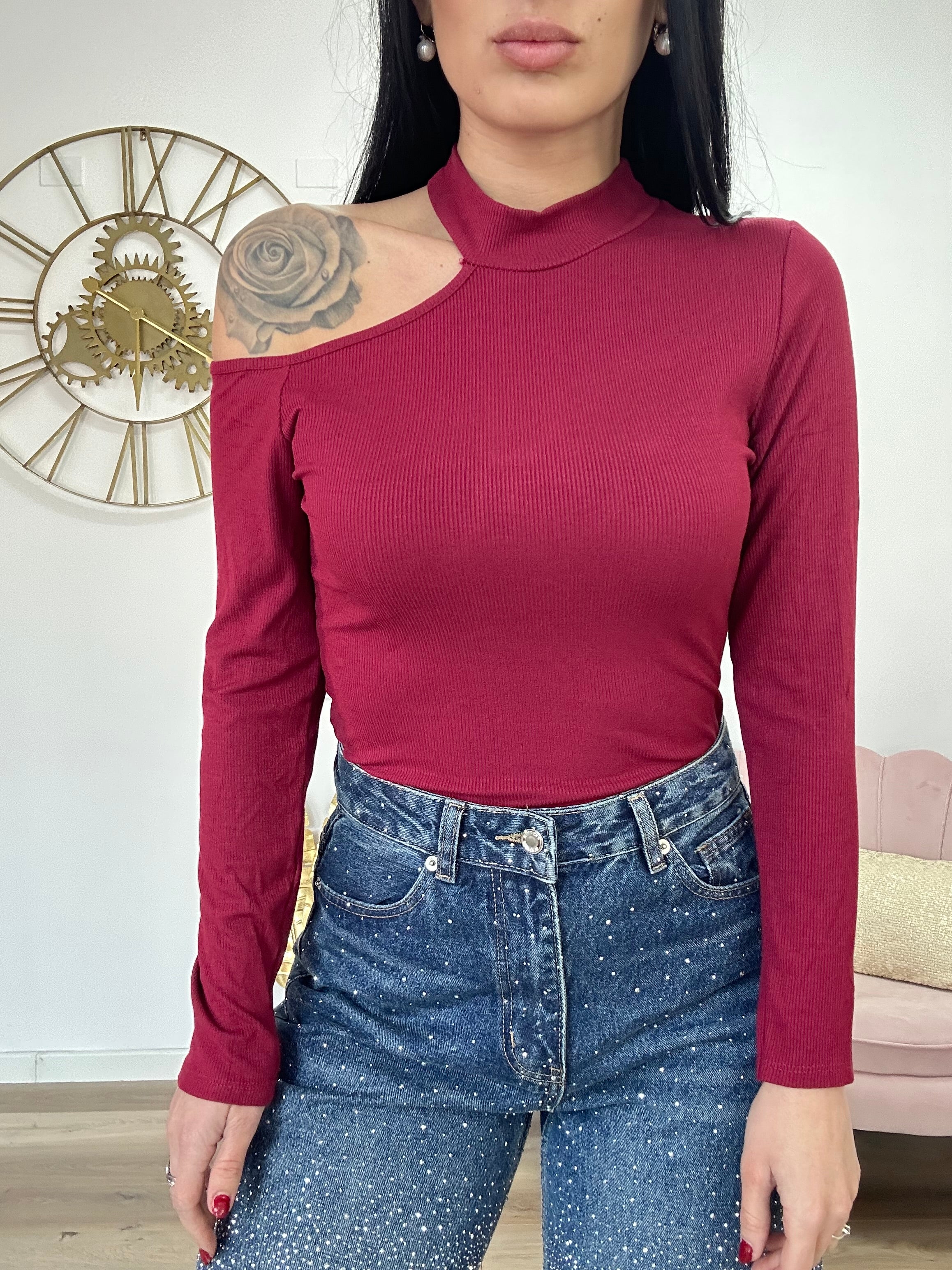 Maglia in viscosa con apertura sulla spalla, tessuto a costine, lunghezza normale, elasticizzata.
