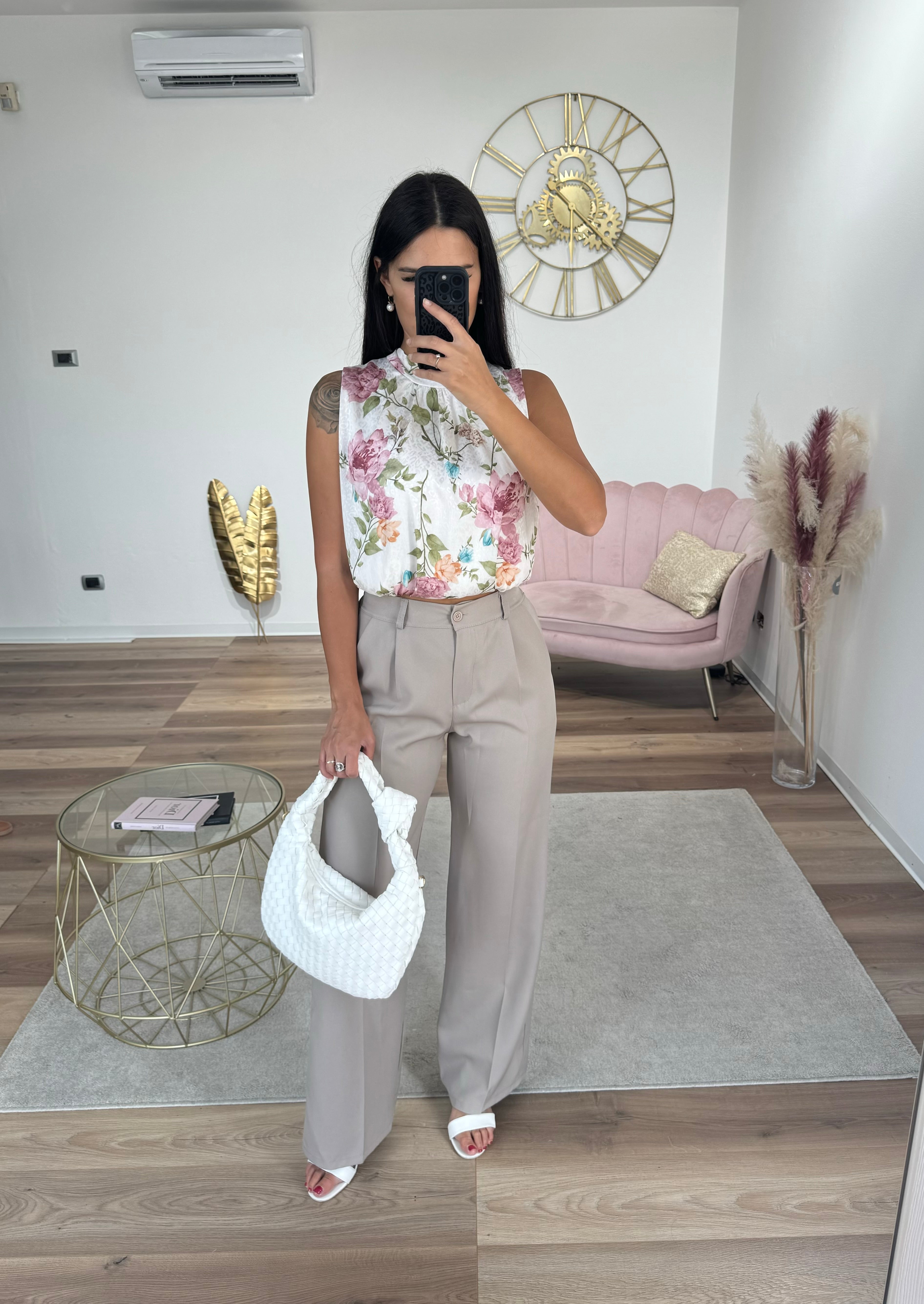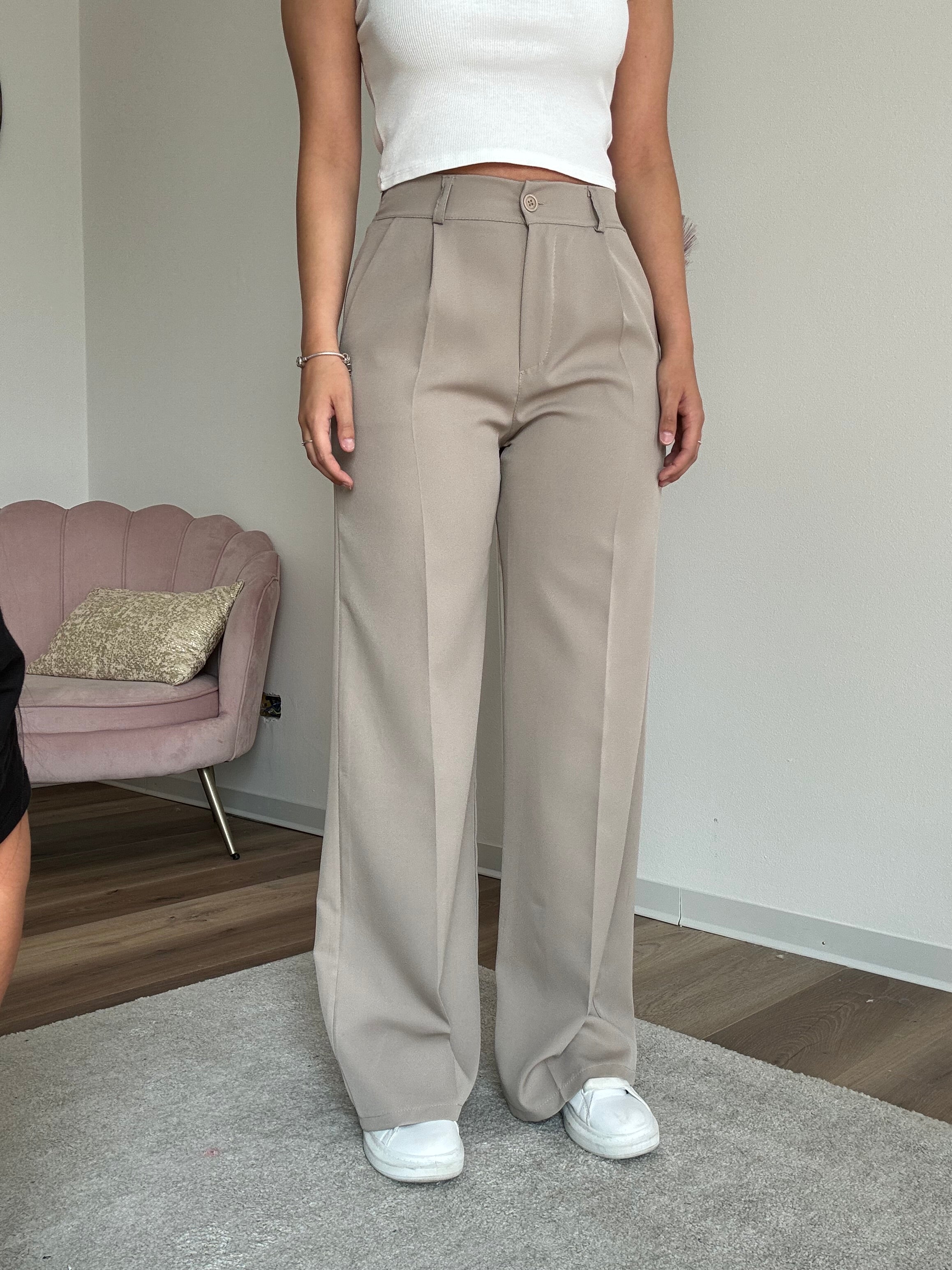 Pantalone modello a palazzo con pences, morbido lungo i fianchi, vita elastica
