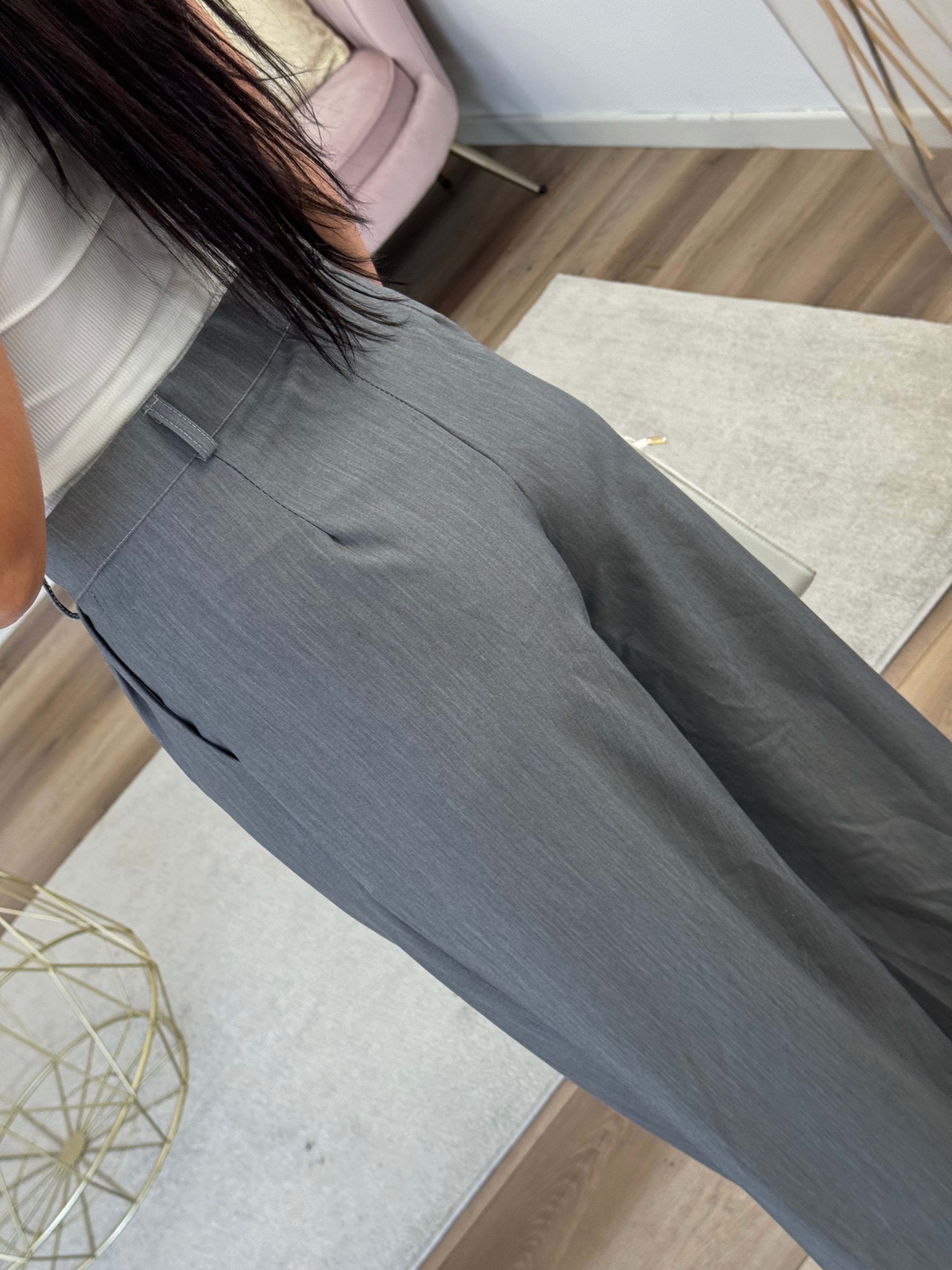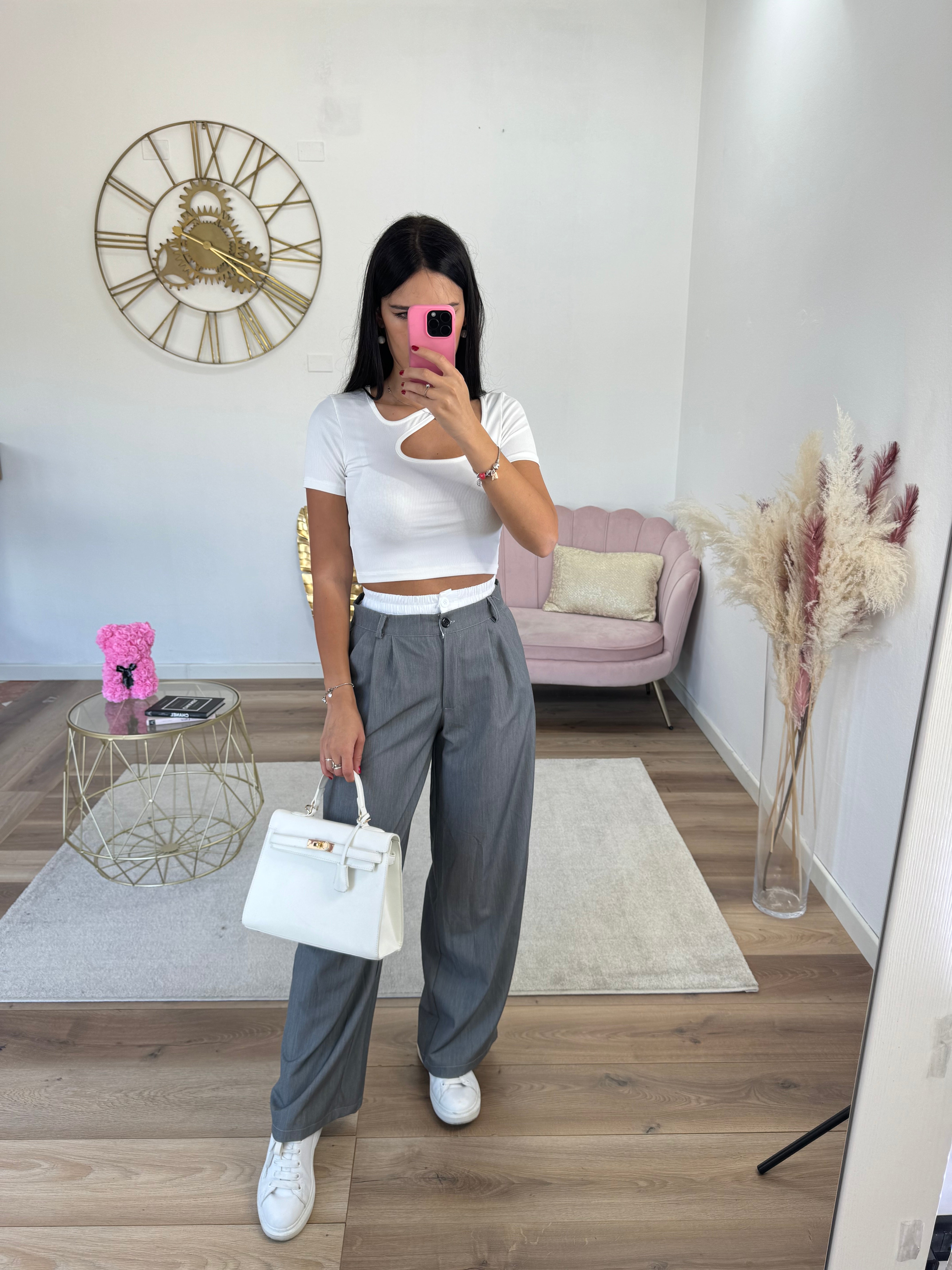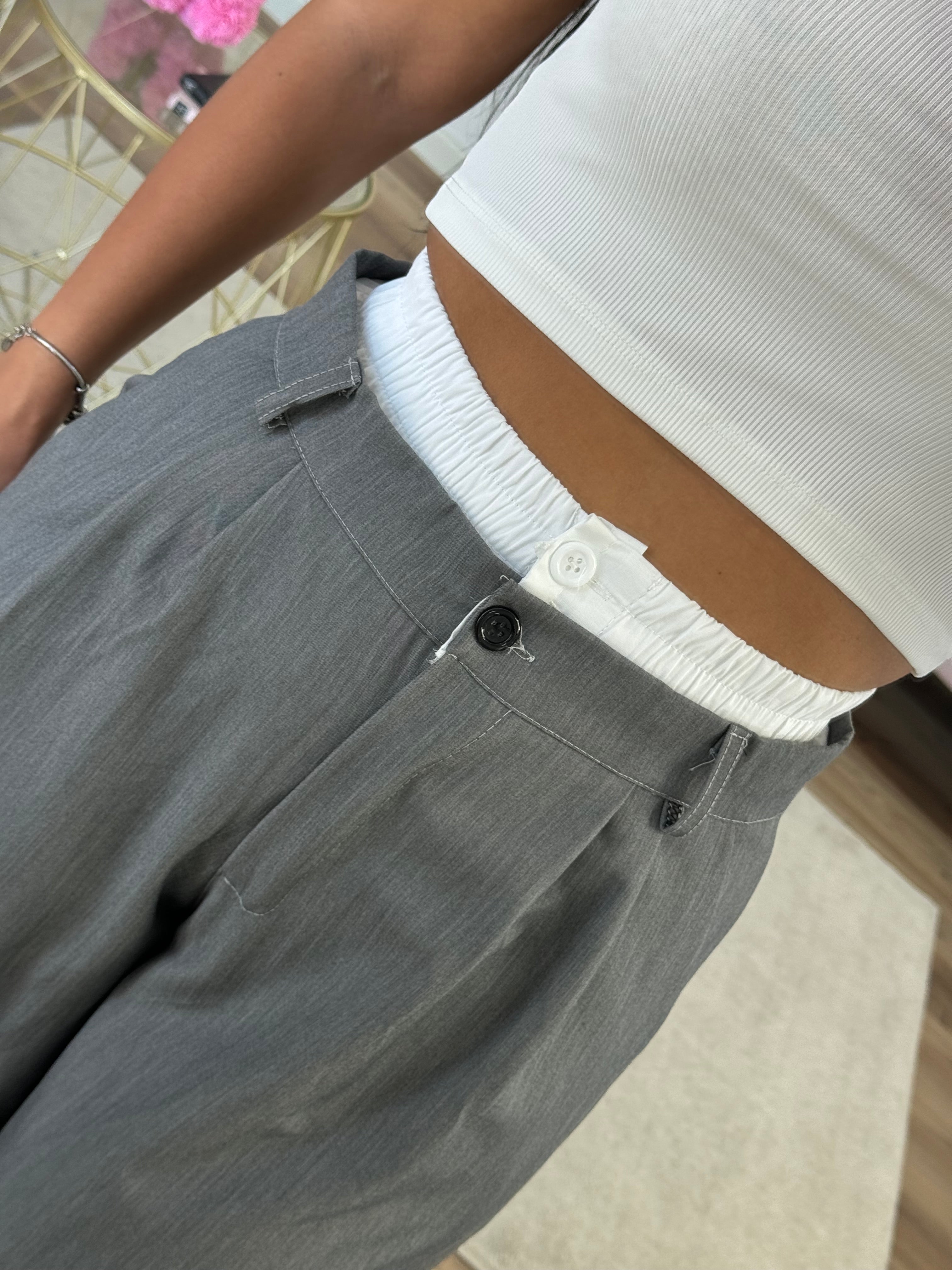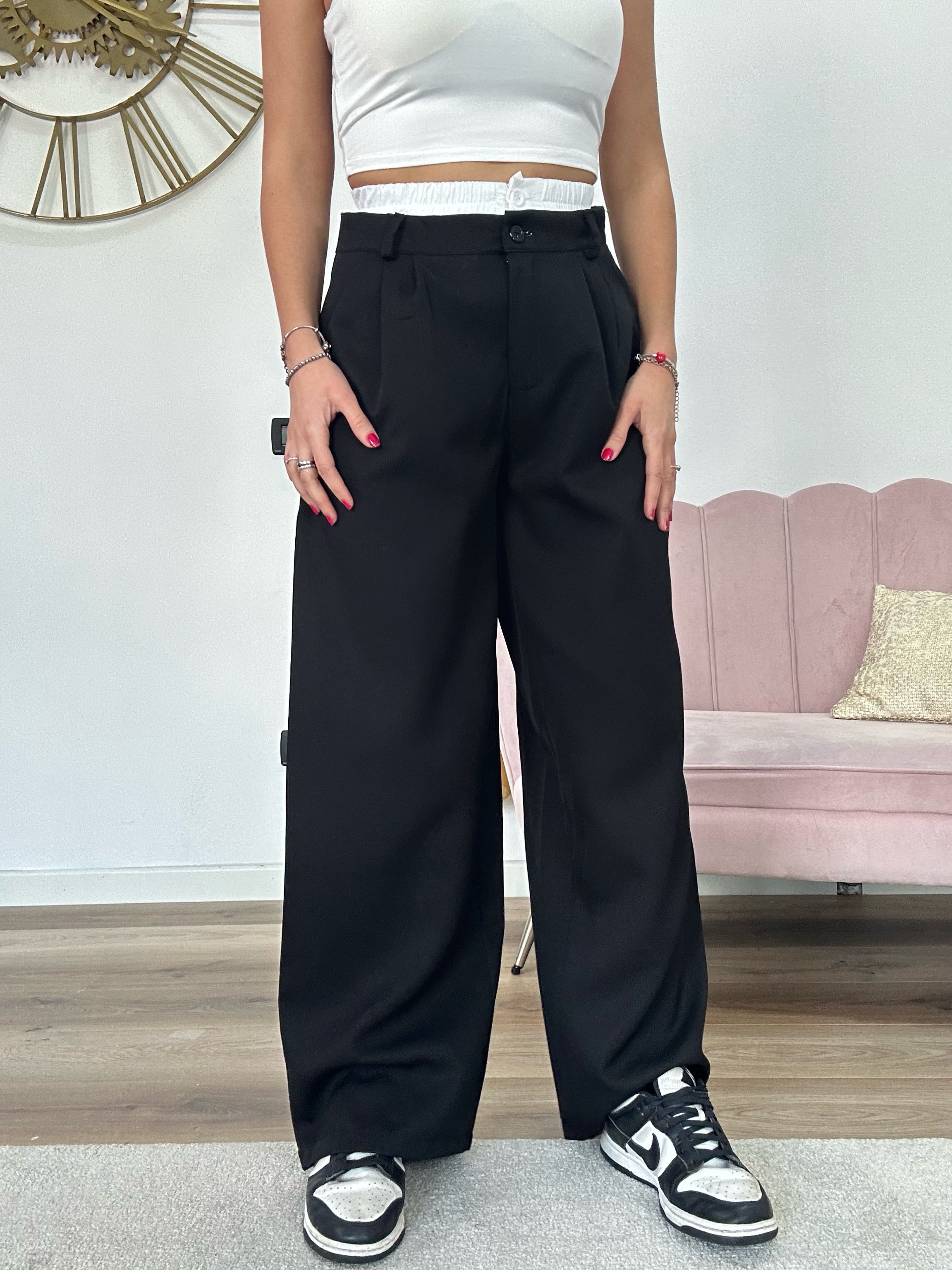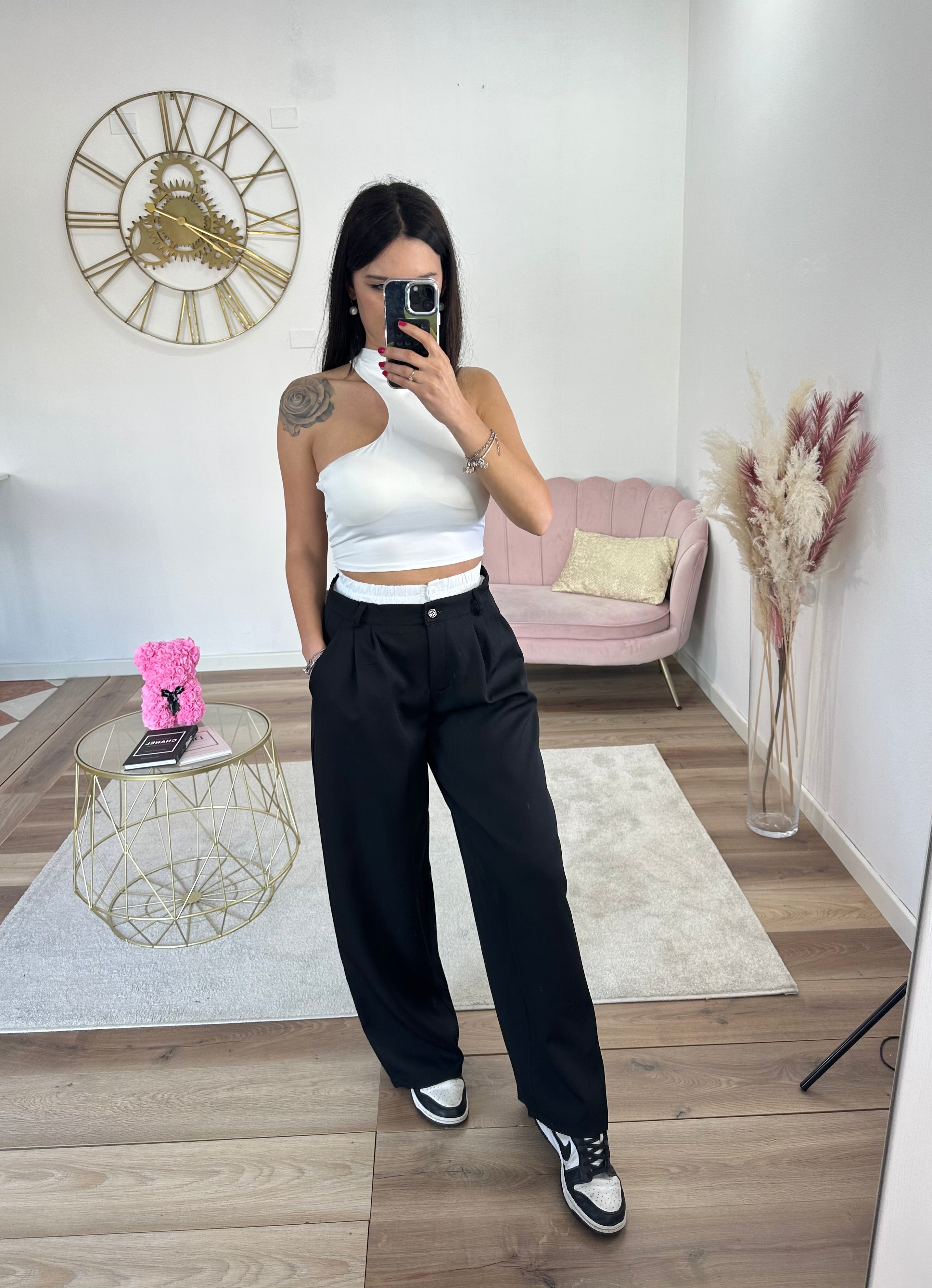 Pantalone modello a palazzo, la vita è elastica con doppio bustino ed infine con tasche.