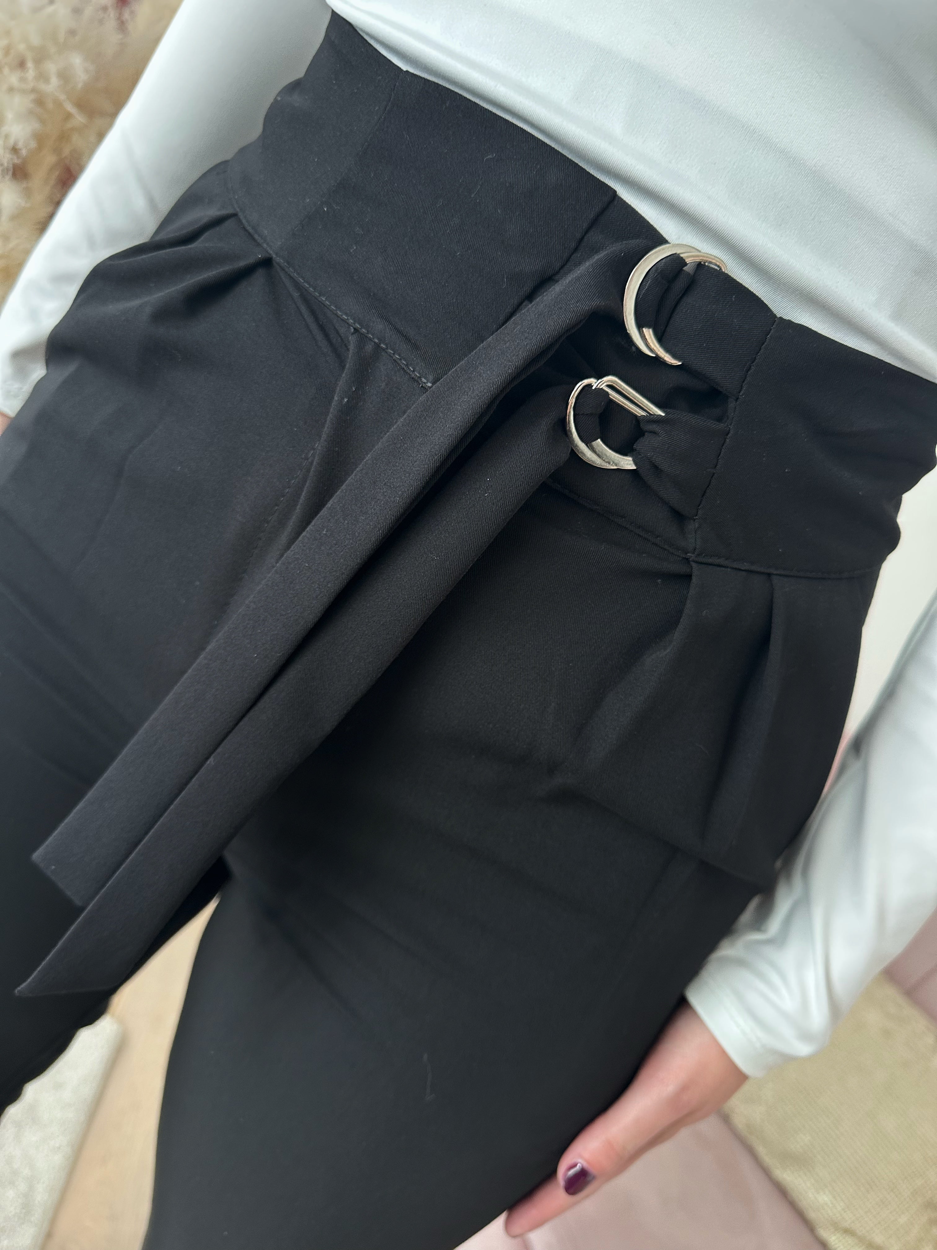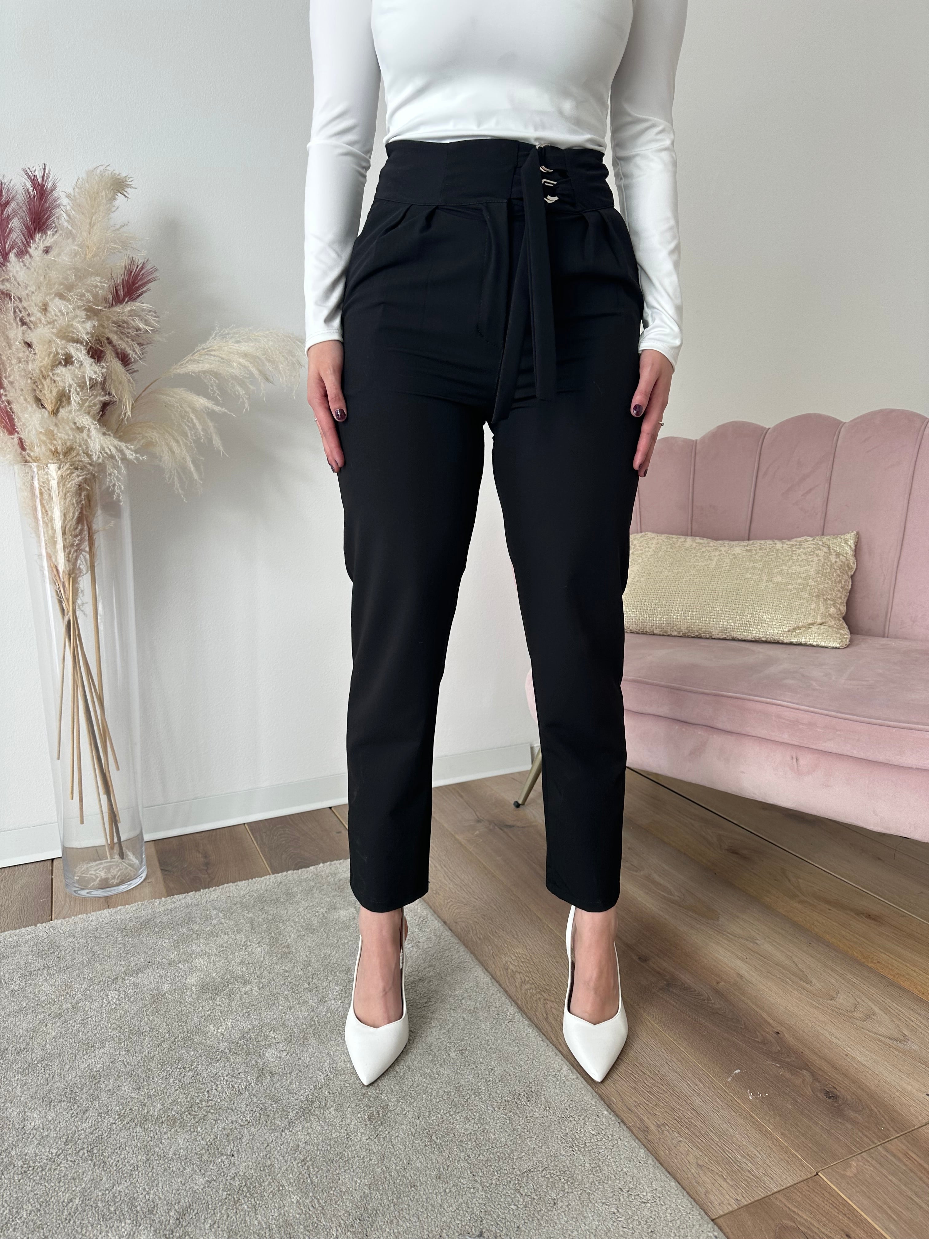Pantalone modello classico con tasche, pences sul davanti, chiusura particolare e con zip, non è elasticizzato.