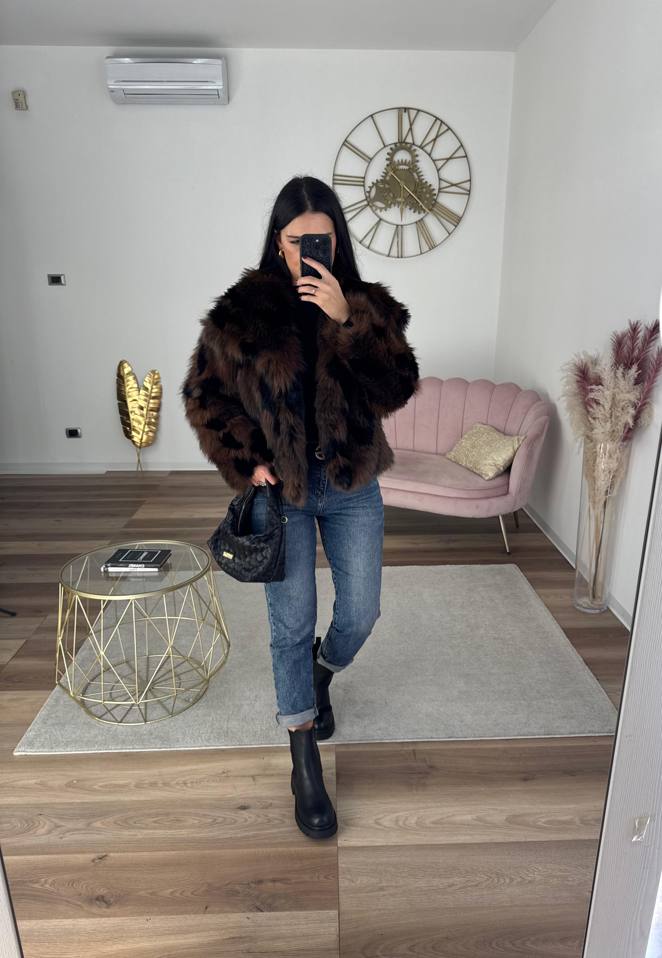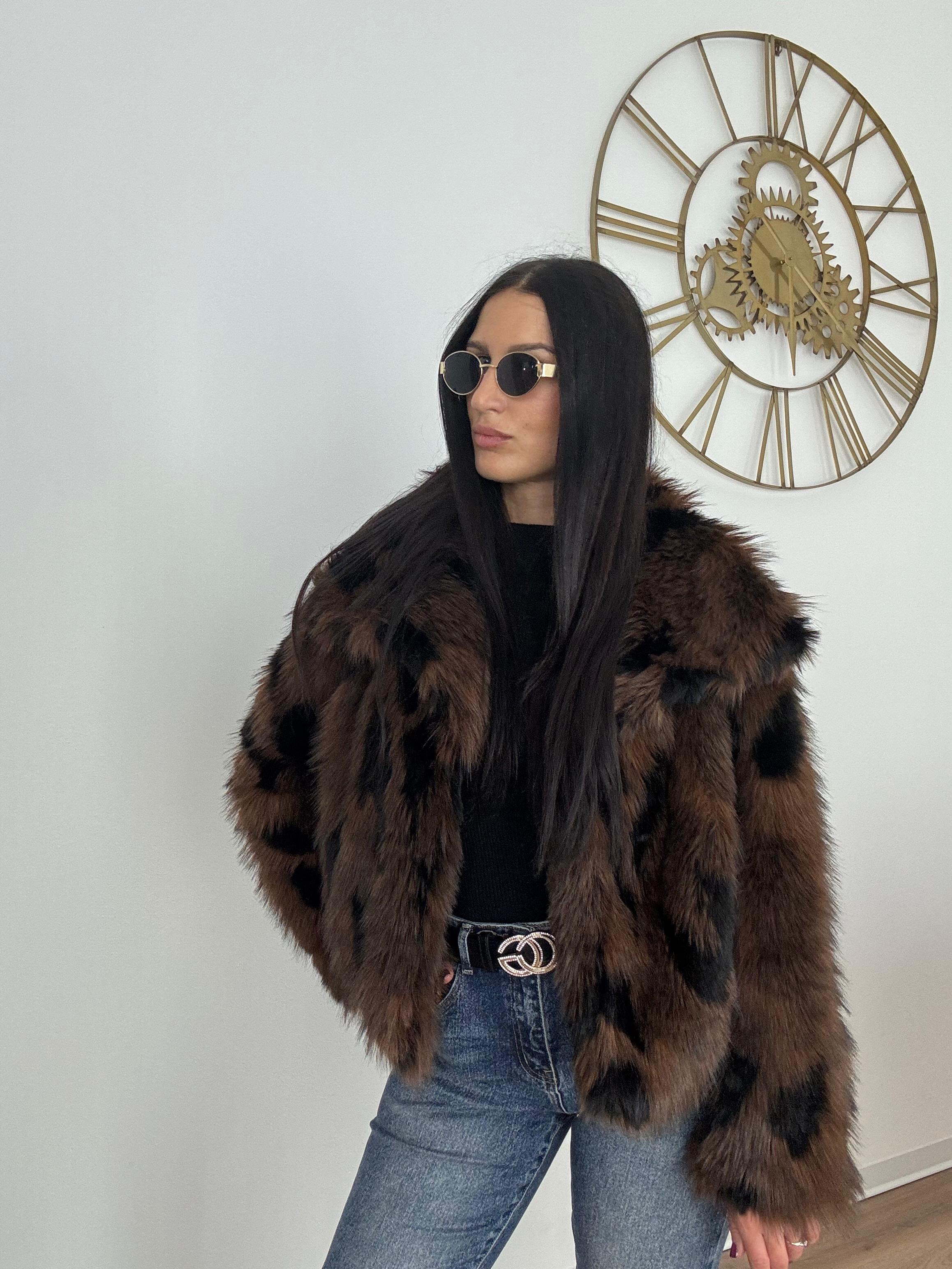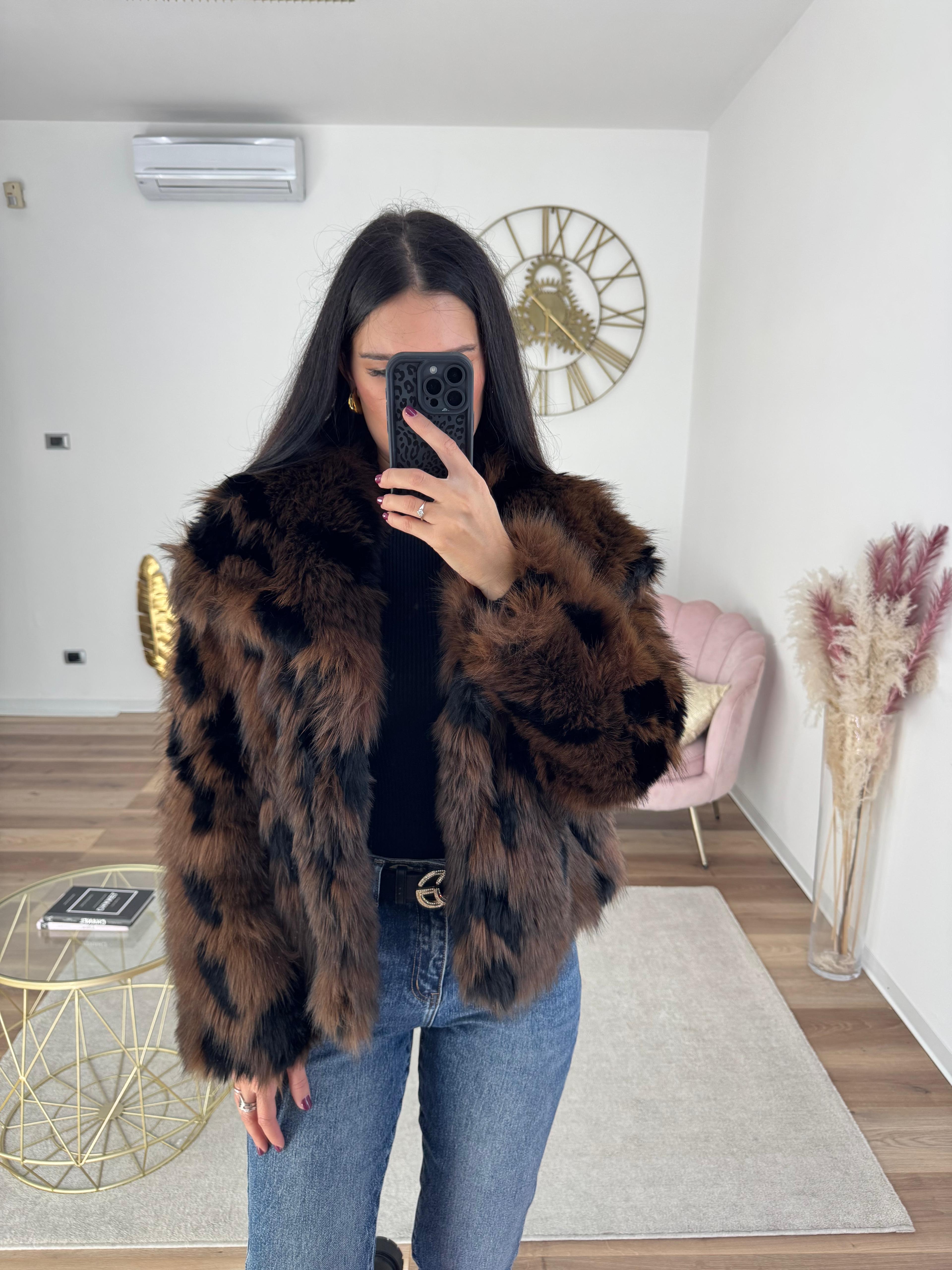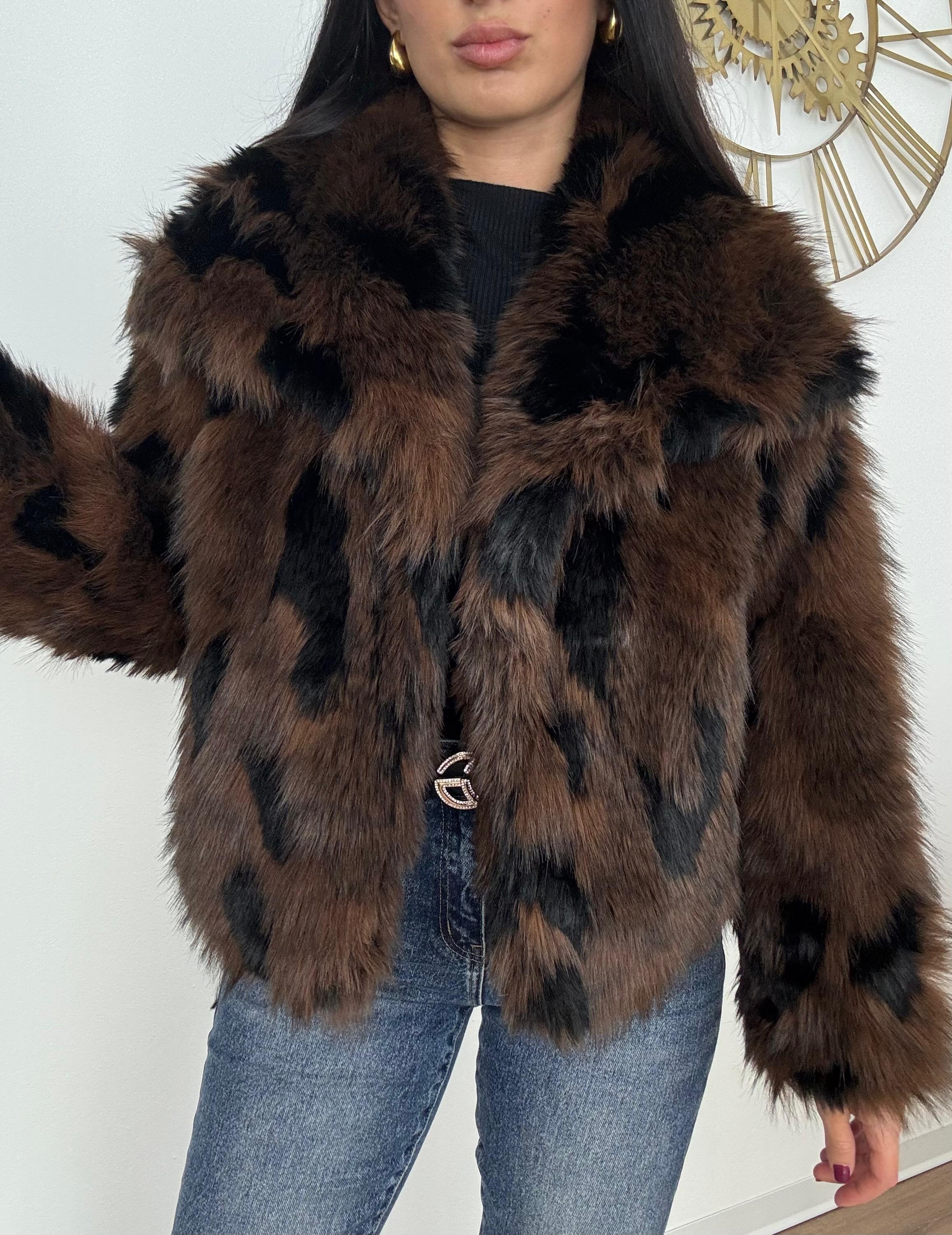 Pelliccia sintetica foderata internamente, morbida e calda, con tasche, chiusura con bottoncino