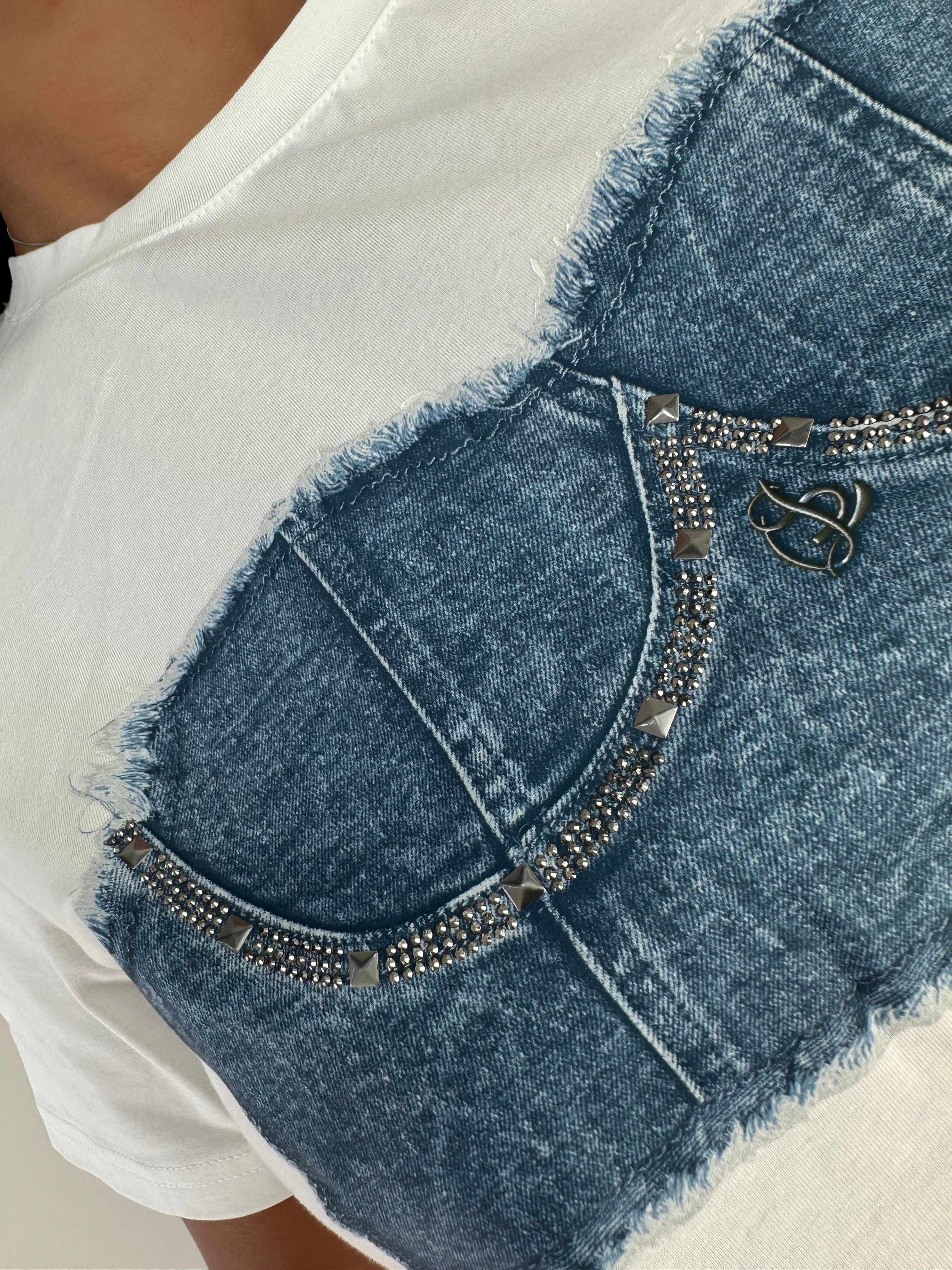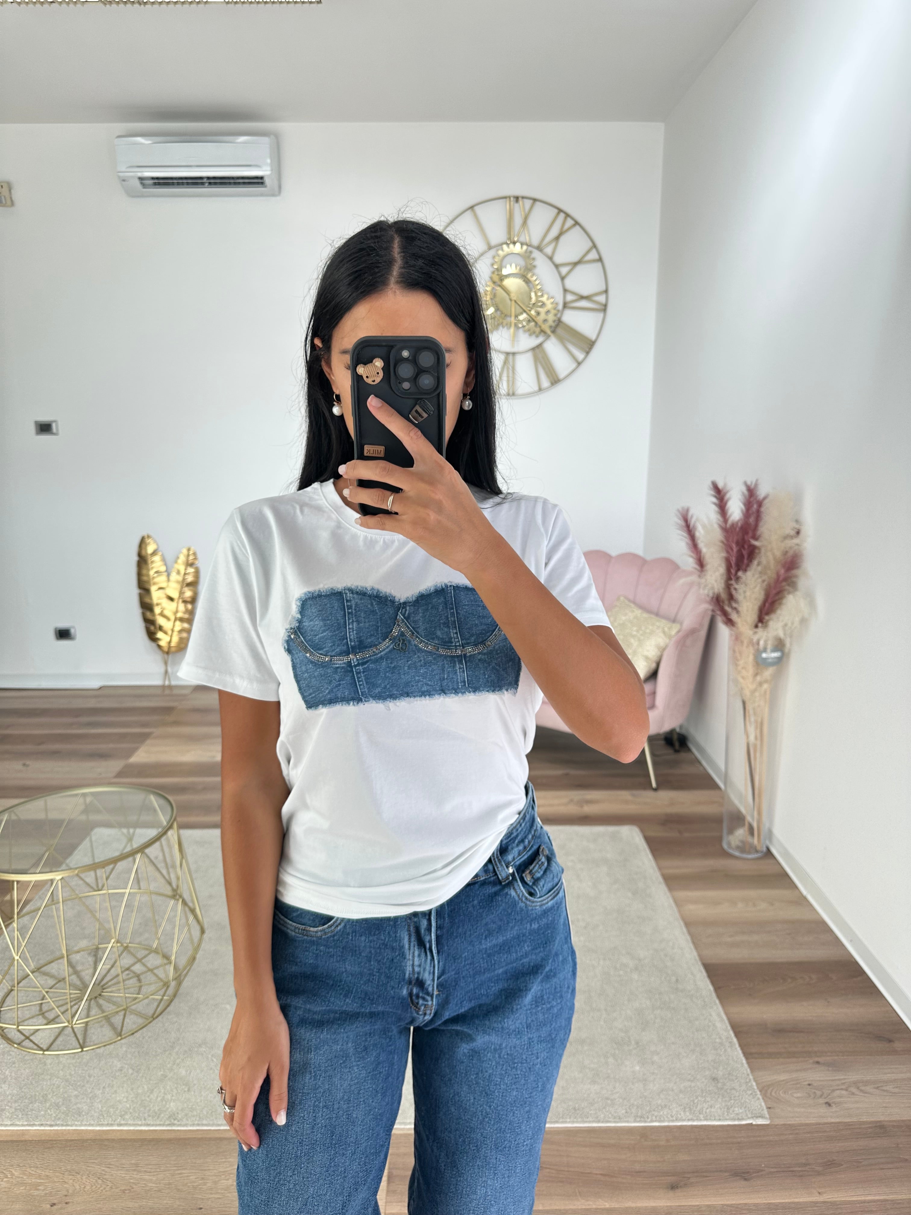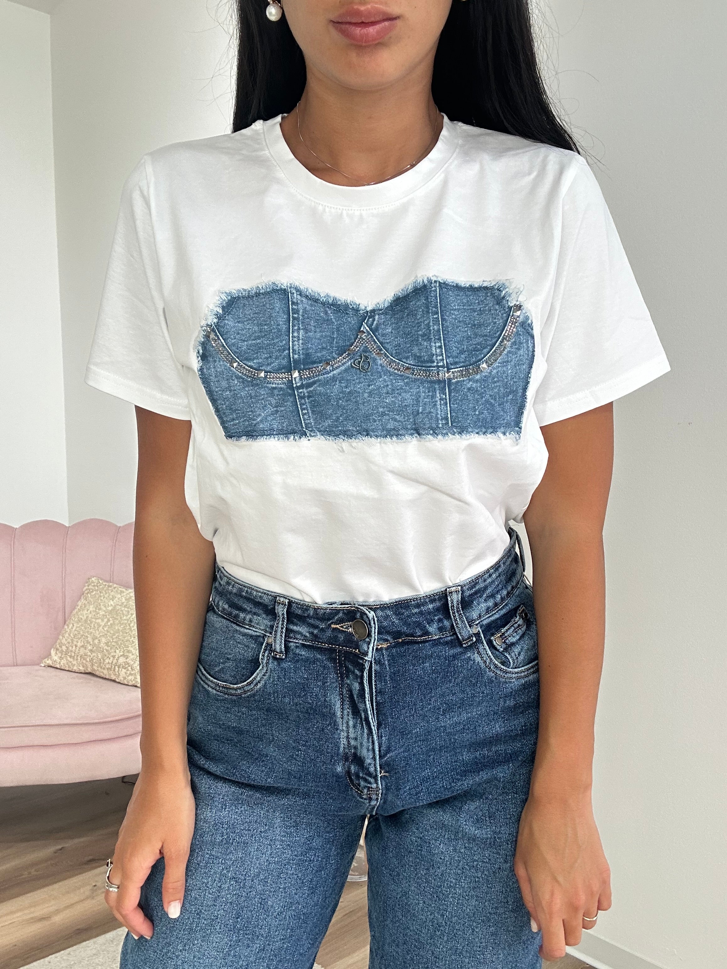 T-Shirt in cotone, lunghezza normale, elasticizzata con scritte ricamate
