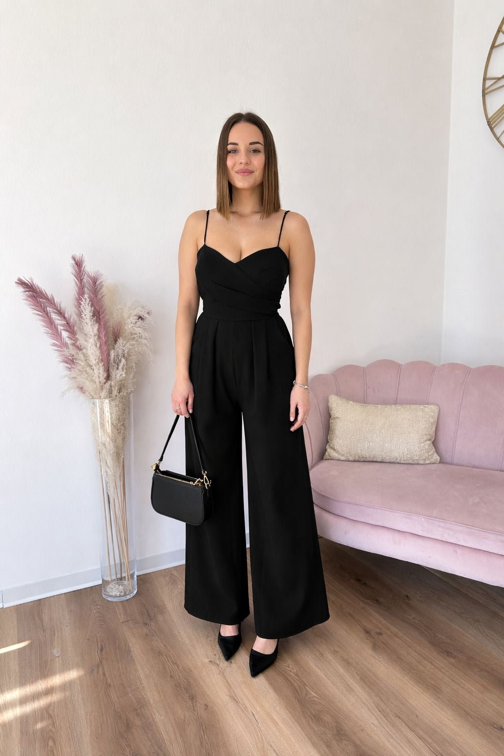 Tuta con pantalone a palazzo, tessuto elasticizzato, bretelle regolabili, coppe preformate, vita elastica.