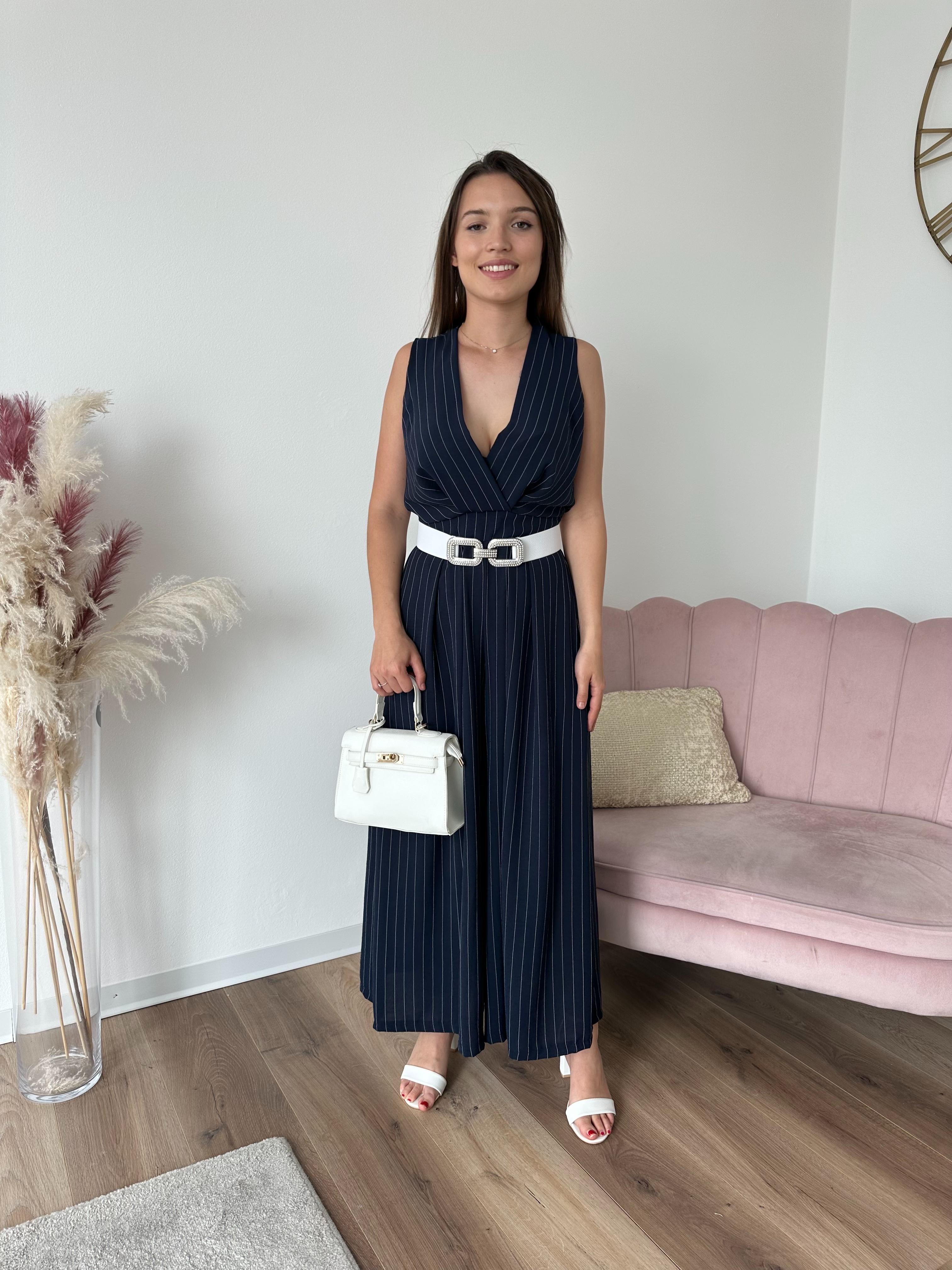 Tuta con gamba ampia, tessuto fresco, chiusura sul retro con bottoncino, vita elastica.