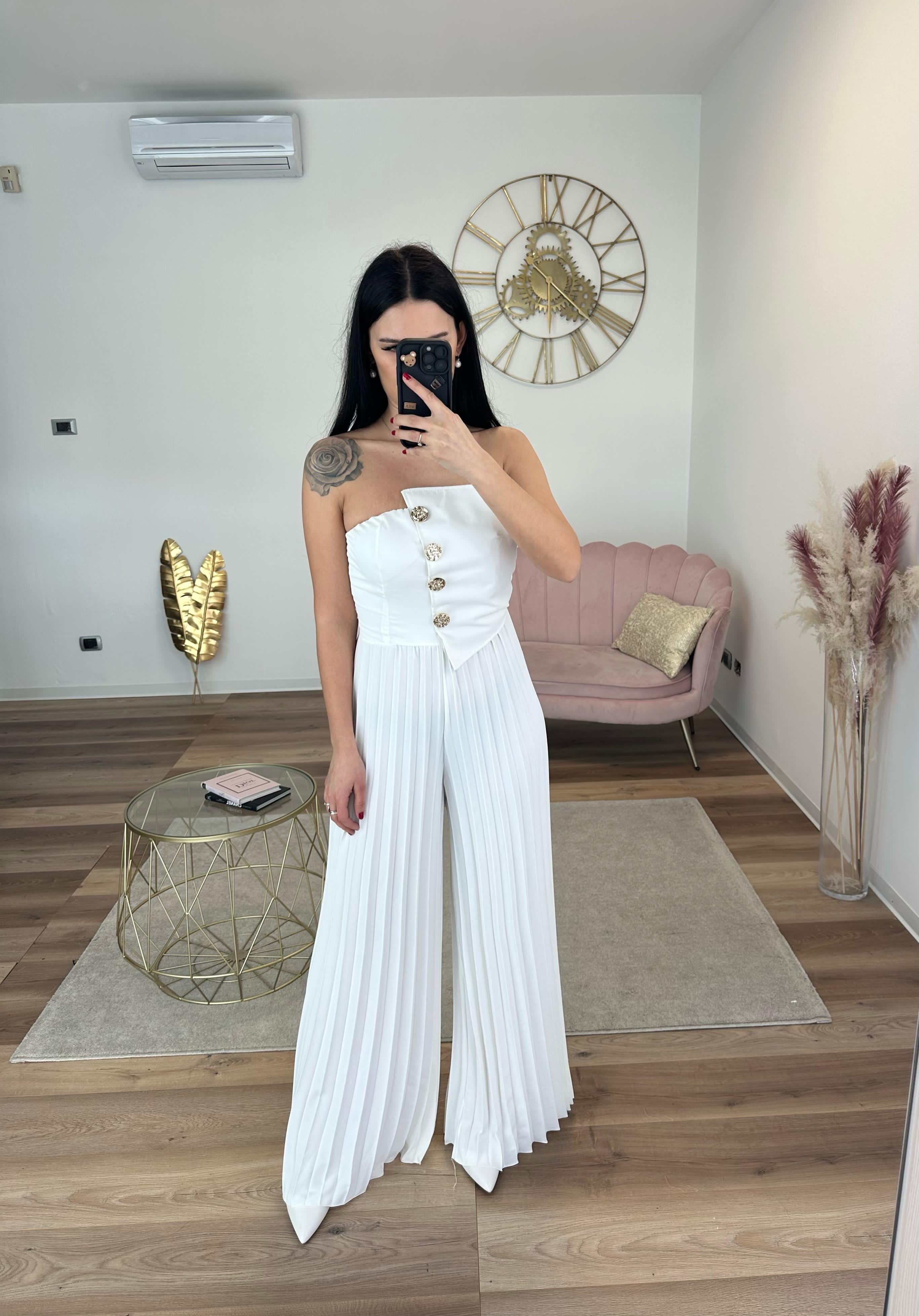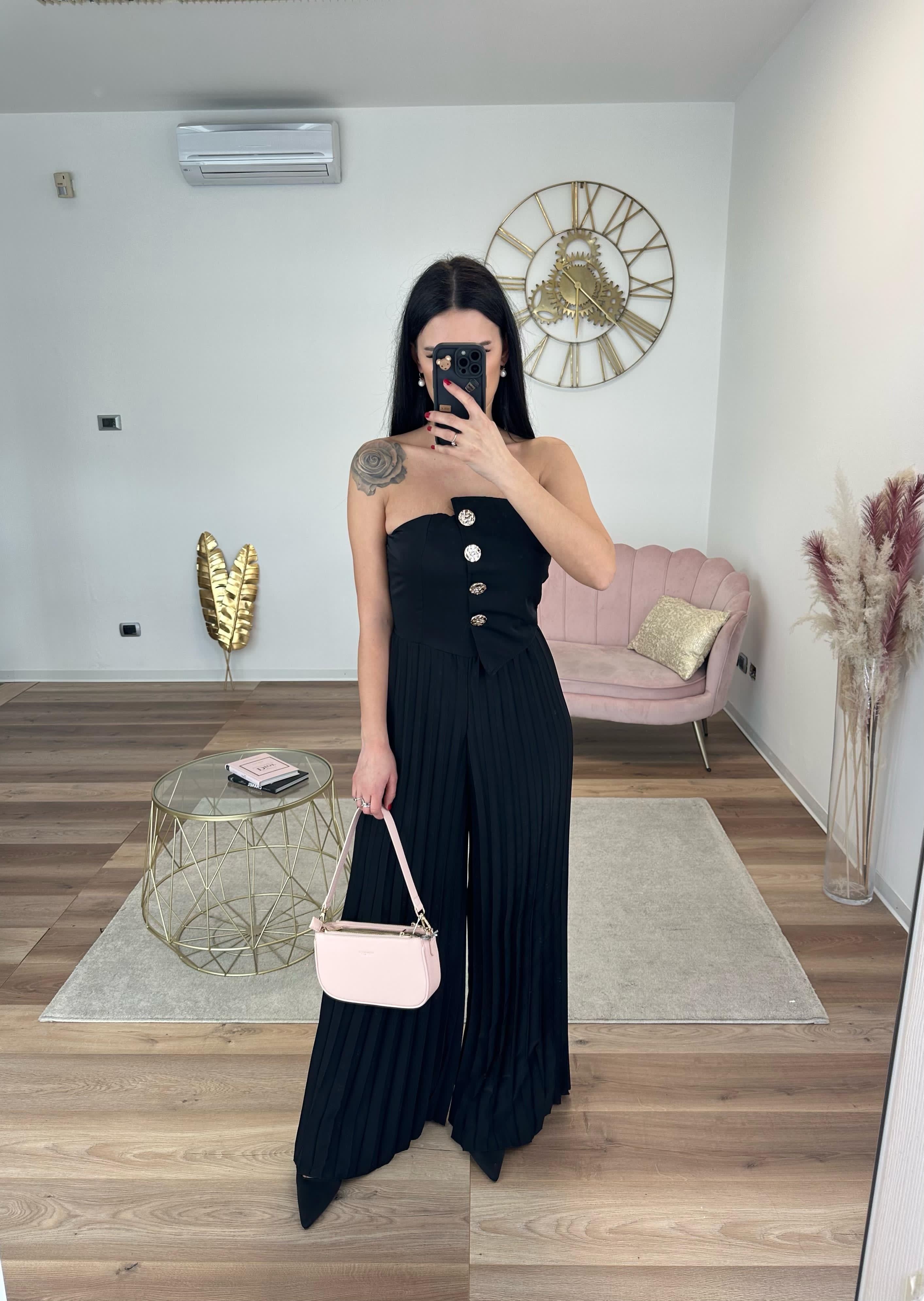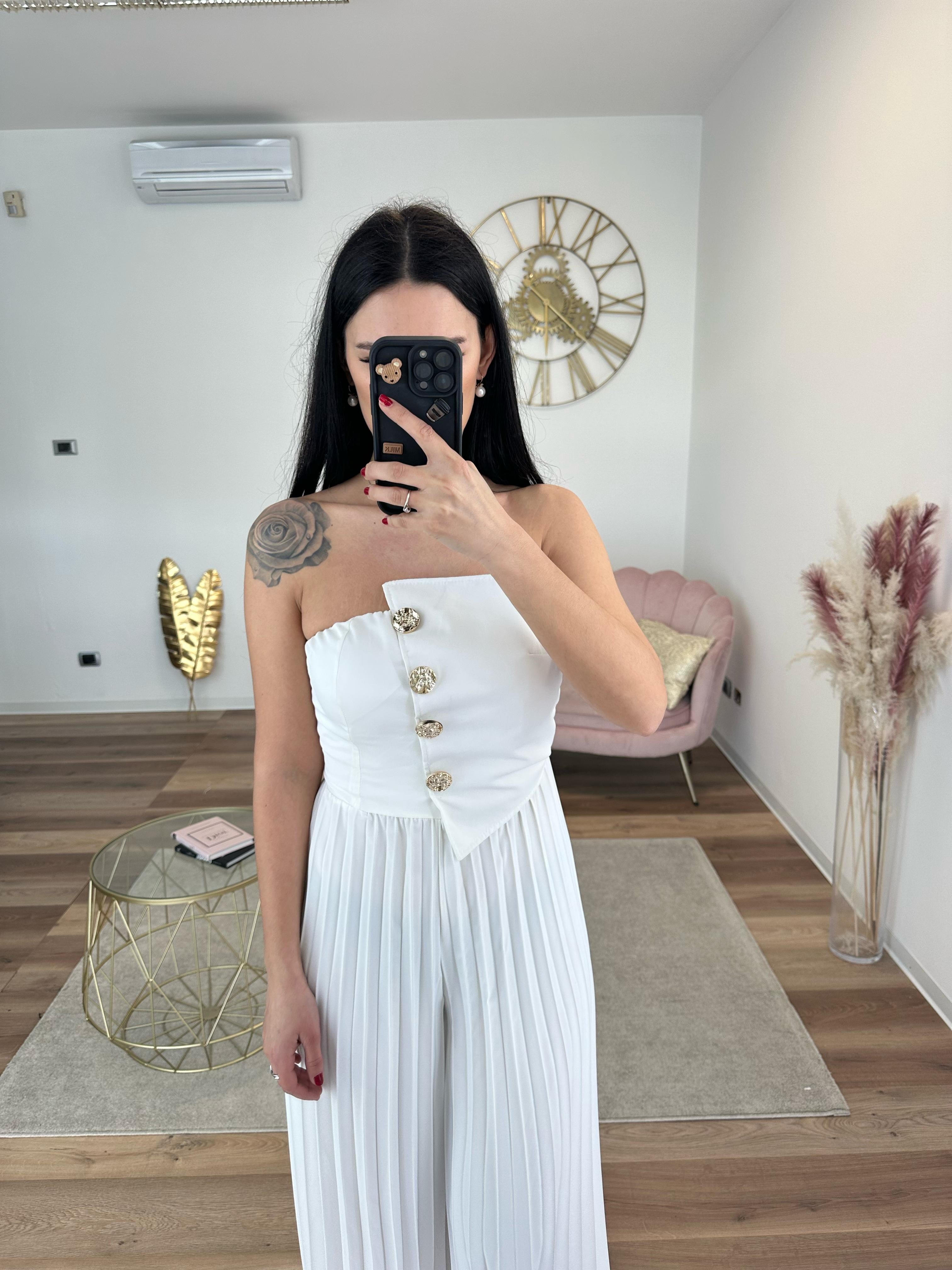 Tuta modello a fascia con finti bottoni dorati, pantalone plissettato, coppe preformate, elasticizzata.