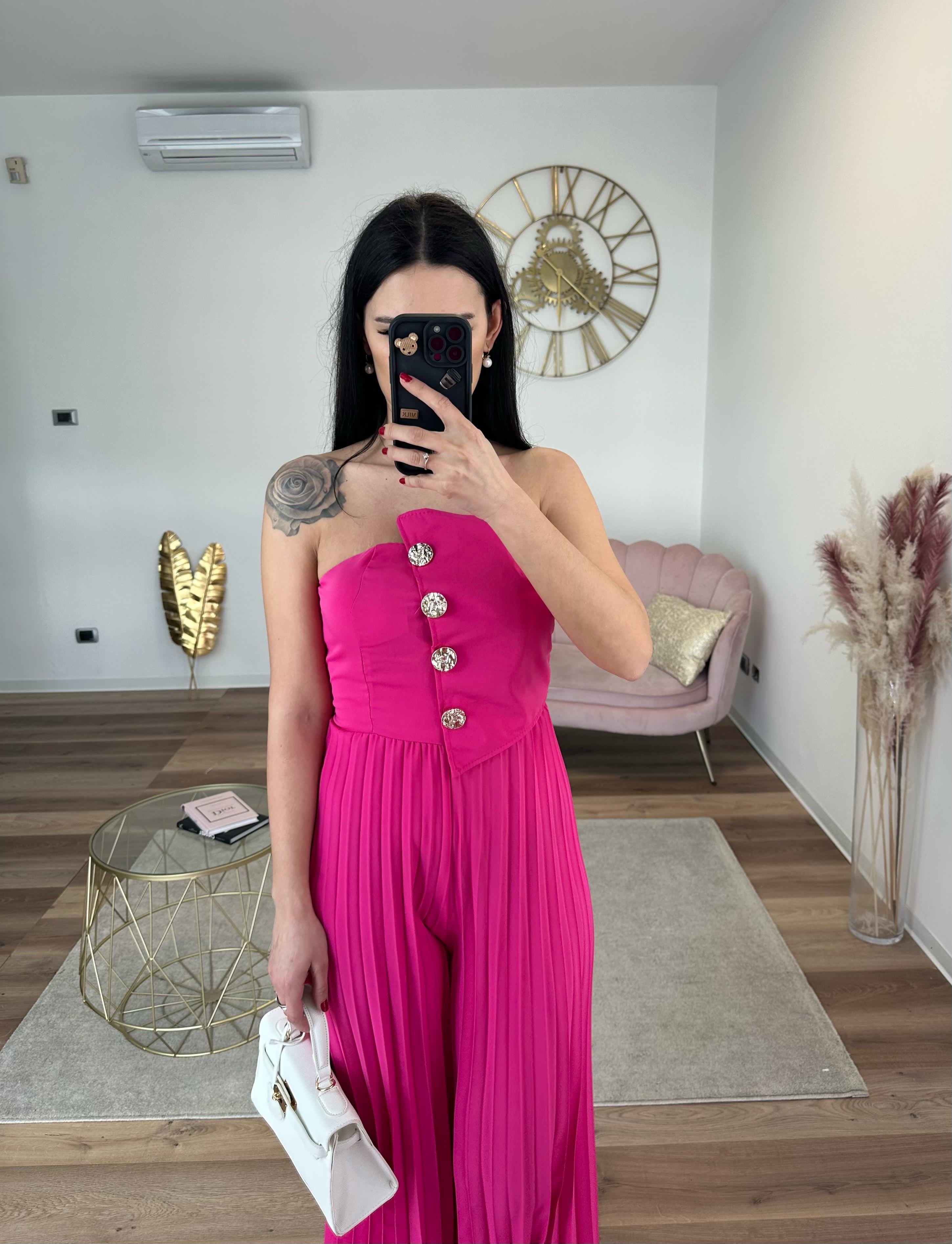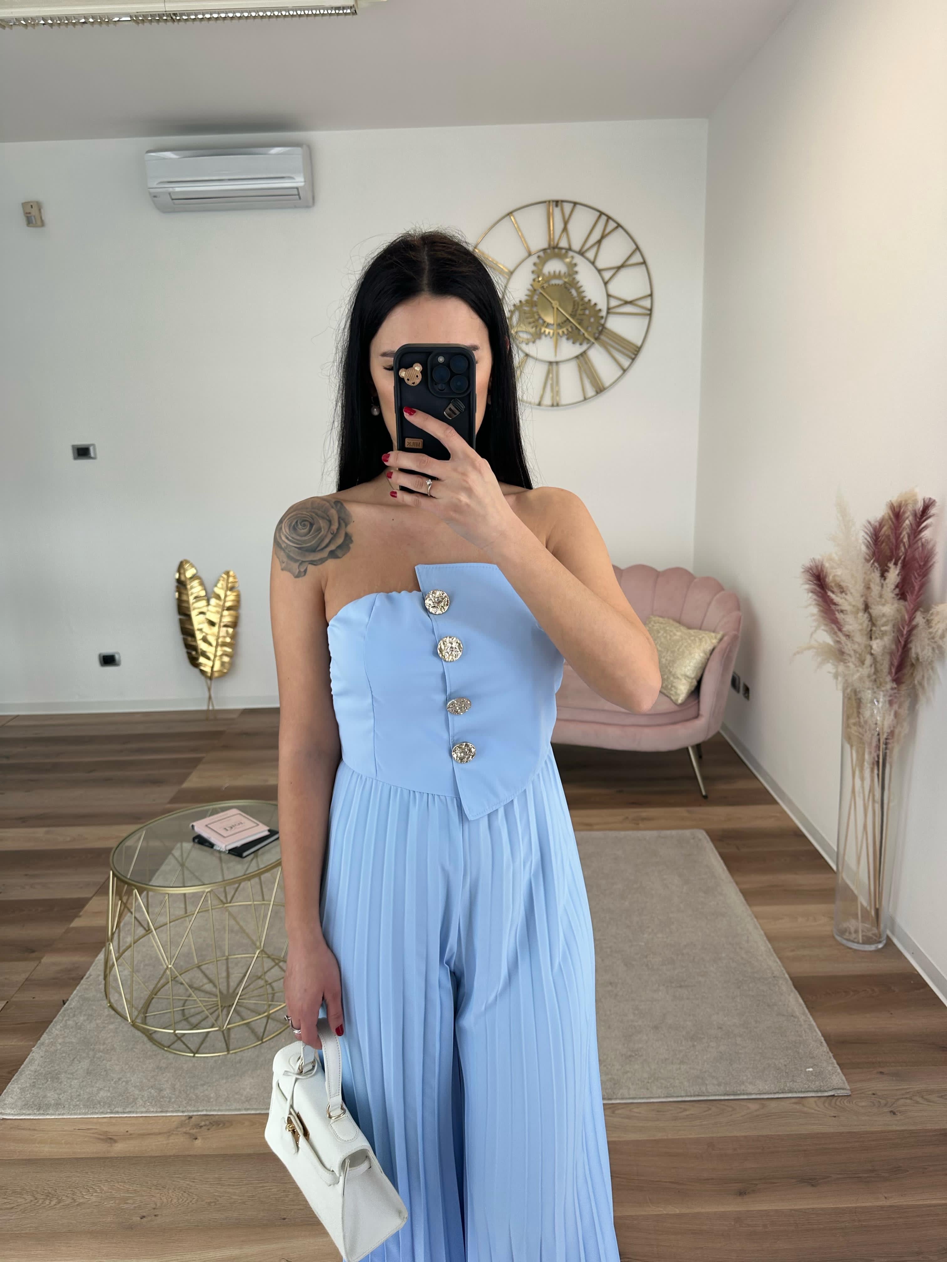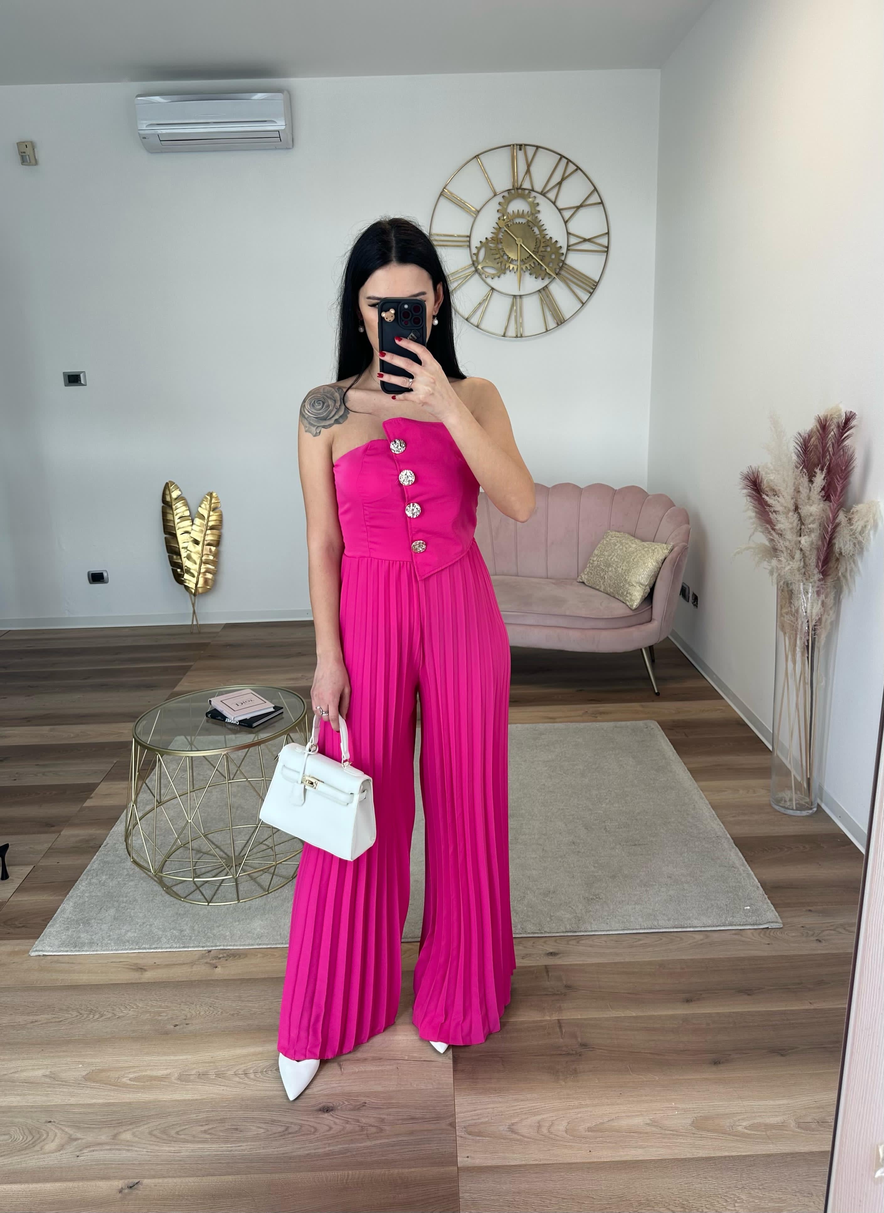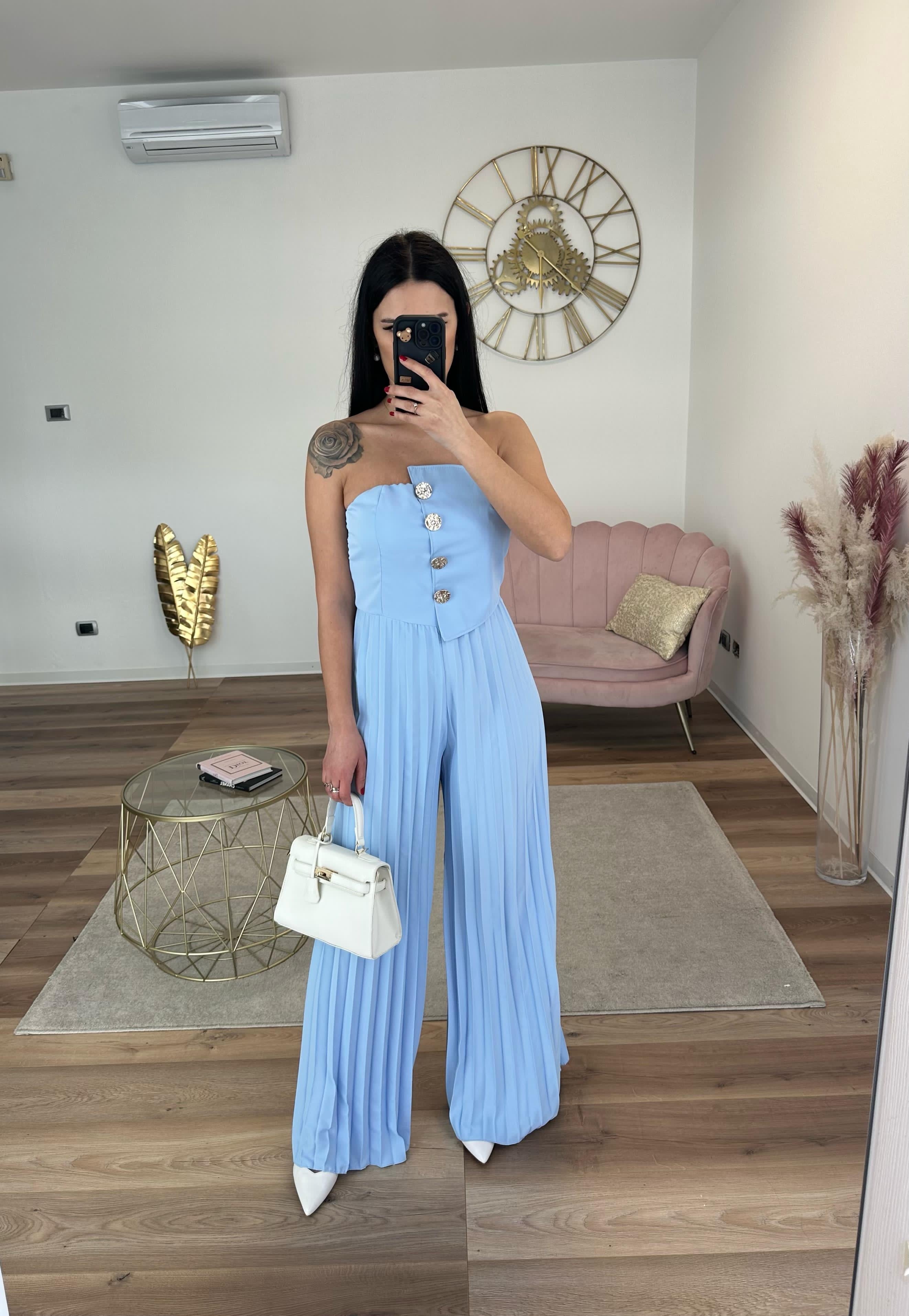 Tuta modello a fascia con finti bottoni dorati, pantalone plissettato, coppe preformate, elasticizzata.