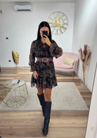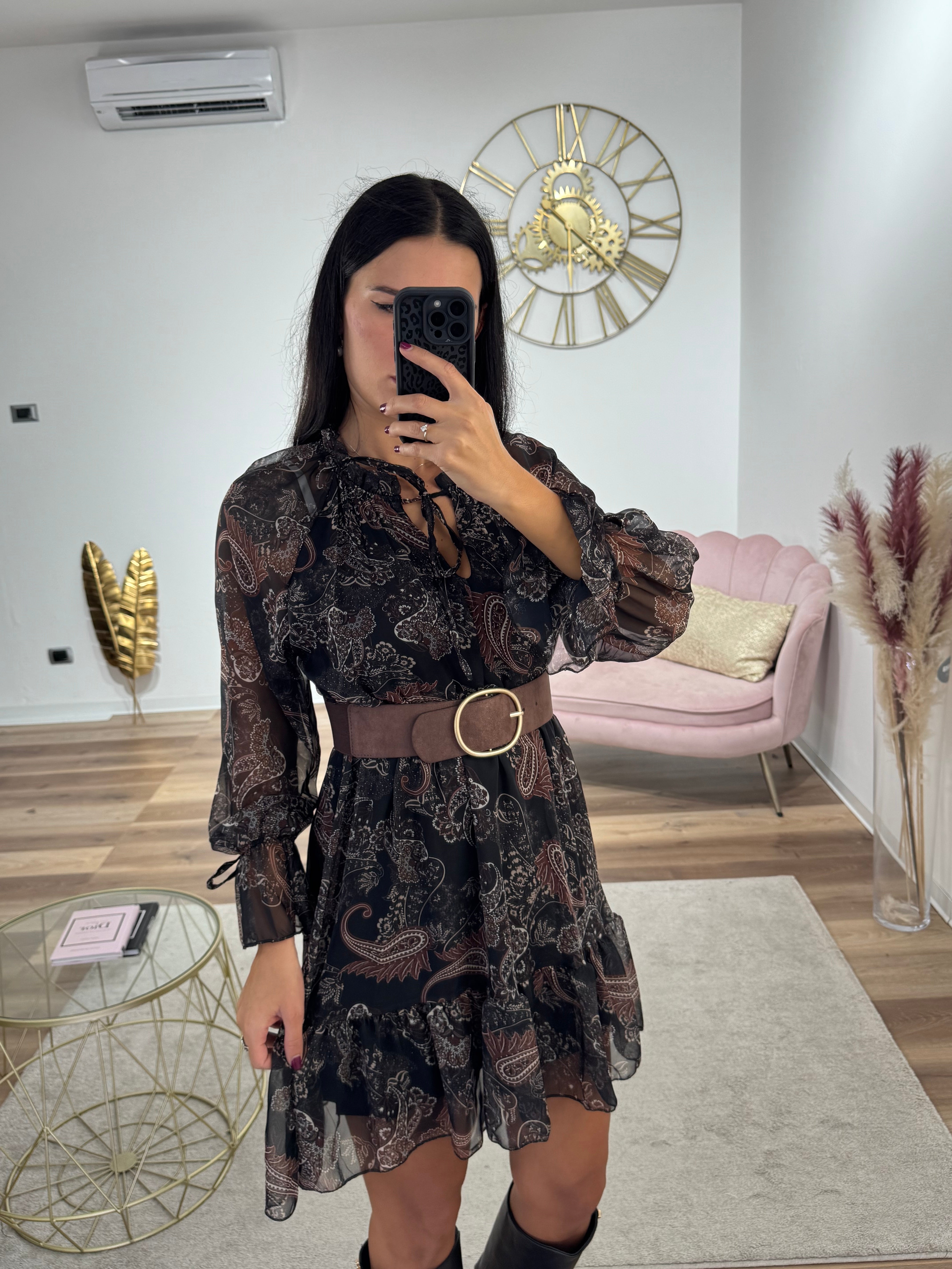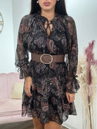 Abito corto con manica velata e a sbuffo, chiusura sul davanti con laccetto, completo di cinturino, scende morbido lungo i fianchi, completo di sottoveste e vita elastica