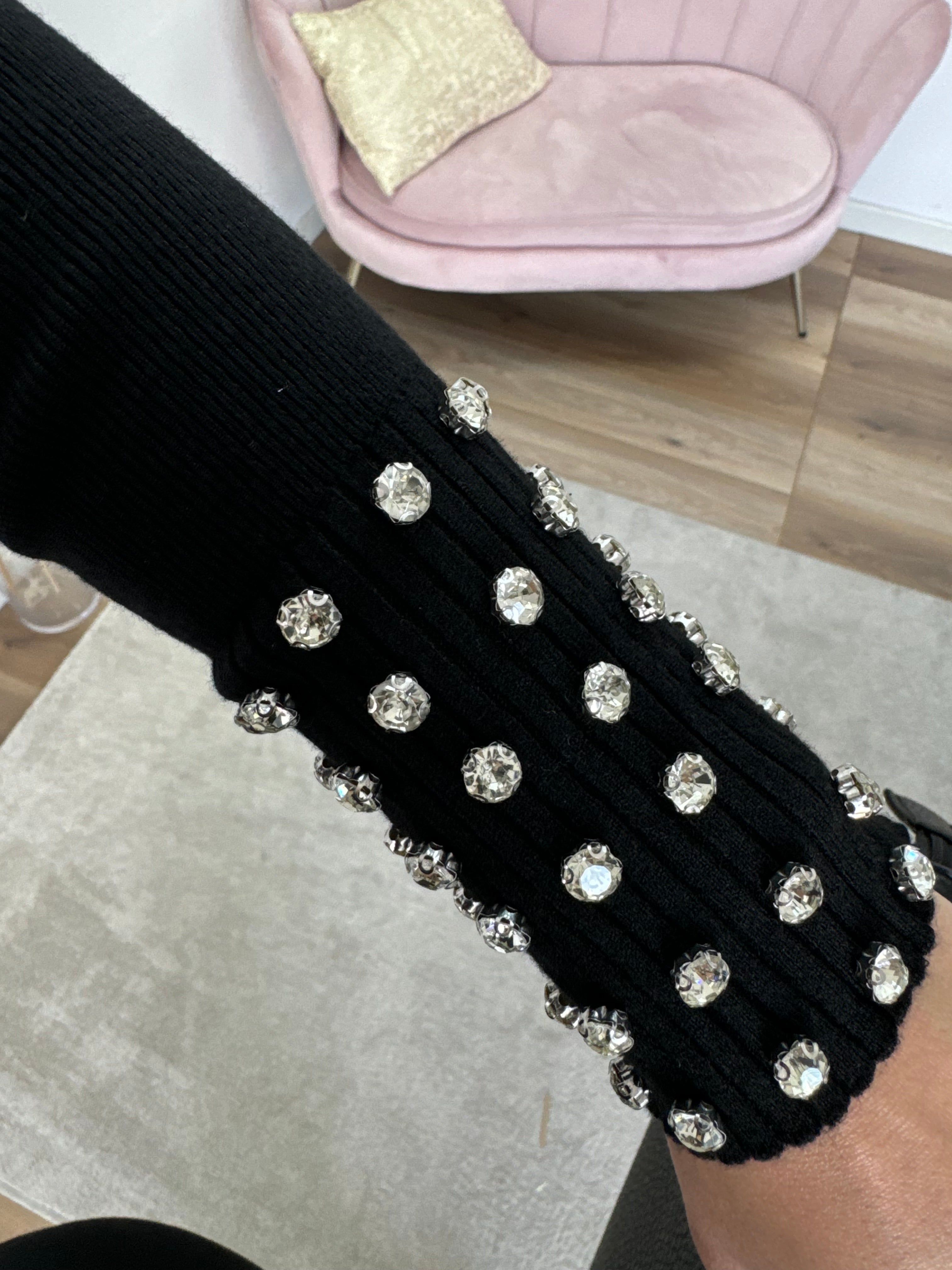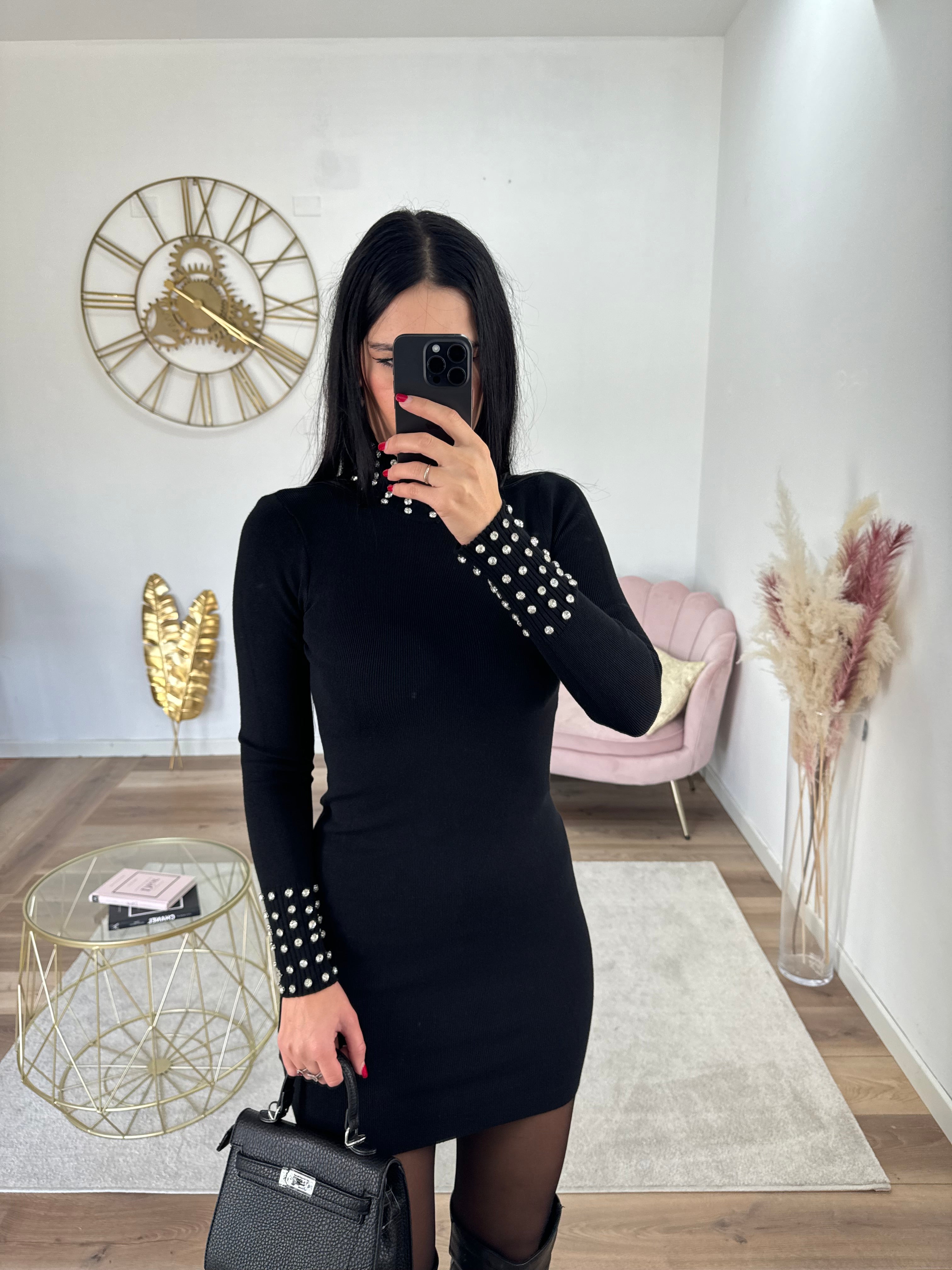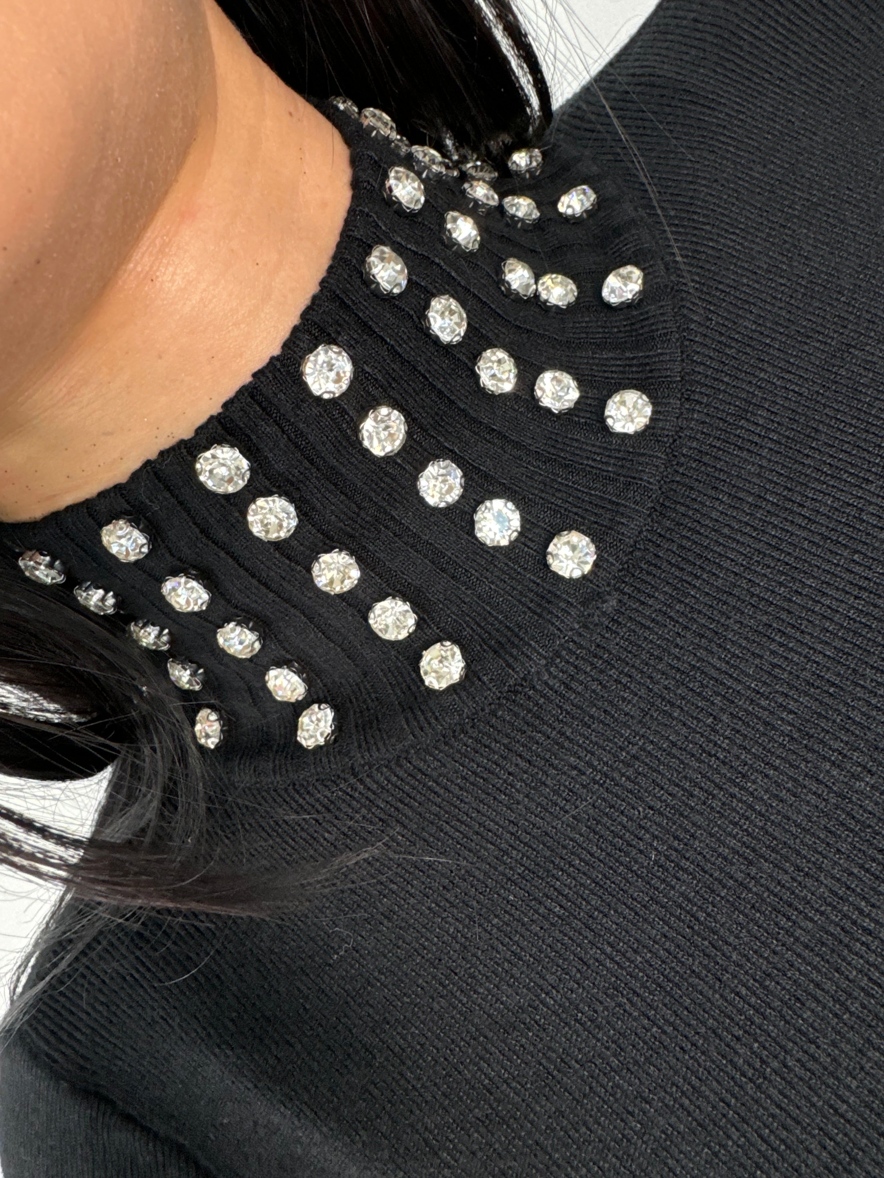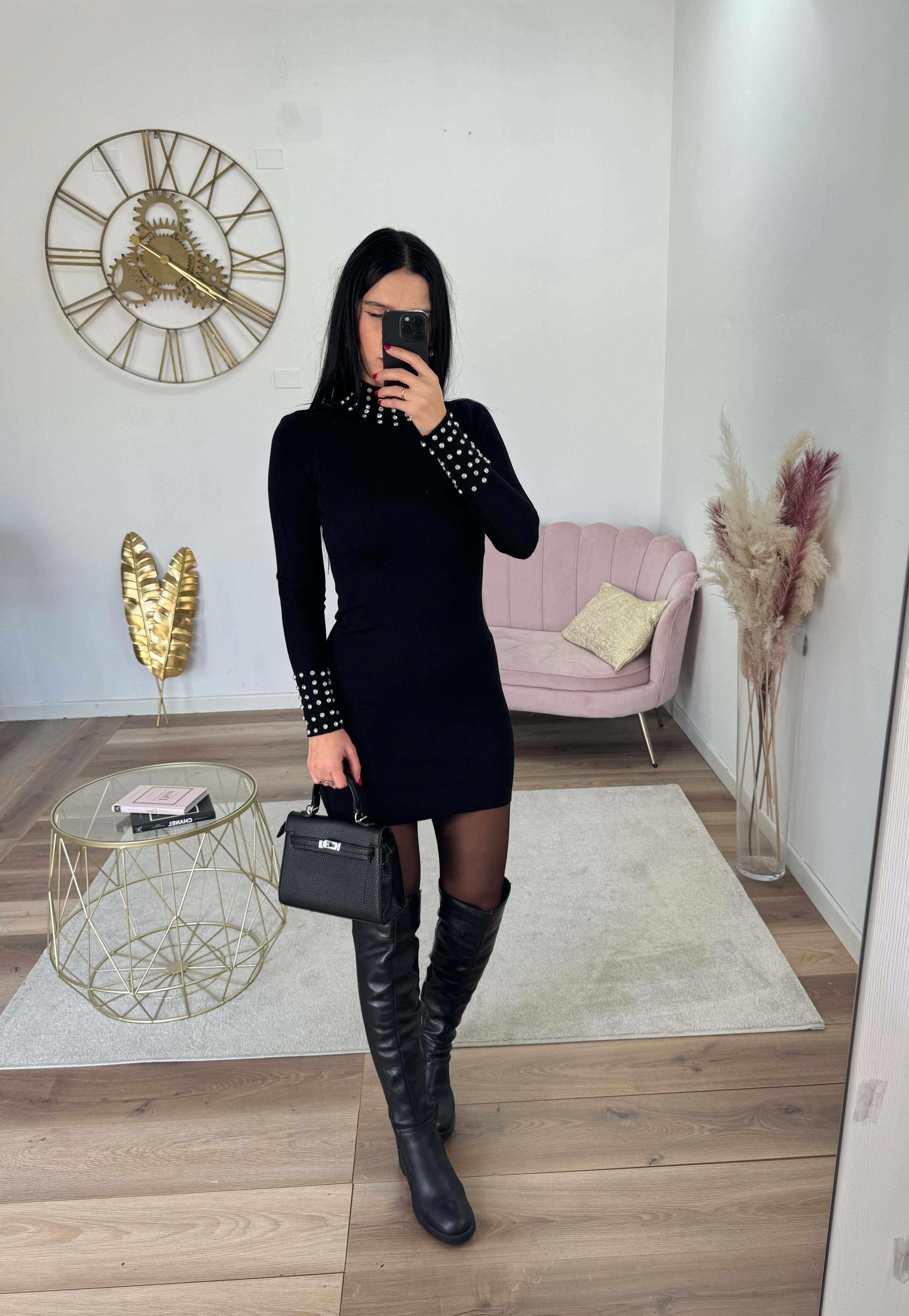 Abito in maglia con strass sulle maniche e sul collo, aderente ma elasticizzato