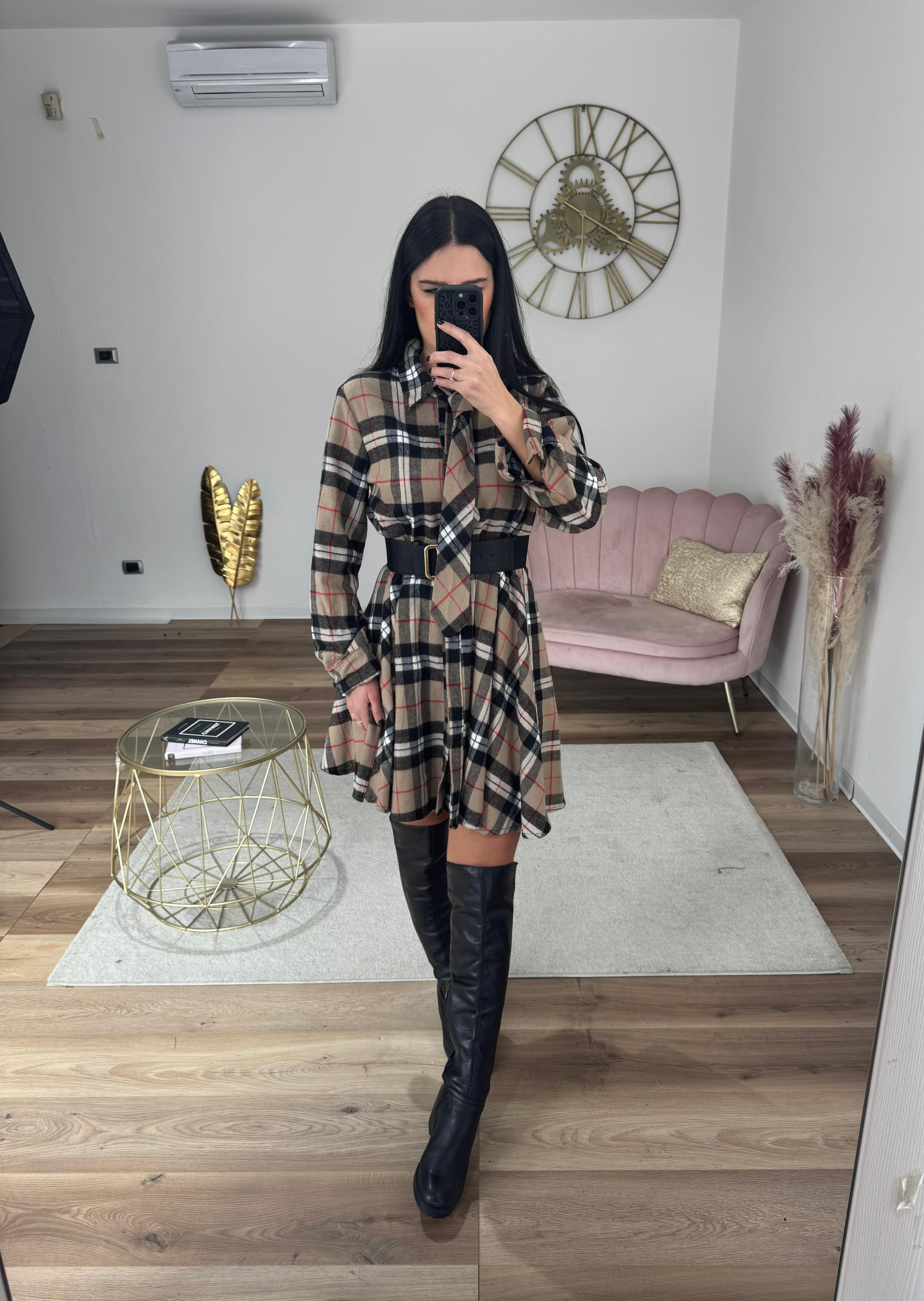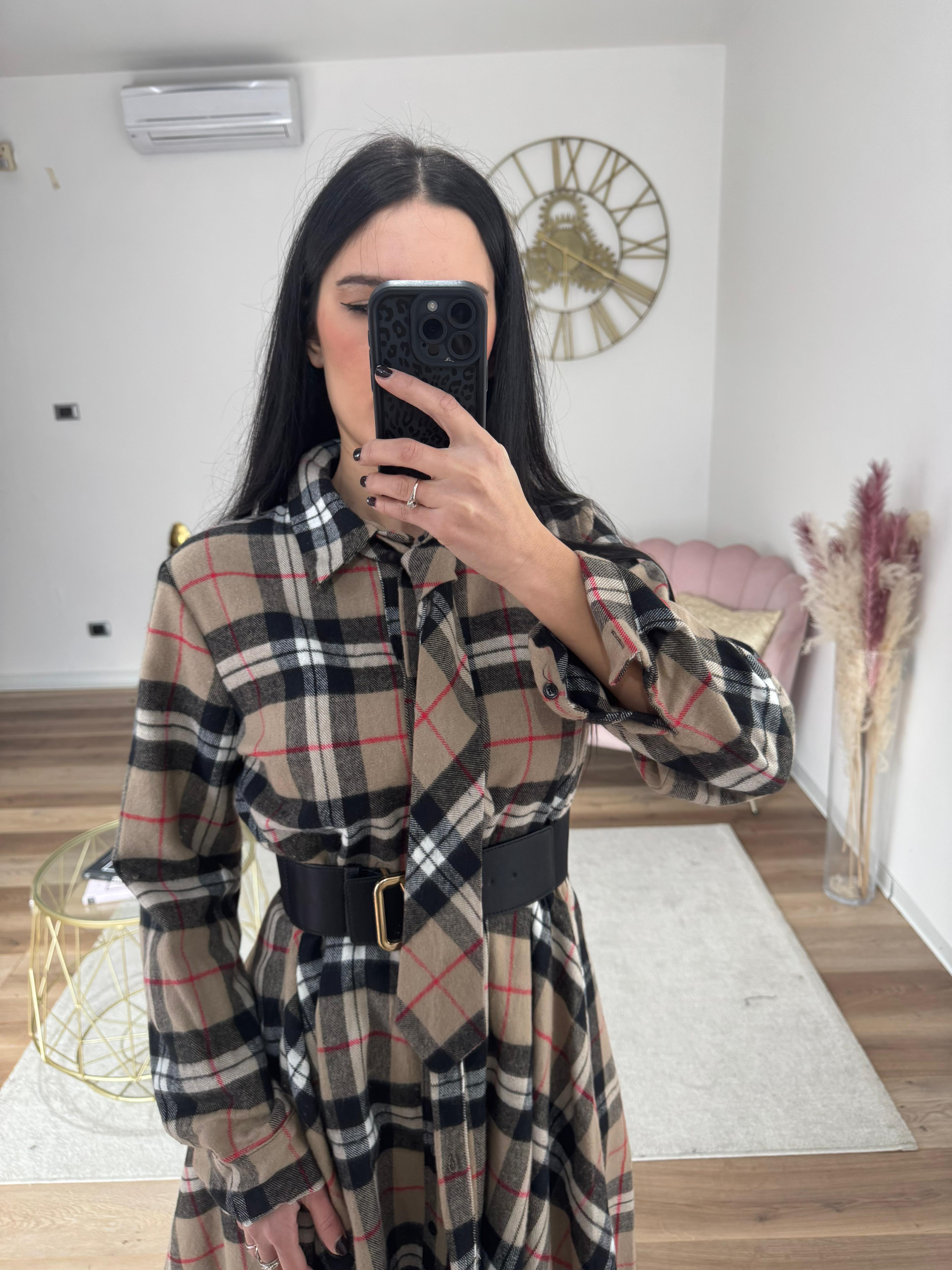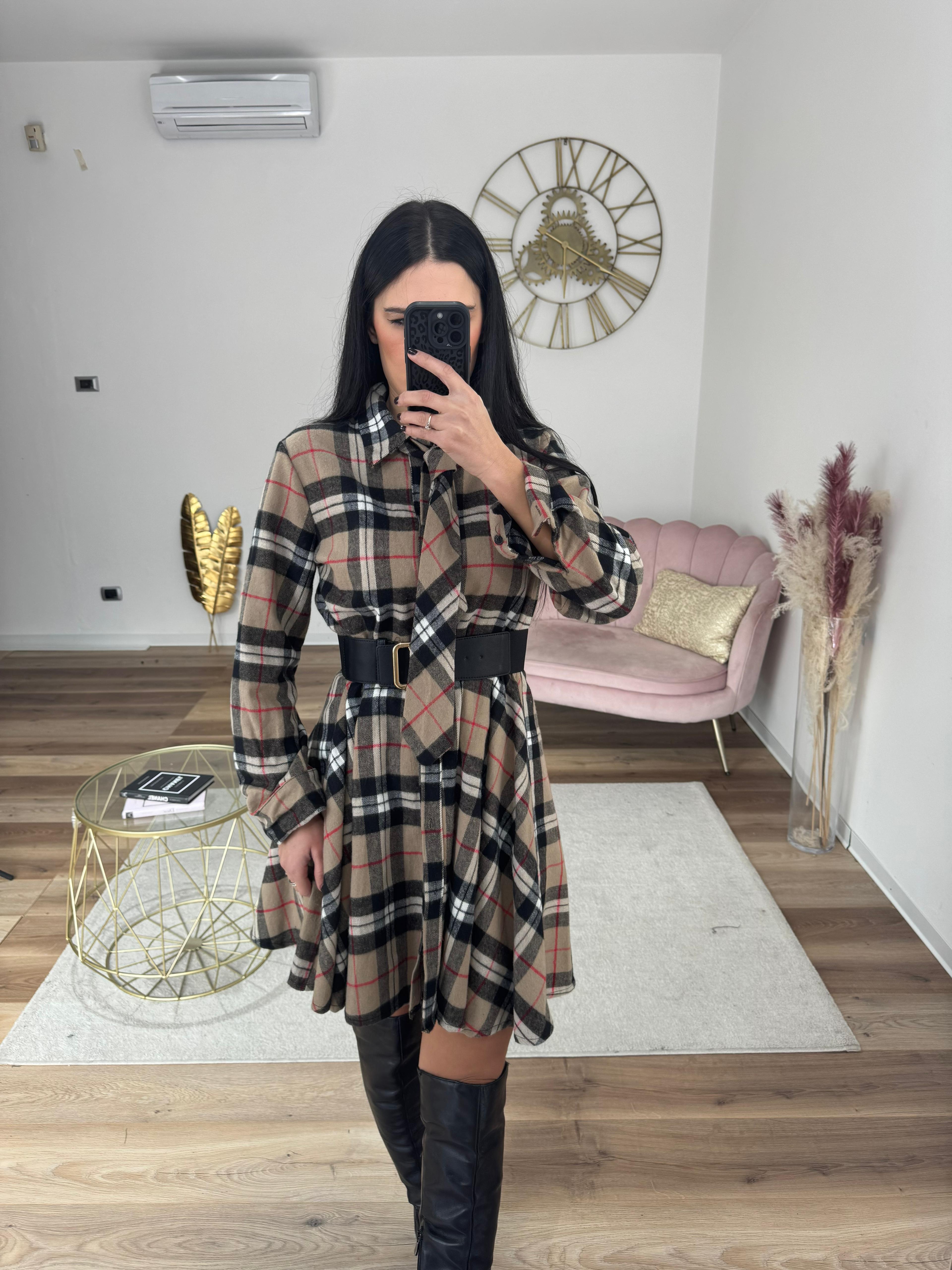 Abito in fantasia simil burberry con tessuto in flanella, caldo e vita elastica, completo di cravattina e cinturino (non quello della foto), perfetto per chi non ama gli abiti troppo corti
