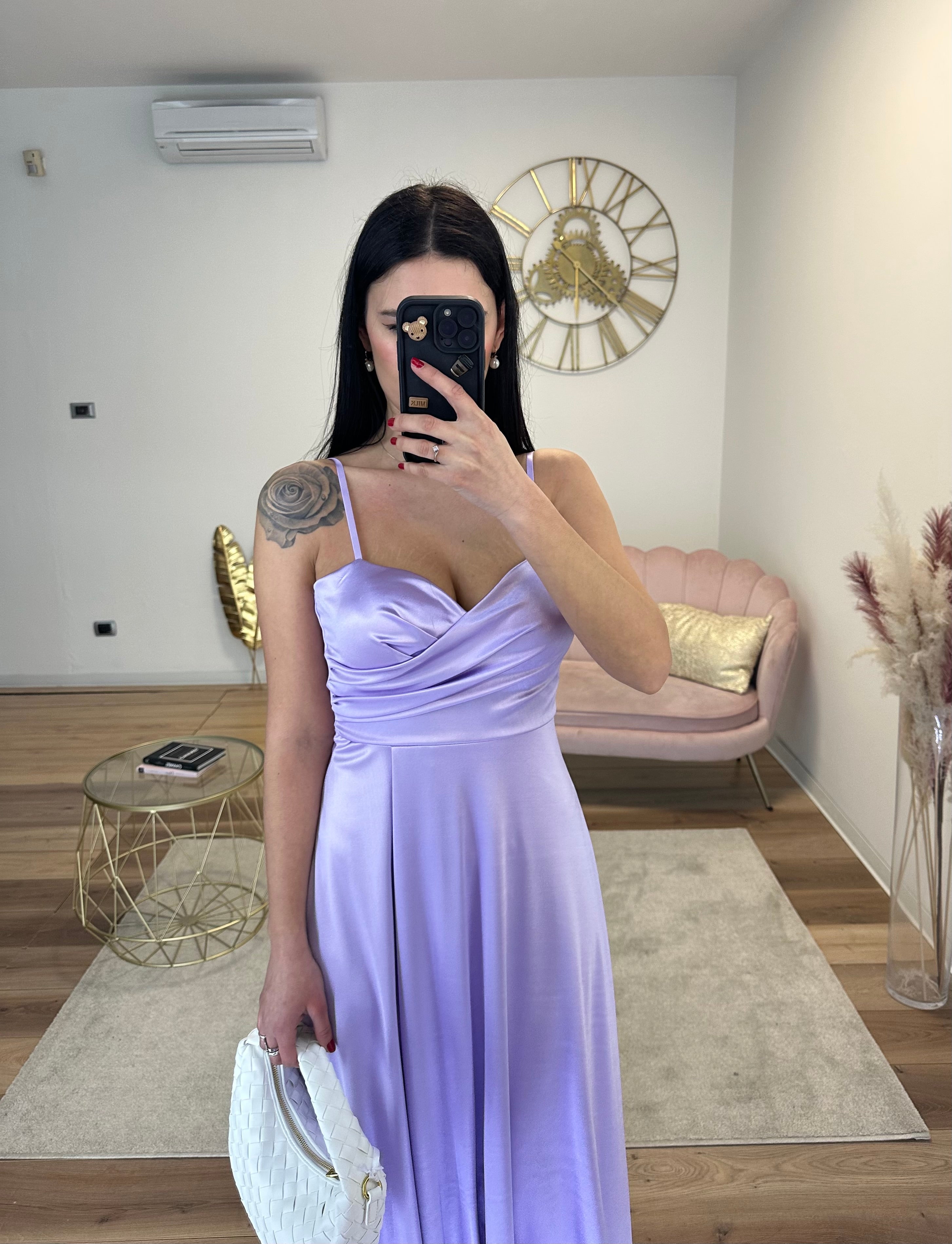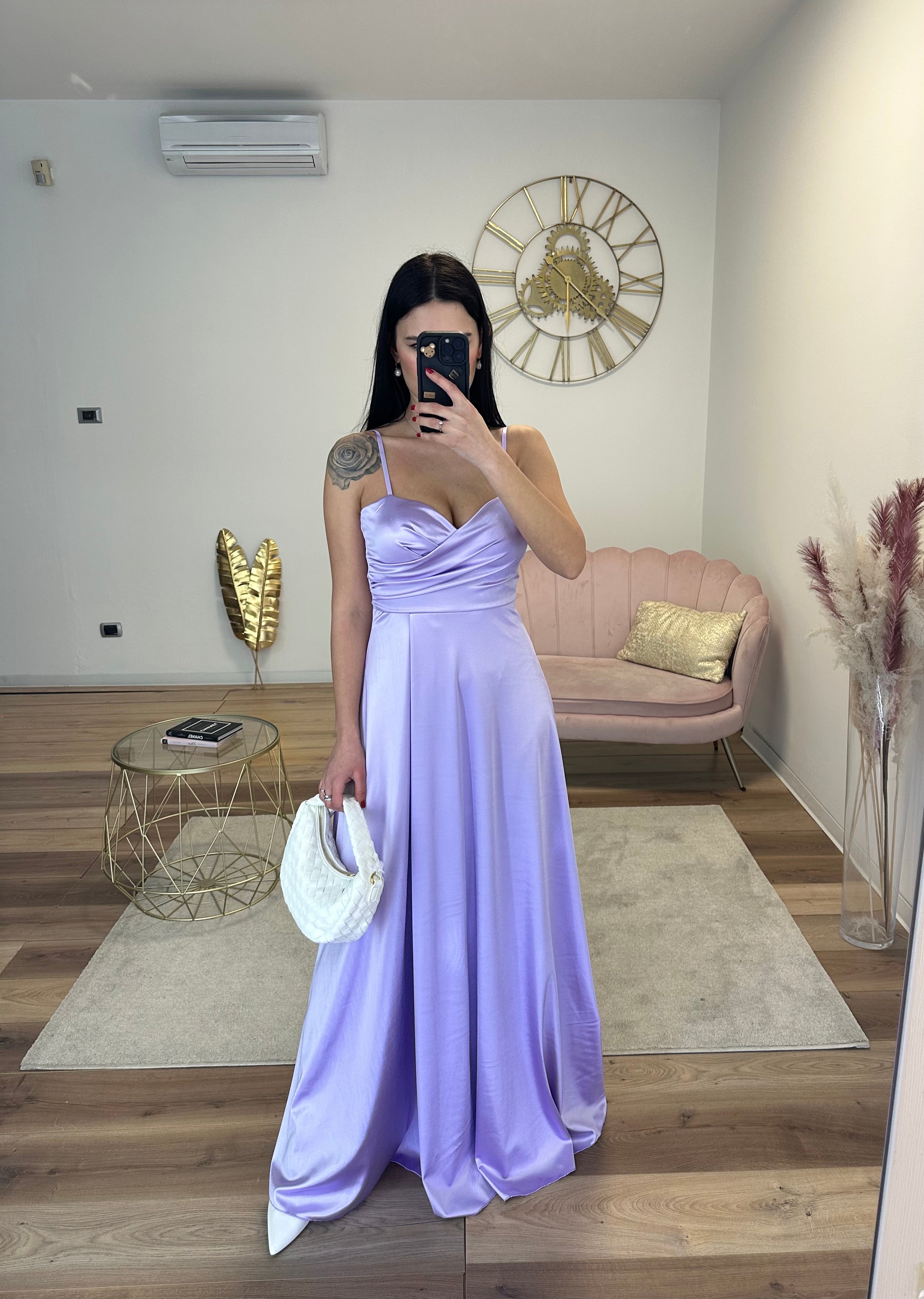 Abito elegante in raso, coppe preformate, si chiude con zip, bretelle regolabili, spacco laterale.