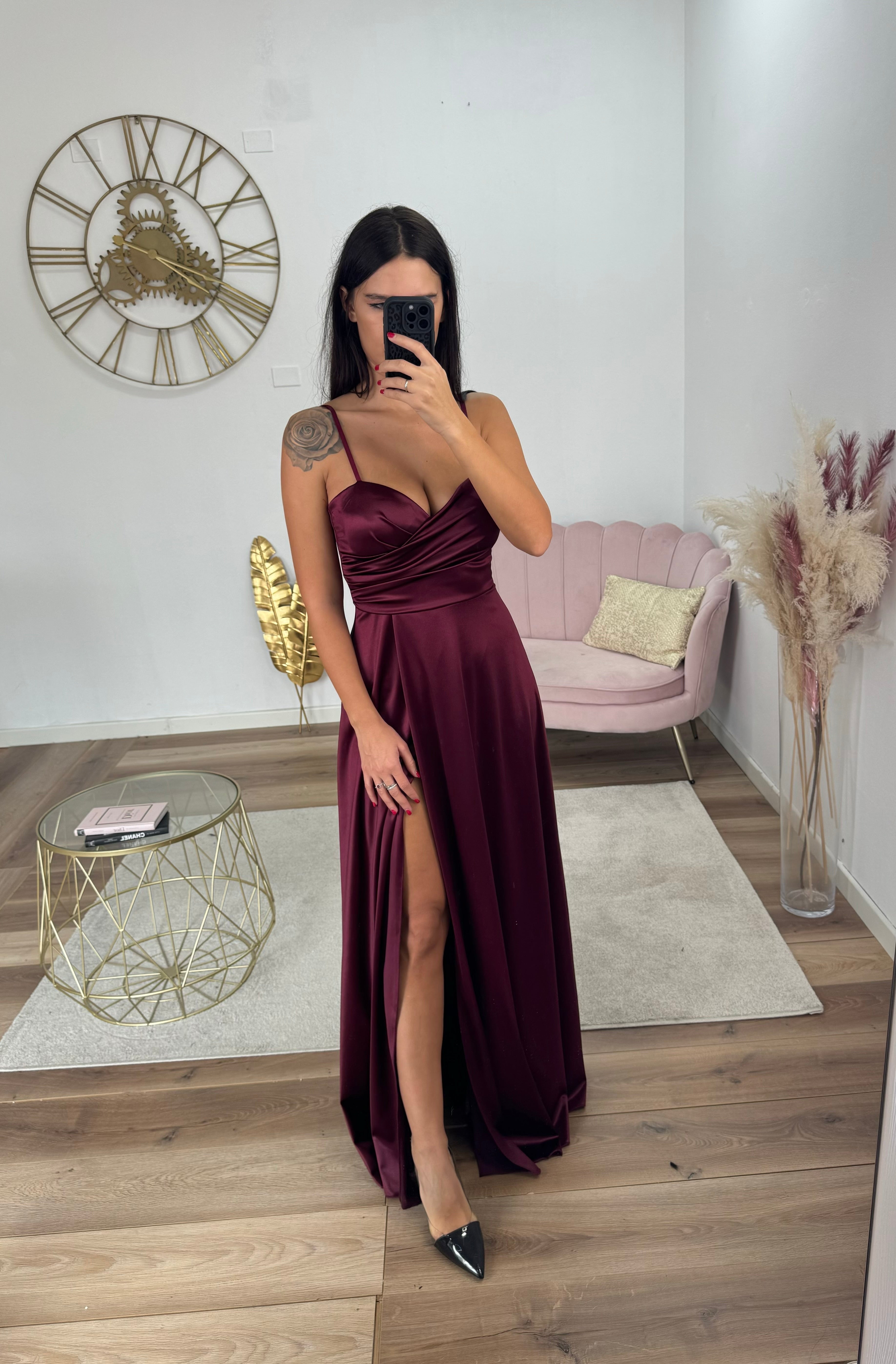 Abito elegante con tessuto in raso, coppe preformate, bretelle regolabili e spacco laterale. Si chiude dietro con zip.