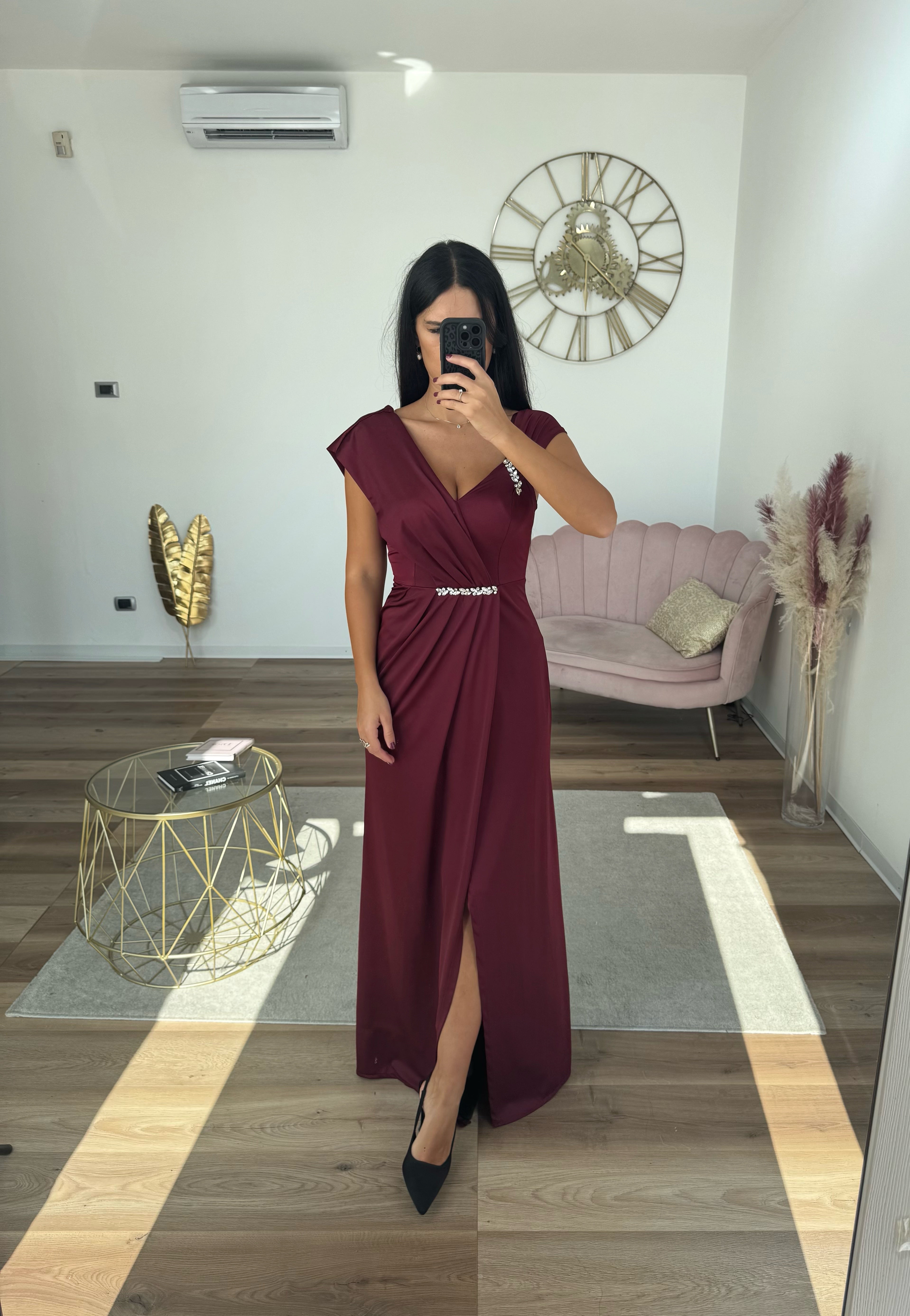 Abito elegante elasticizzato, con strass sul corpetto, maniche particolari, bretelle elasticizzate e regolabili, coppe preformate, con spacco, chiusura con zip nel retro, vita elastica