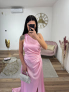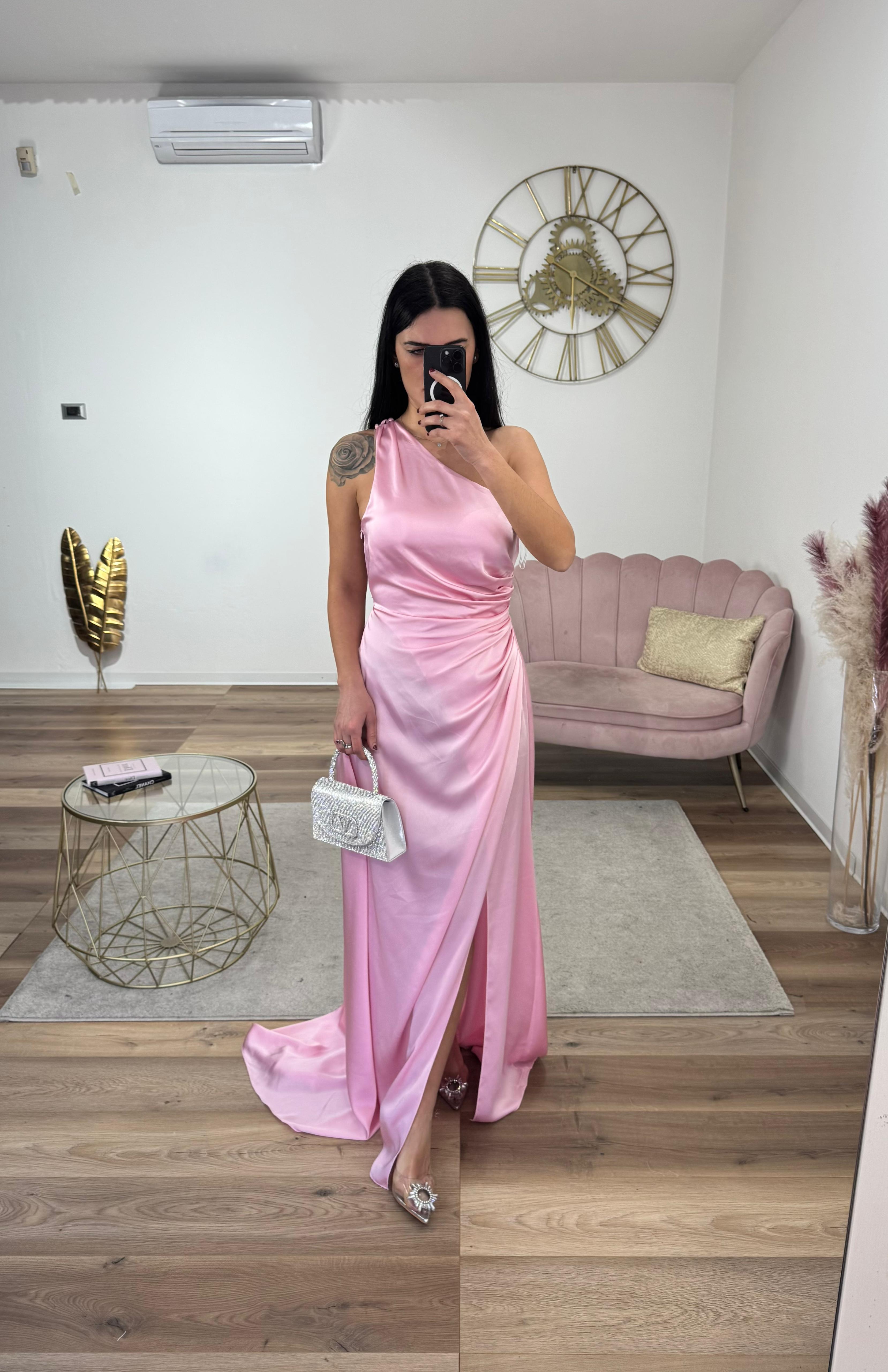 Abito in raso modello monospalla con zip laterale, coppe preformate, spacco sul davanti, strascico molto lungo, tessuto elasticizzato.
