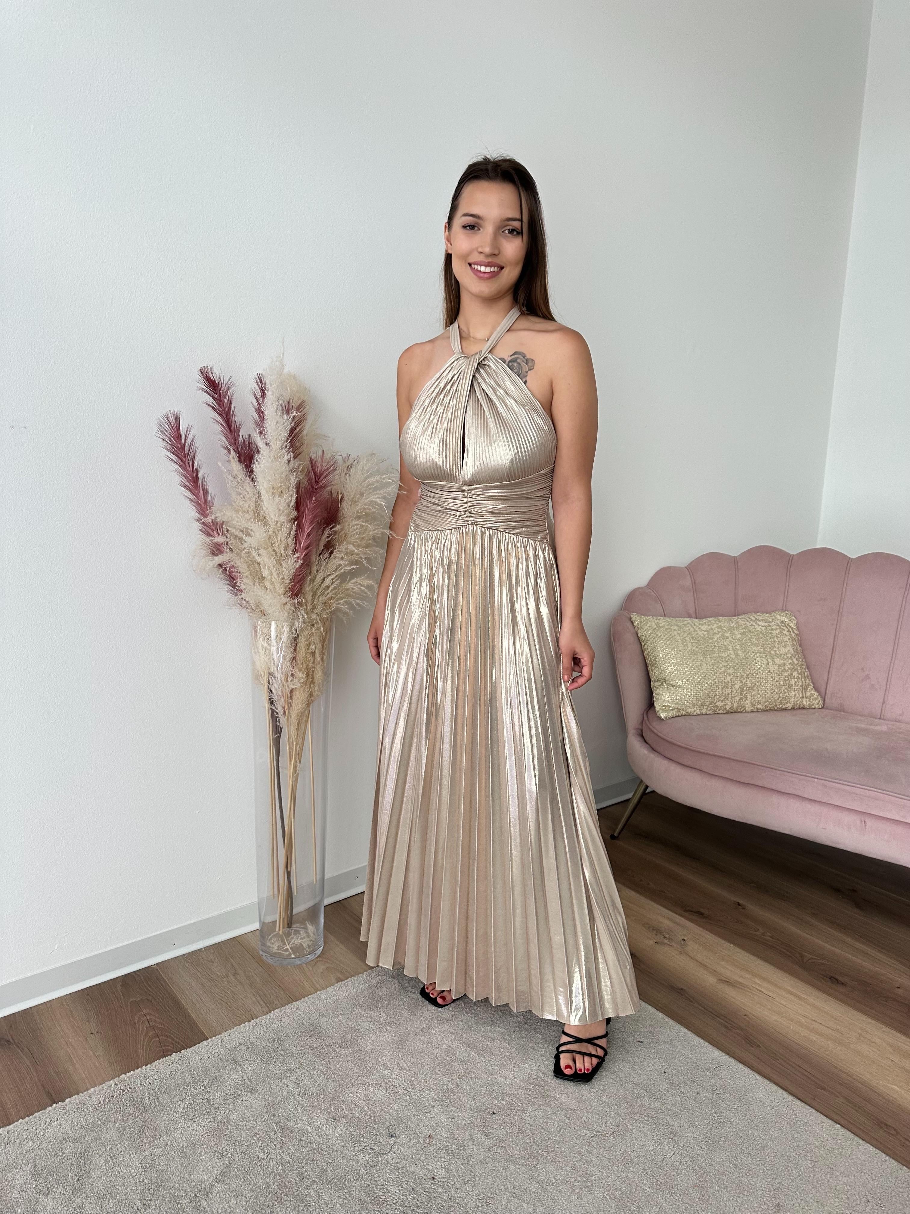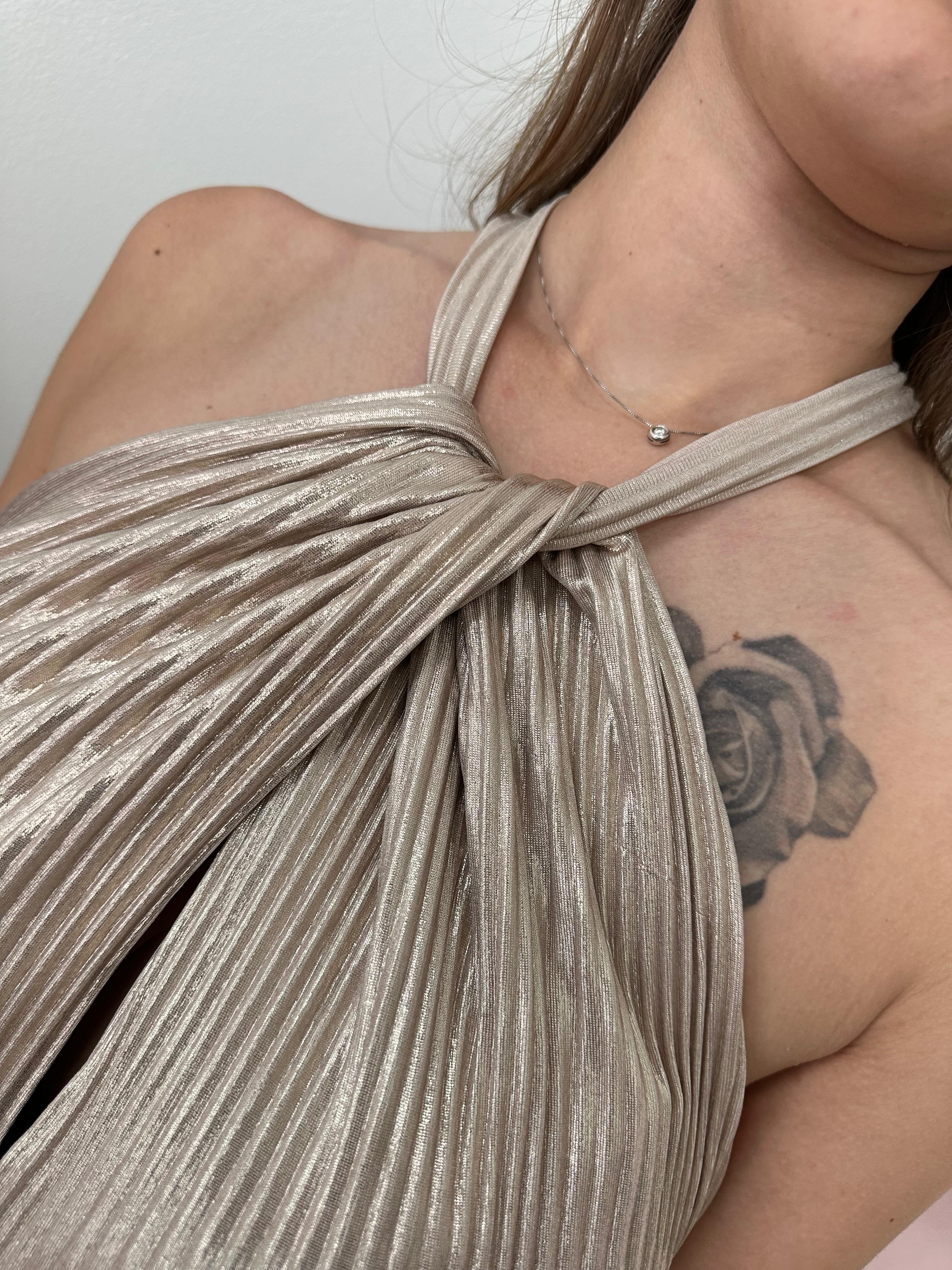 Abito elegante con particolare scollo, tessuto effetto metallizzato, elasticizzato, le coppe non sono preformate, si chiude sul retro con bottoncini