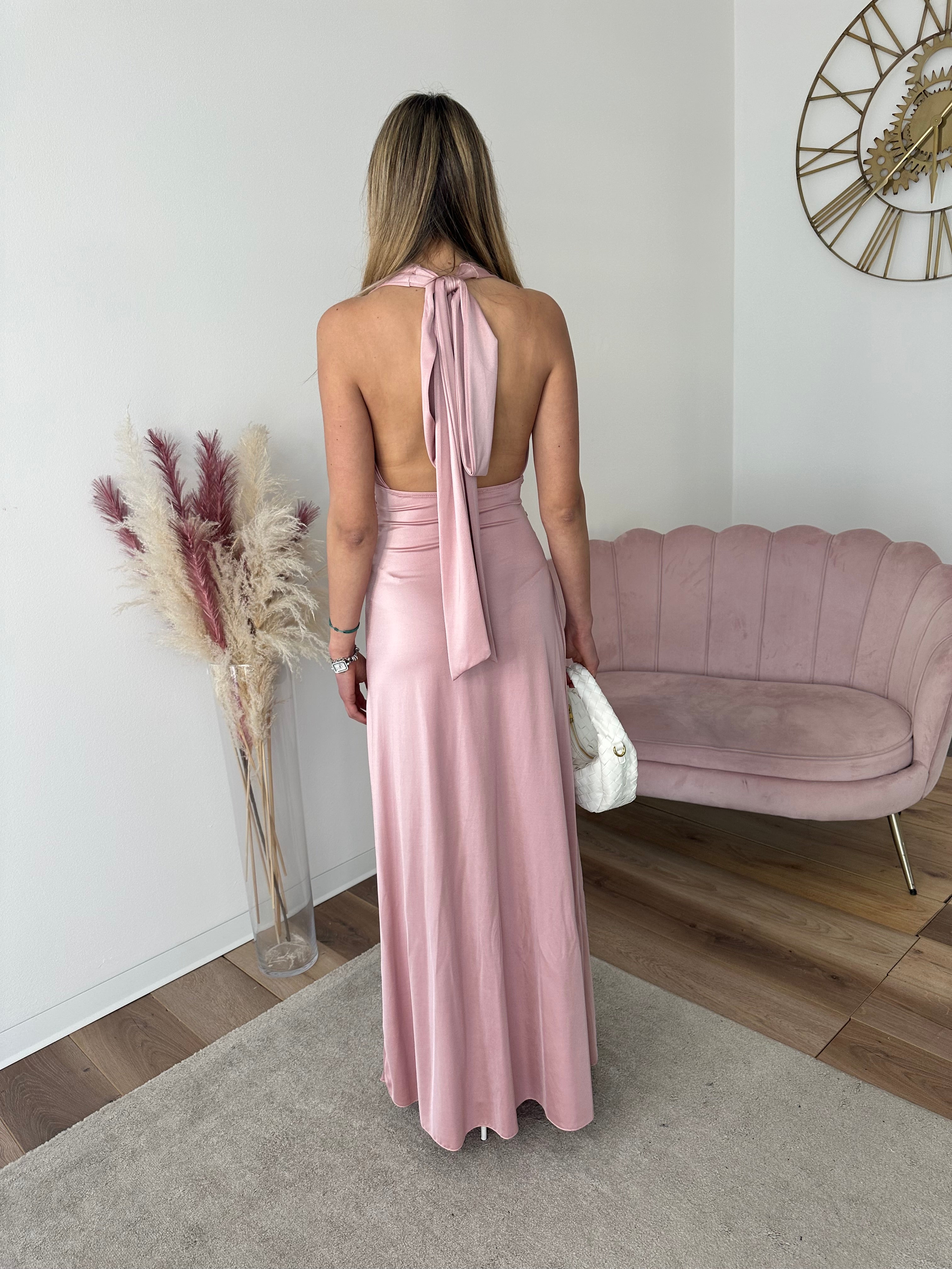 Abito elegante in tessuto raso, elasticizzato, con coppe preformate, si chiude al collo con il proprio laccio, schiena scoperta, spacco sul davanti, particolare intreccio sulla vita