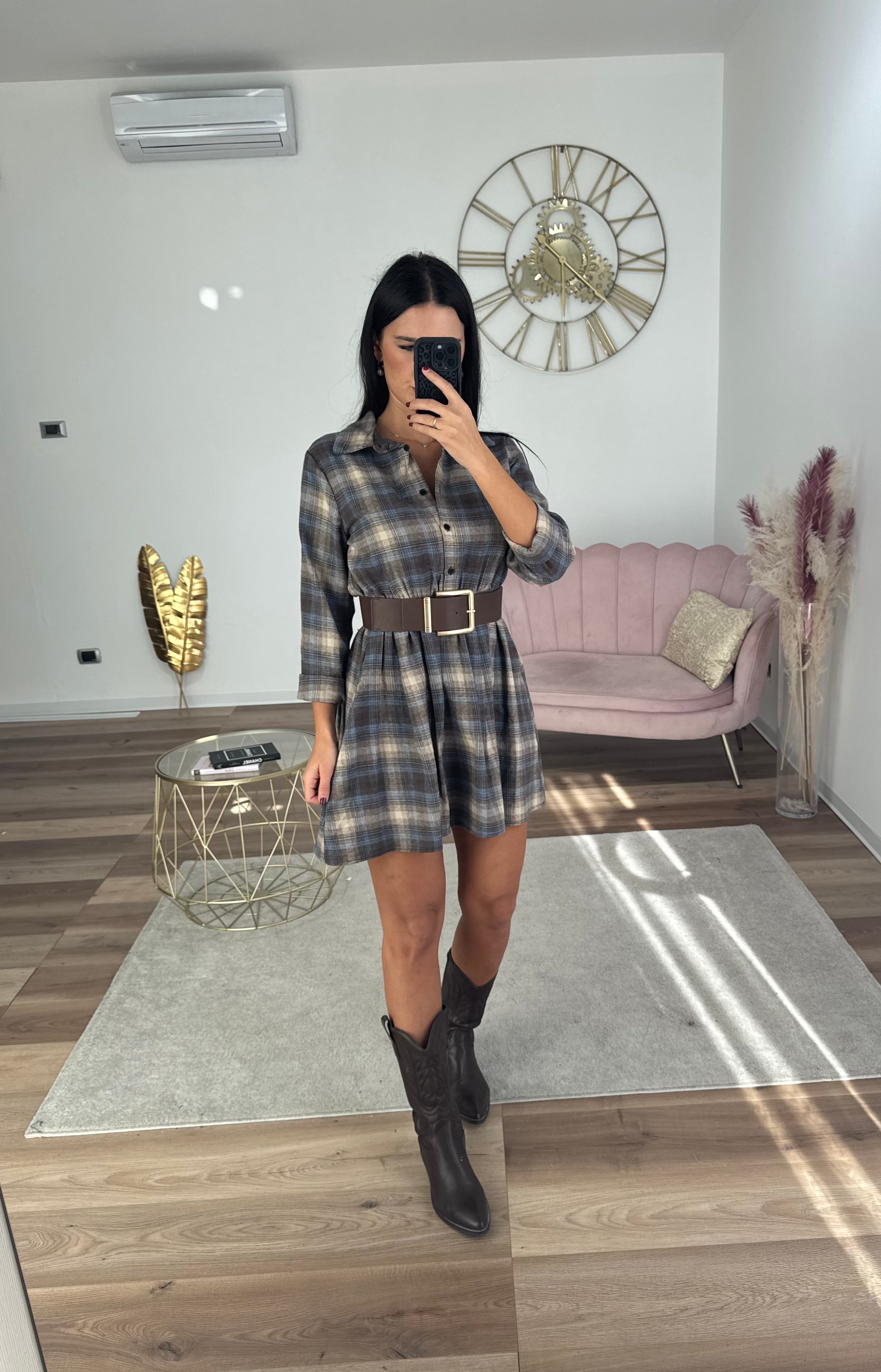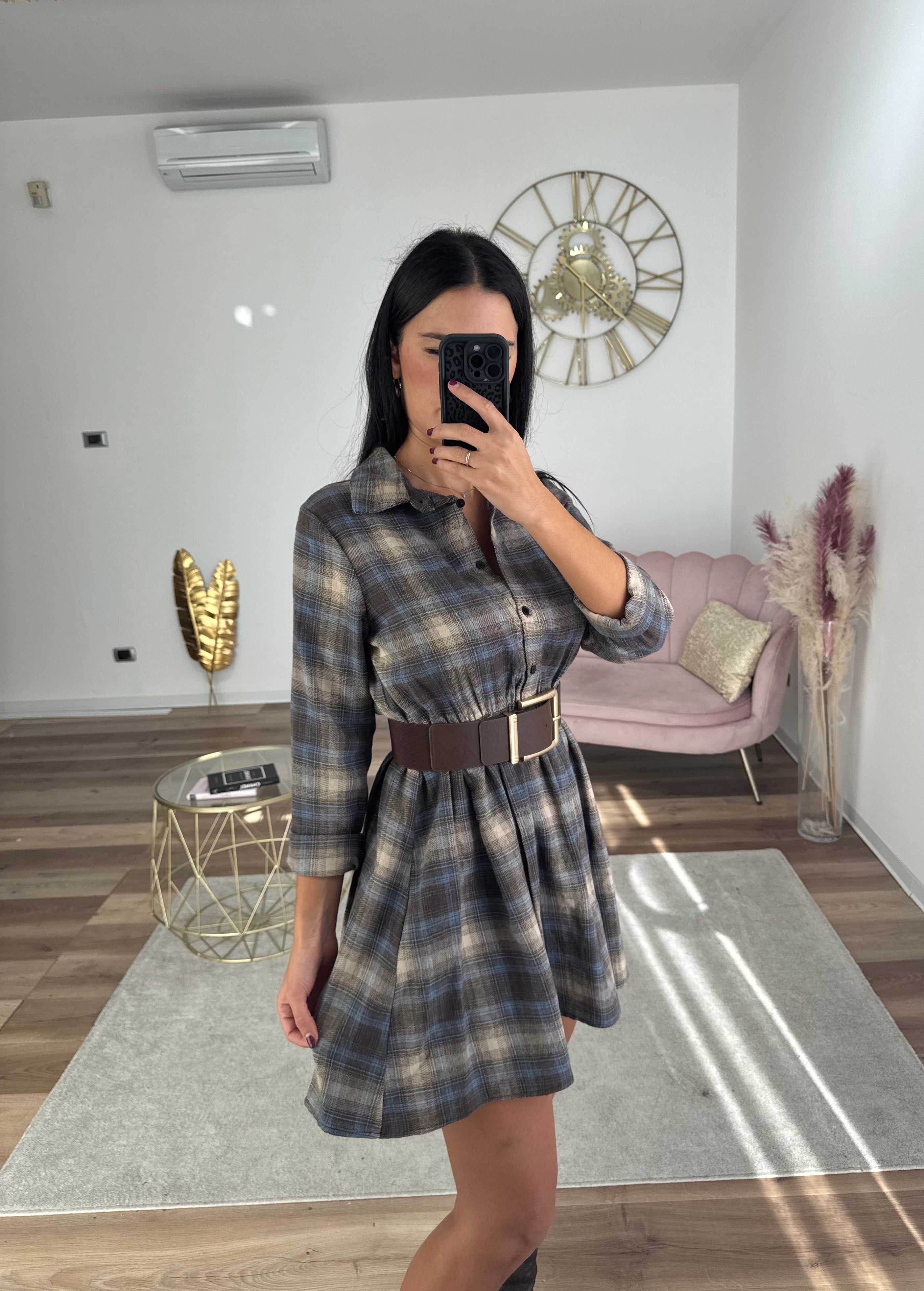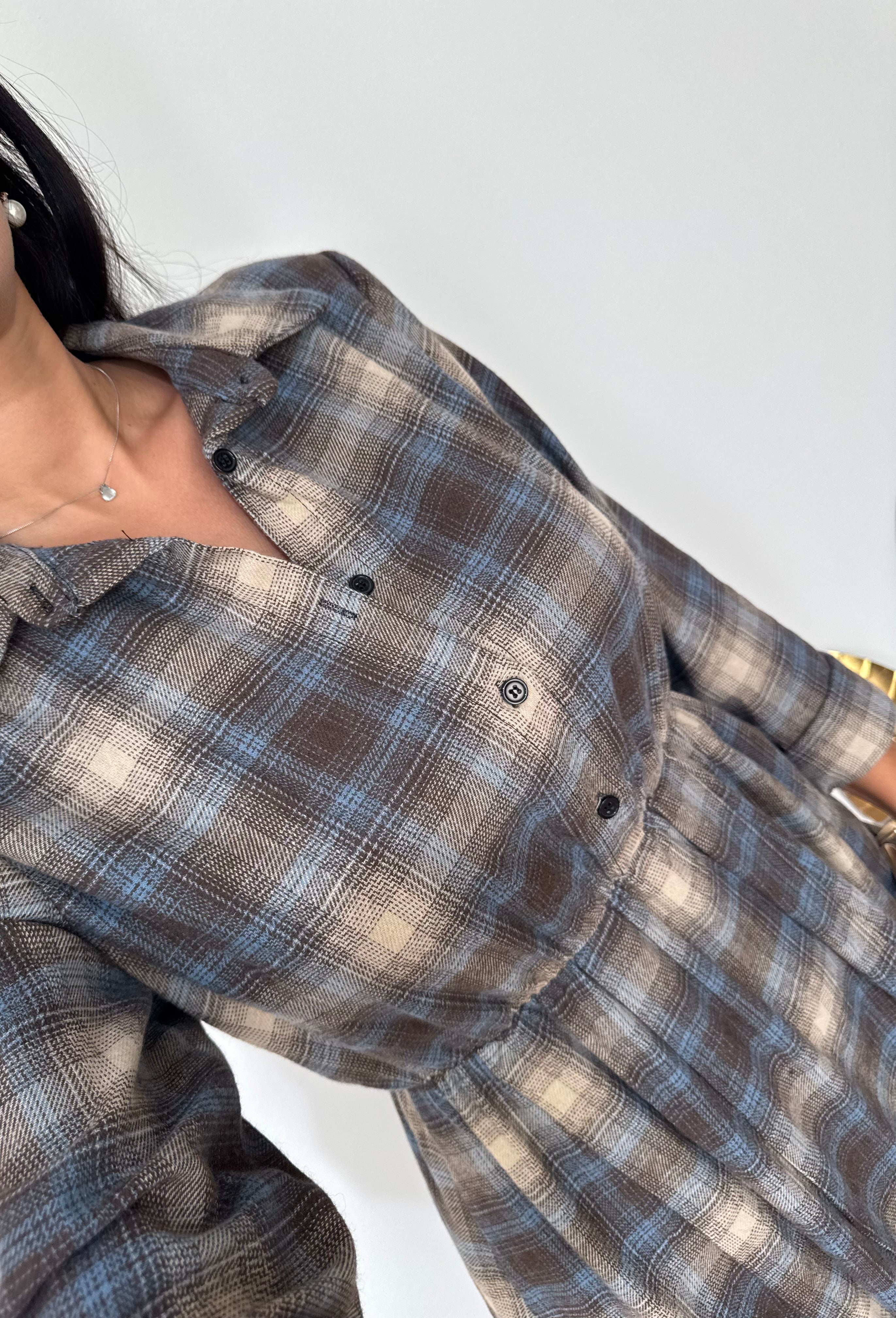 Abito in cotone flanellato, colletto a camicia, bottoncini sul davanti che arrivano sopra all'ombelico, con tasca davanti, scende morbido, scende morbido, vita elastica.