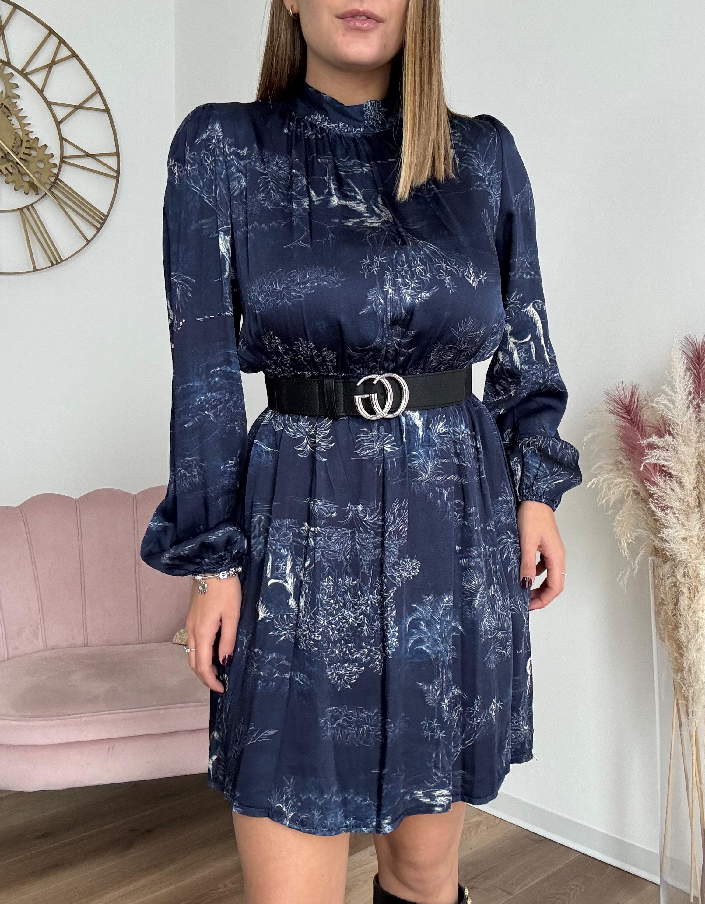 Abito accollato in satin, si chiude al collo con fiocco, maniche a sbuffo, la vita è elastica.