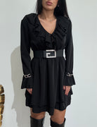 Abito corto con dettagli argento cuciti nelle maniche, lacceto e rouge nello scollo, maniche a sbuffo, vita elastica
