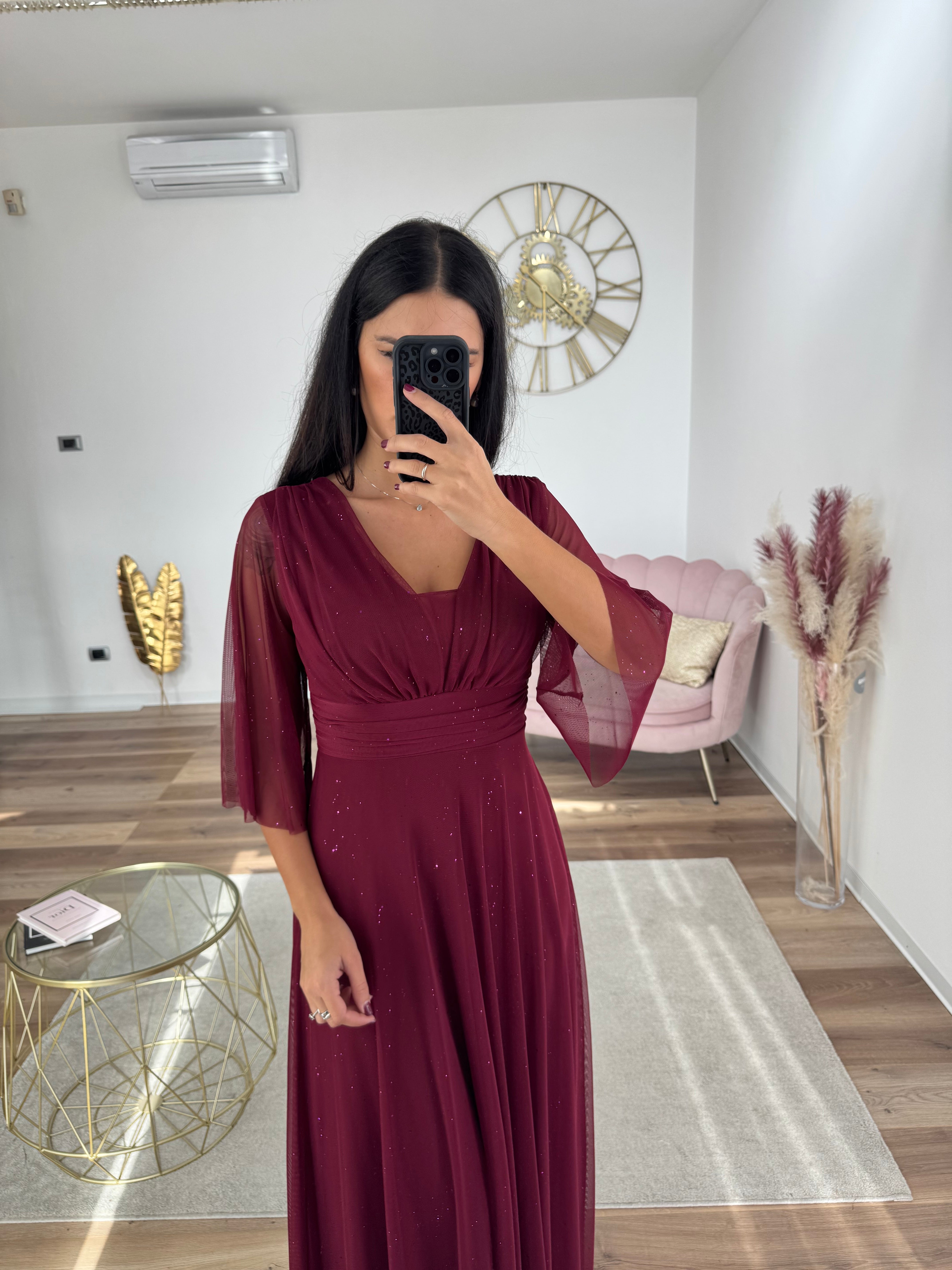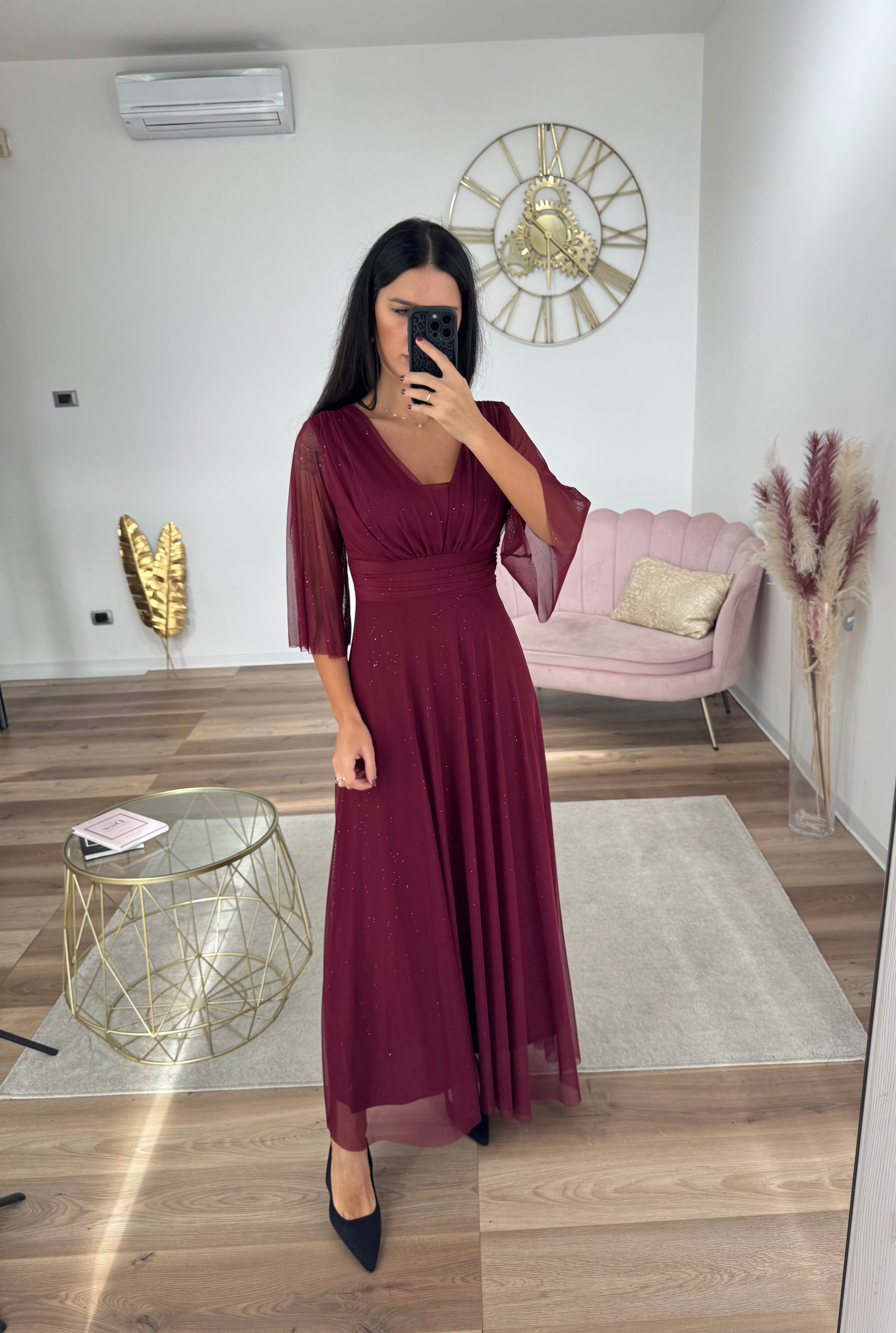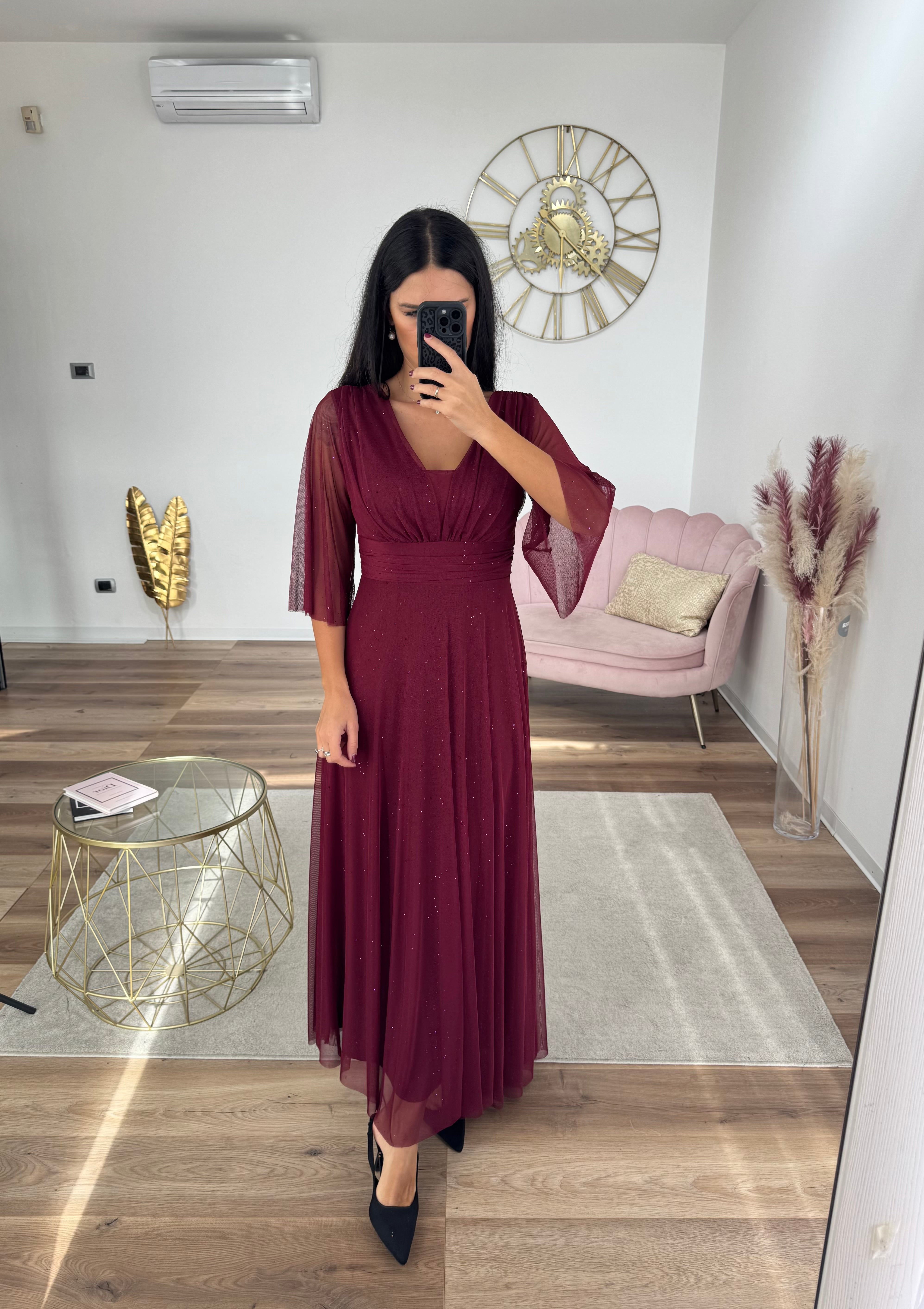 Abito elegante in tulle impreziosito da strass, maniche a 3/4, con coppe preformate, vita elastica