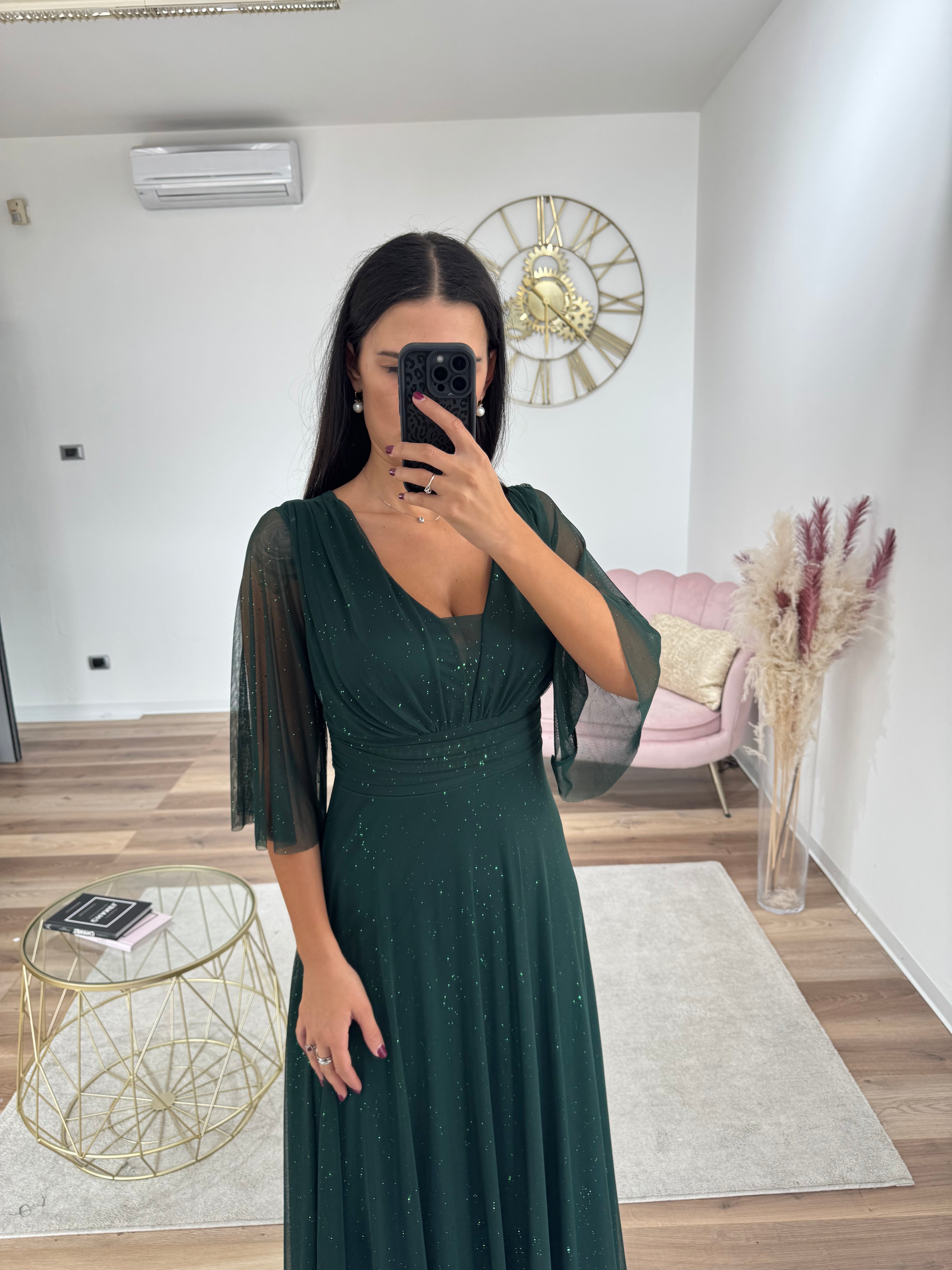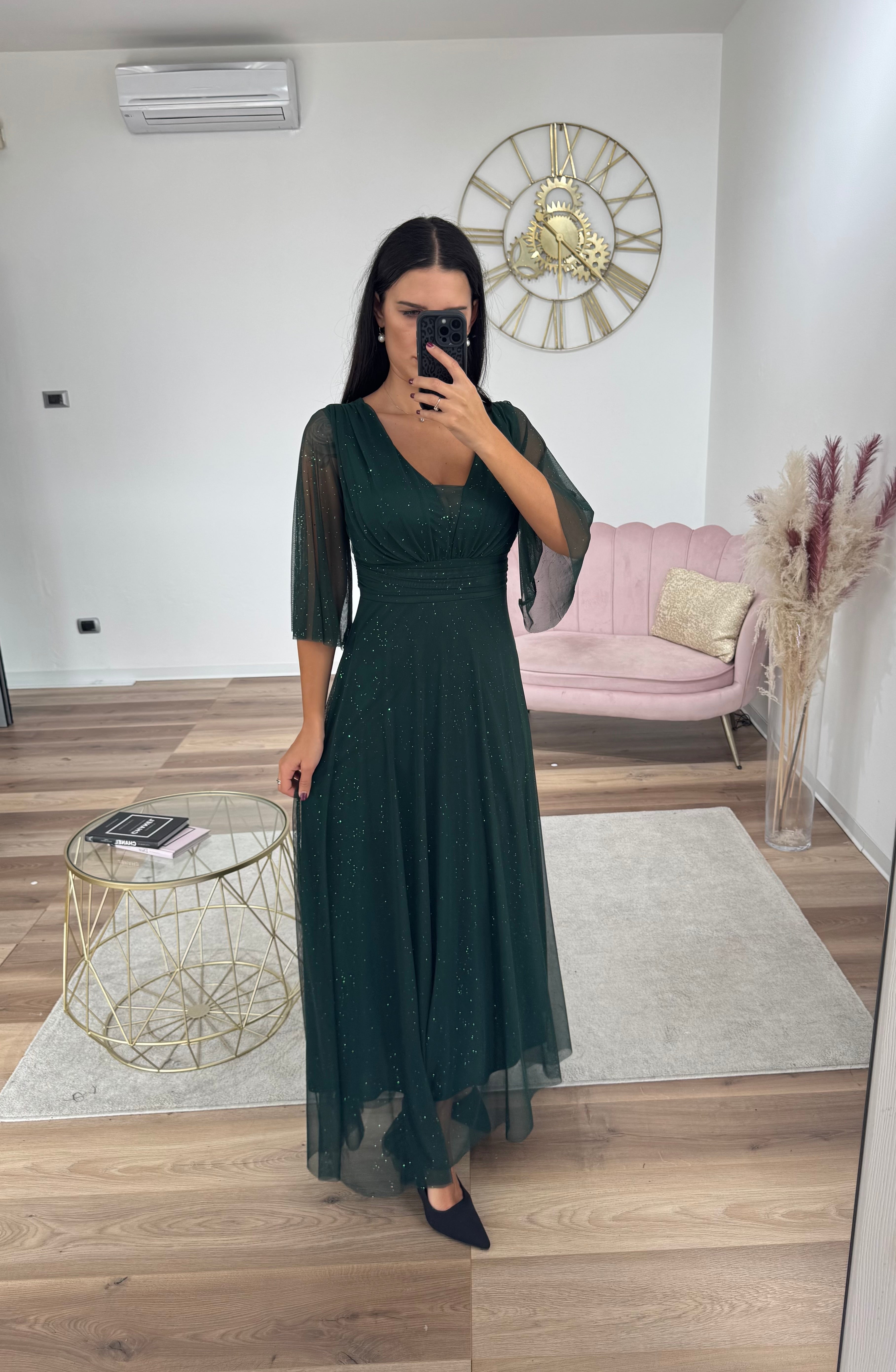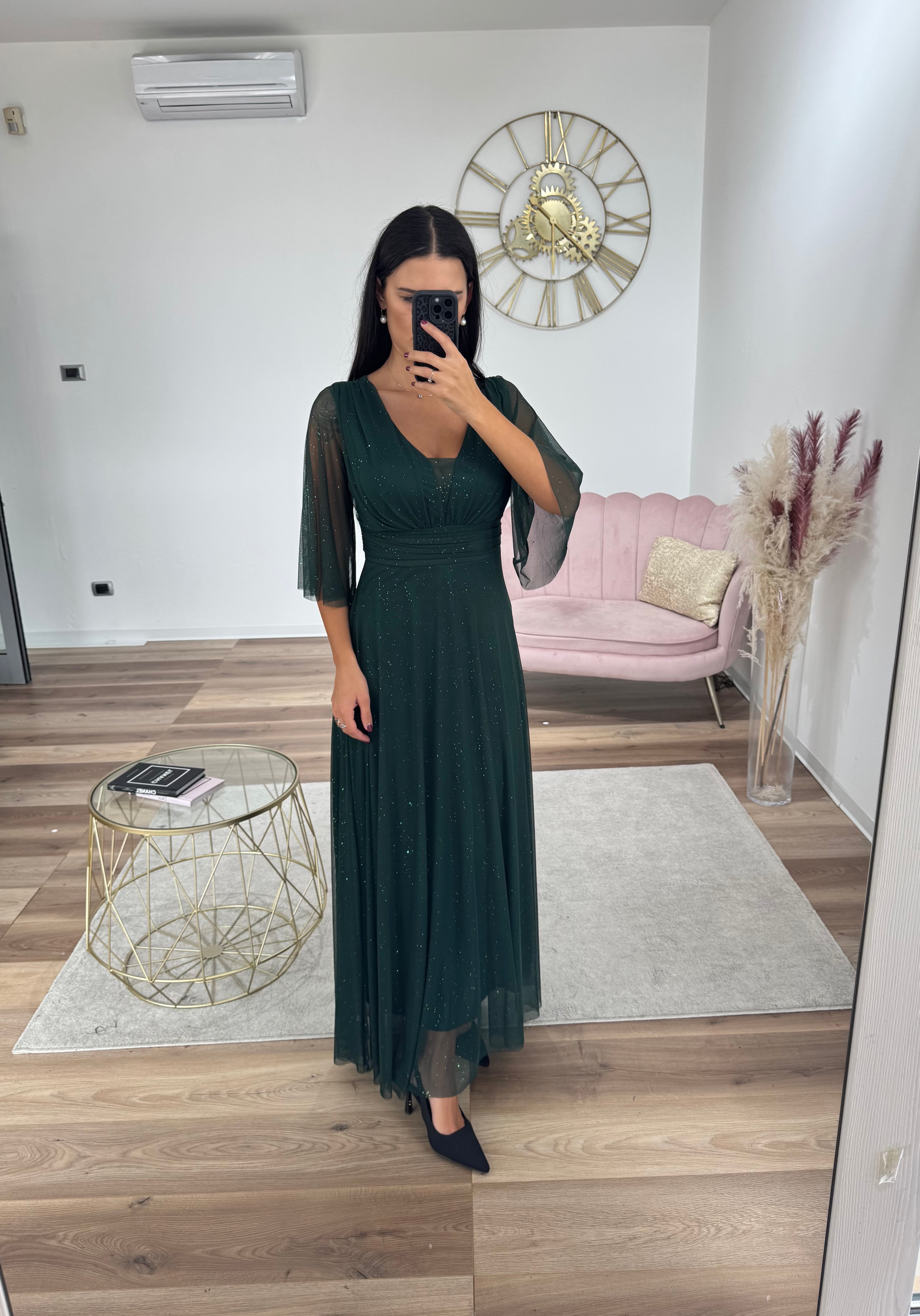 Abito elegante in tulle impreziosito da strass, maniche a 3/4, con coppe preformate, vita elastica