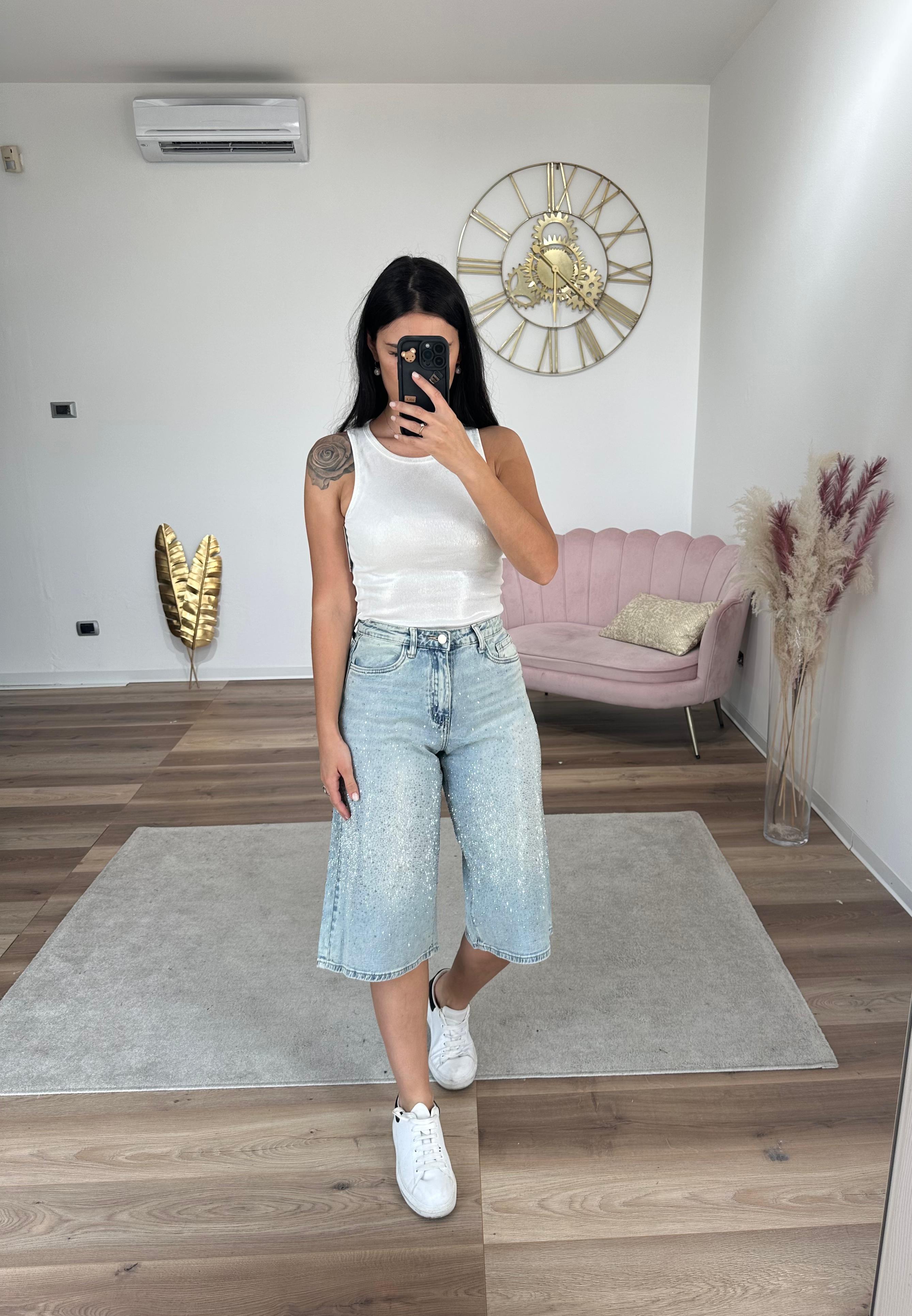 Bermuda in denim ricoperto di strass, vestibilità regolare, vita alta.