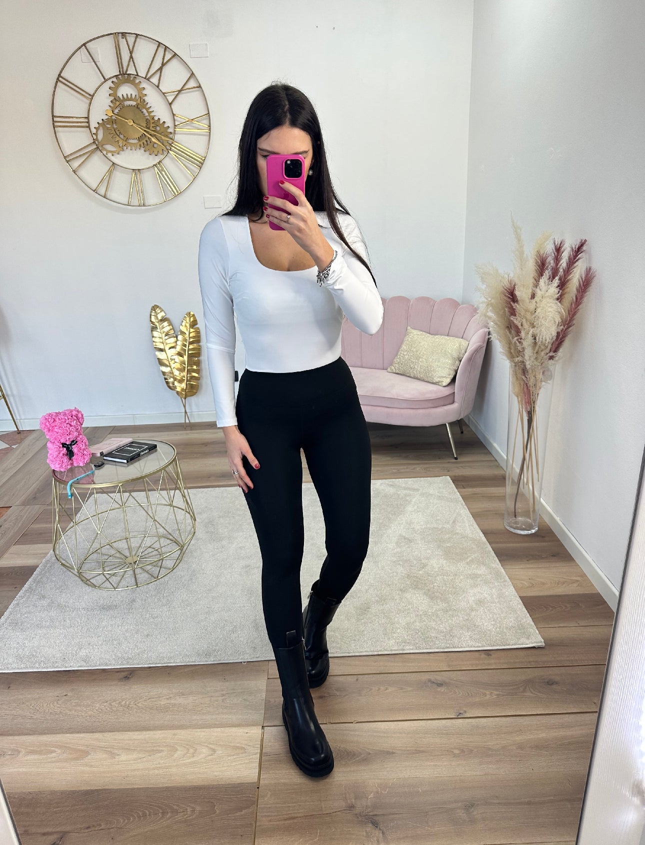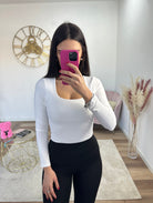 Body elasticizzato a manica lunga, tessuto più leggero rispetto al body scollo tondo.