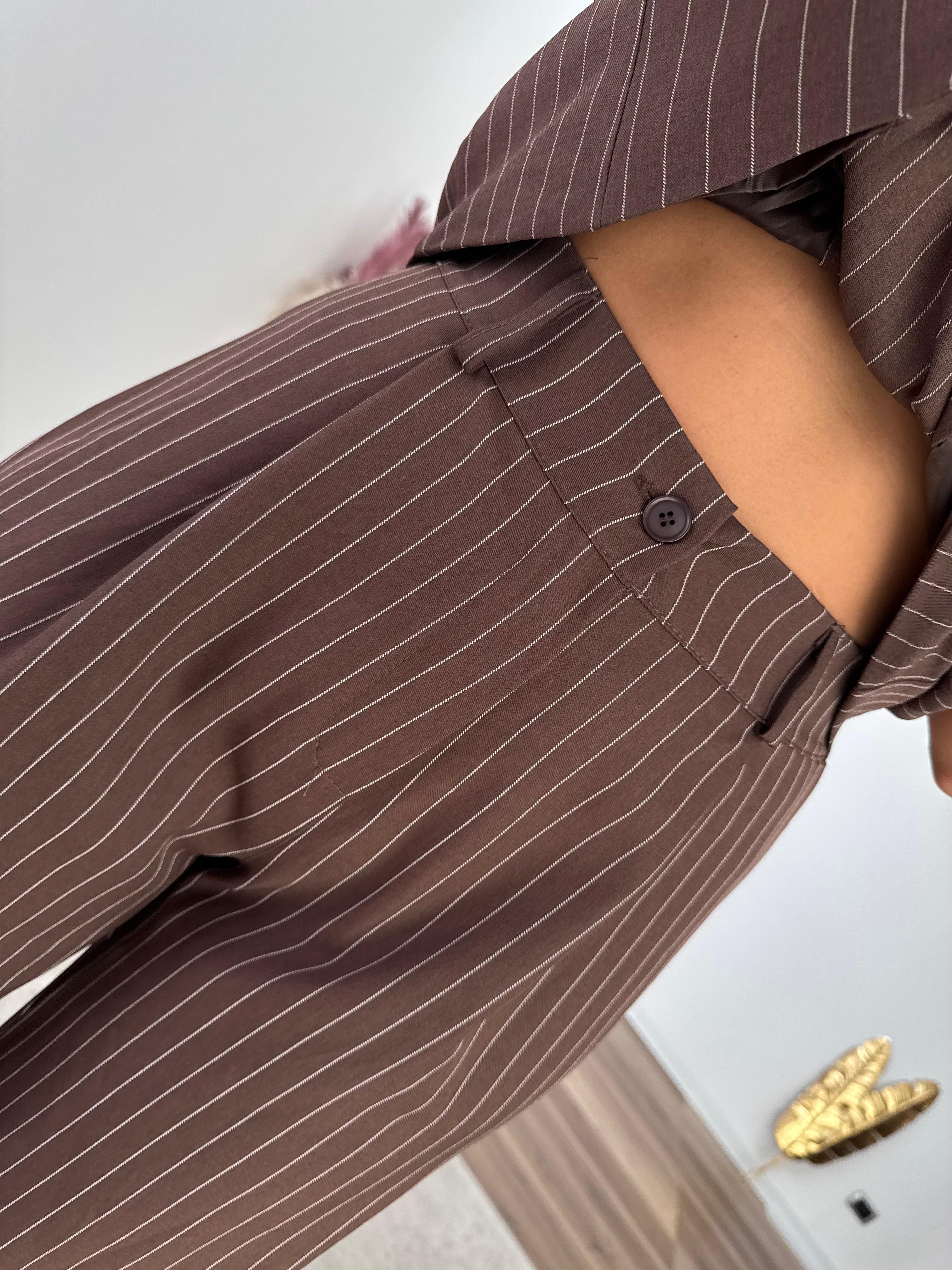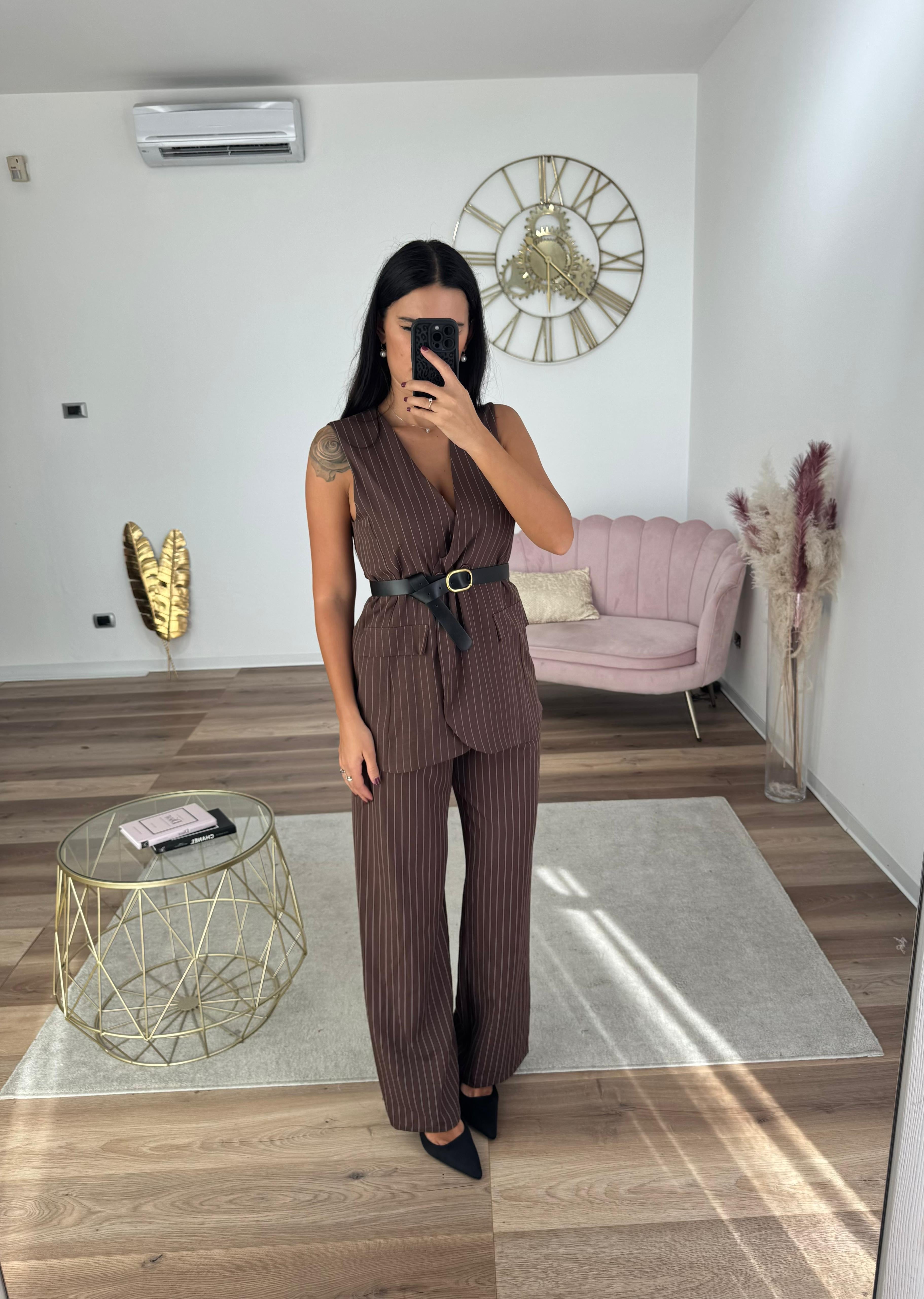 Coordinato gessato completo di pantalone a palazzo e smanicato lungo, foderato internamente e completo di cintura. Il pantalone ha la vita elastica e non ha le tasche